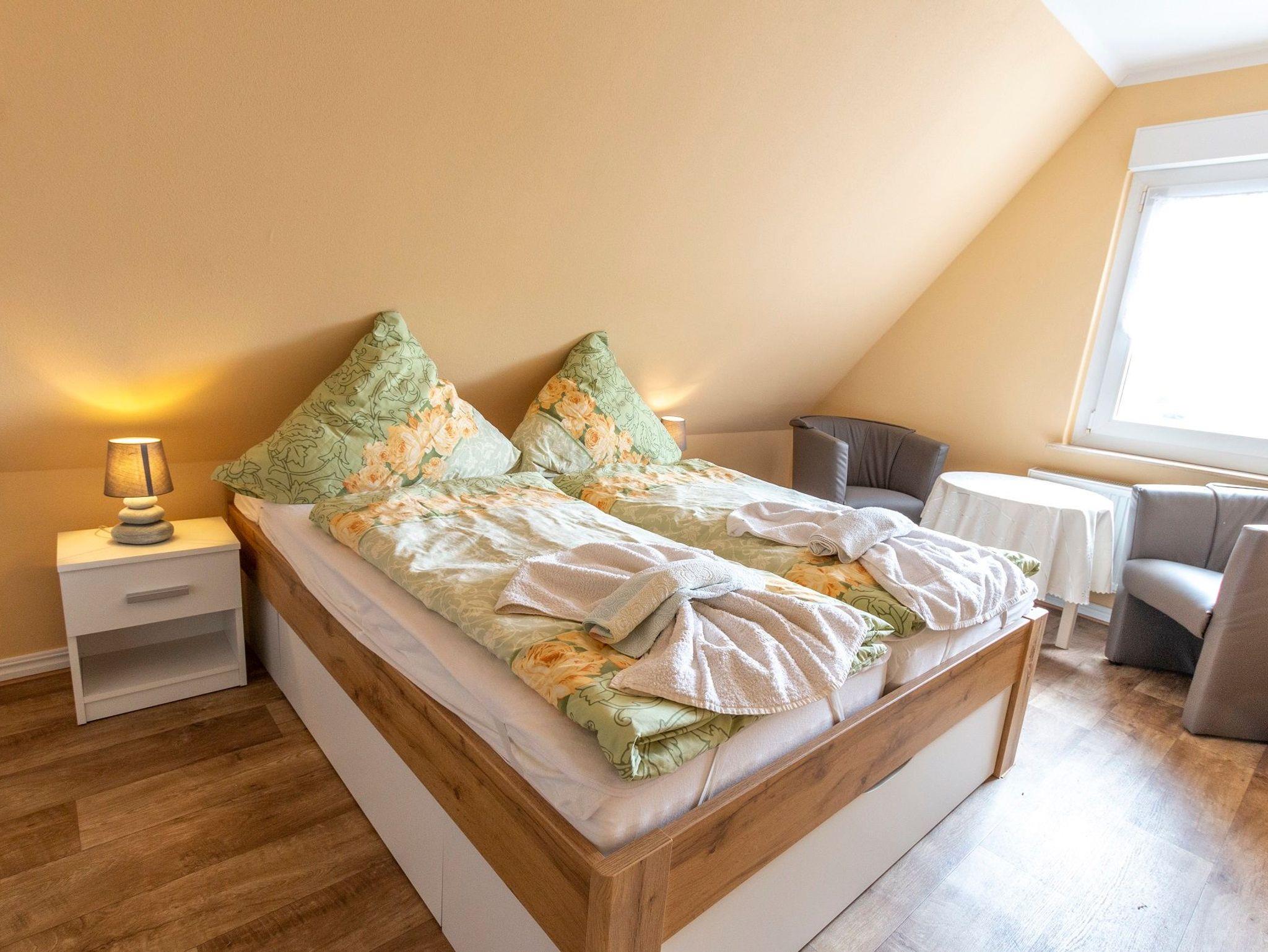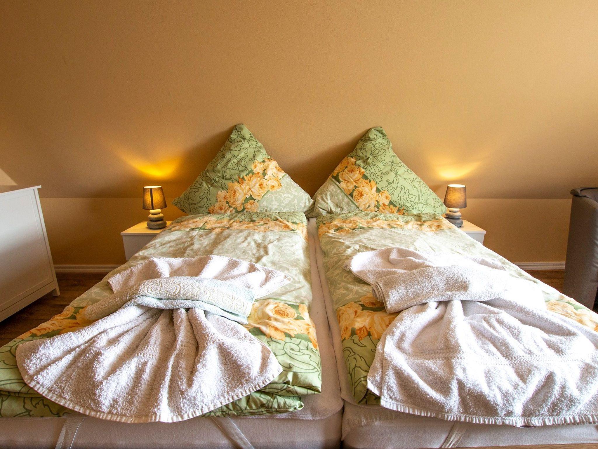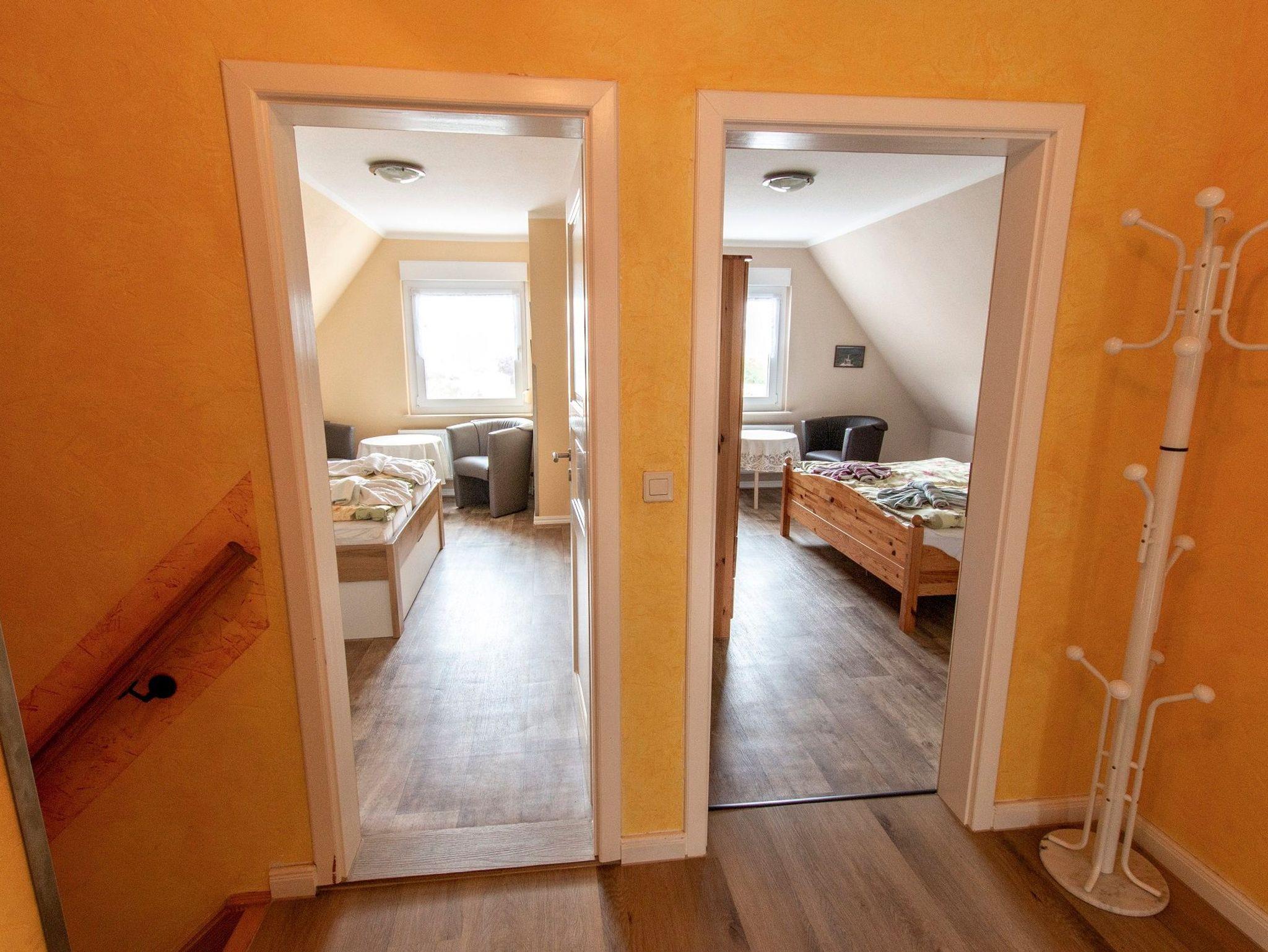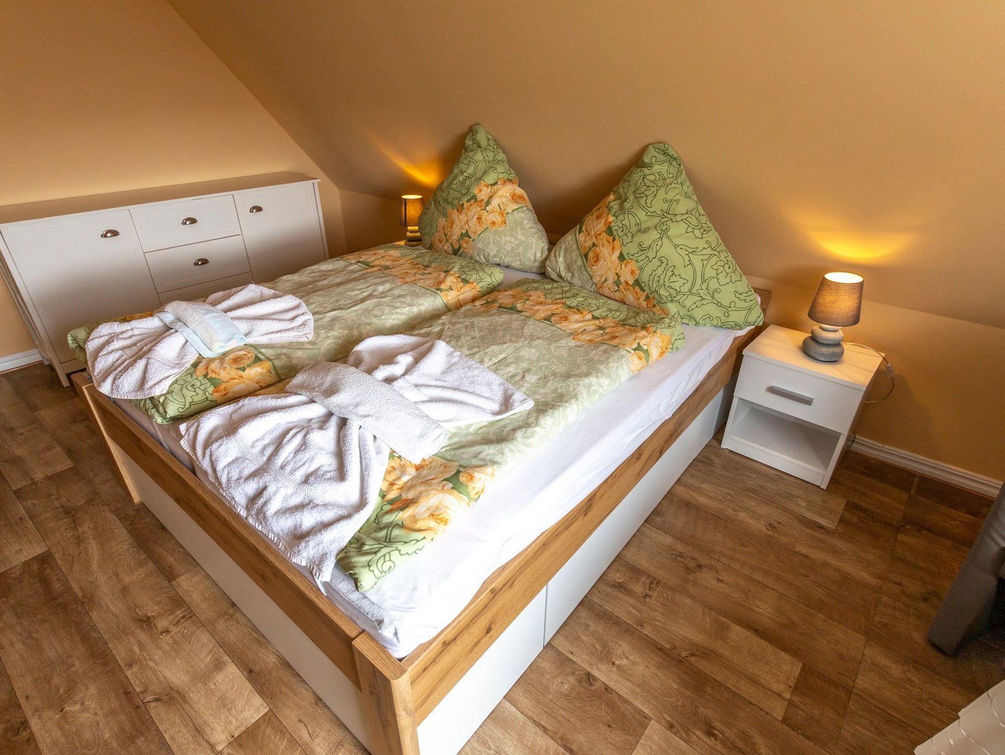 Die gemütlich eingerichtete Ferienwohnung von 70 qm befindet sich in der ersten Etage unseres Einfamilienhauses und bildet eine abgeschlossene Einheit. Die Wohnung erreichen Sie über den Flur und eine Treppe. Sie verfügt über einen Wohnraum mit TV und Küchenzeile mit Mikrowelle. Die zwei separaten Schlafräume sind jeweils ausgestattet mit einem Doppelbett. Eine Dusche/WC ist vorhanden, Handtücher und Bettwäsche stellt der Vermieter Ihnen gegen eine Gebühr zur Verfügung, ein PKW-Stellplatz ist am Haus. Für die kleinen Gäste kann ein Kinderbettchen gestellt werden.