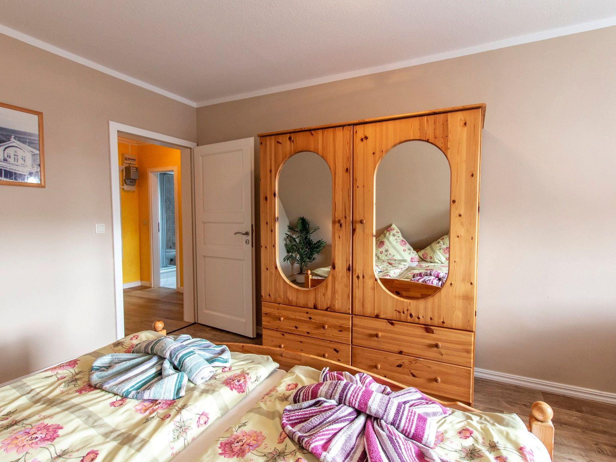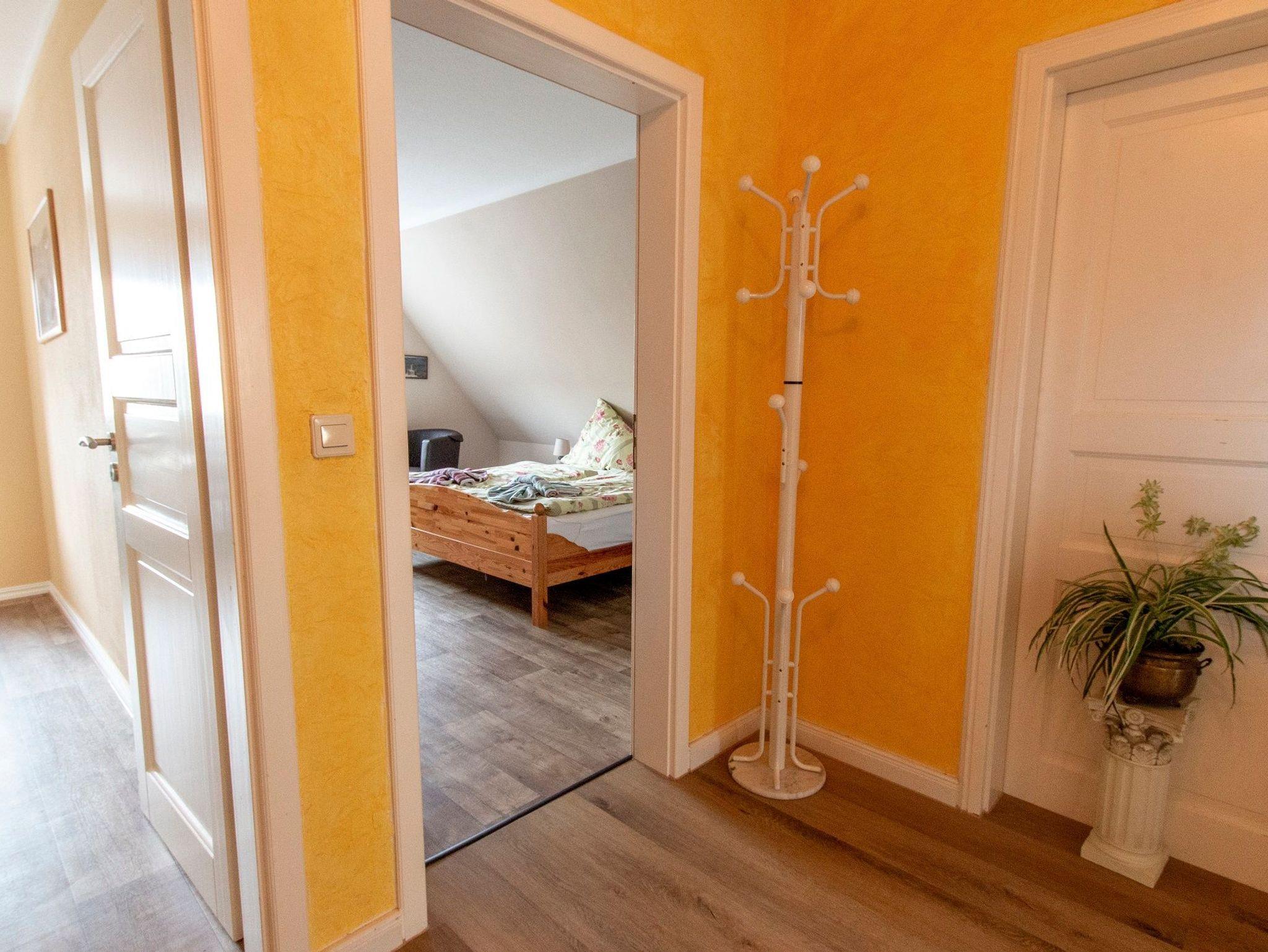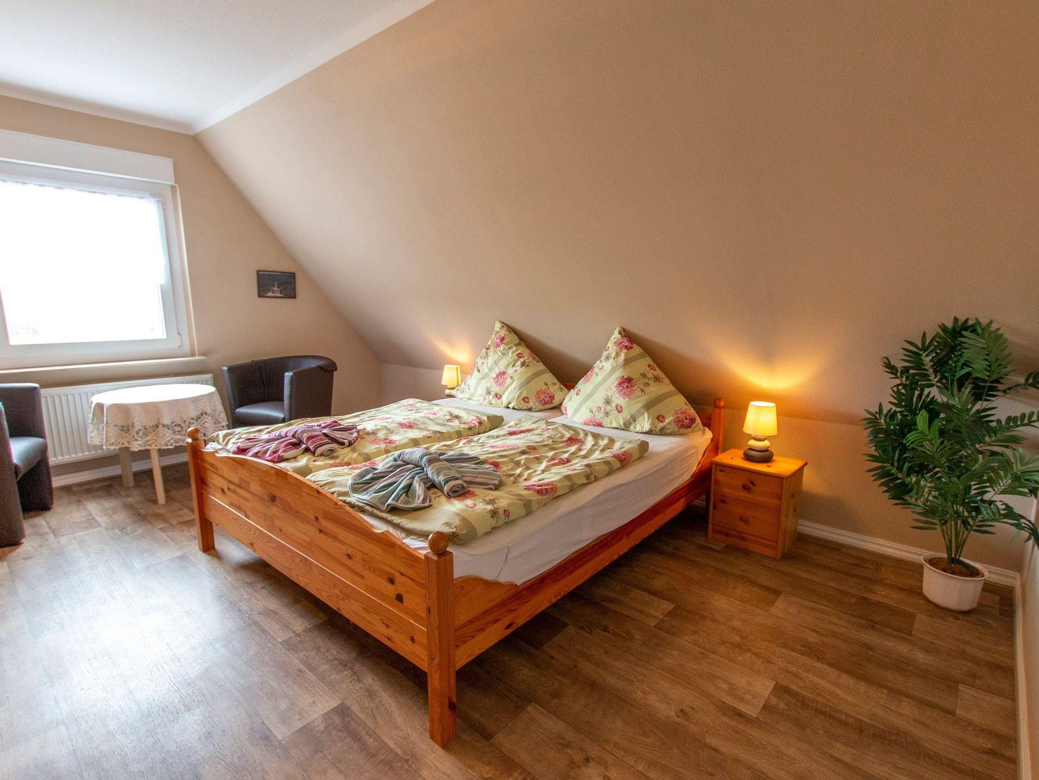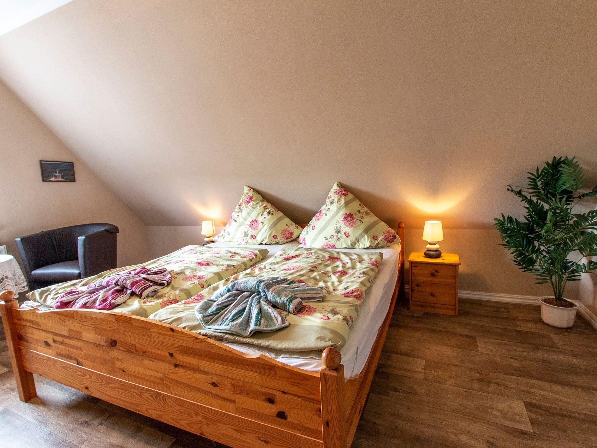 Die gemütlich eingerichtete Ferienwohnung von 70 qm befindet sich in der ersten Etage unseres Einfamilienhauses und bildet eine abgeschlossene Einheit. Die Wohnung erreichen Sie über den Flur und eine Treppe. Sie verfügt über einen Wohnraum mit TV und Küchenzeile mit Mikrowelle. Die zwei separaten Schlafräume sind jeweils ausgestattet mit einem Doppelbett. Eine Dusche/WC ist vorhanden, Handtücher und Bettwäsche stellt der Vermieter Ihnen gegen eine Gebühr zur Verfügung, ein PKW-Stellplatz ist am Haus. Für die kleinen Gäste kann ein Kinderbettchen gestellt werden.