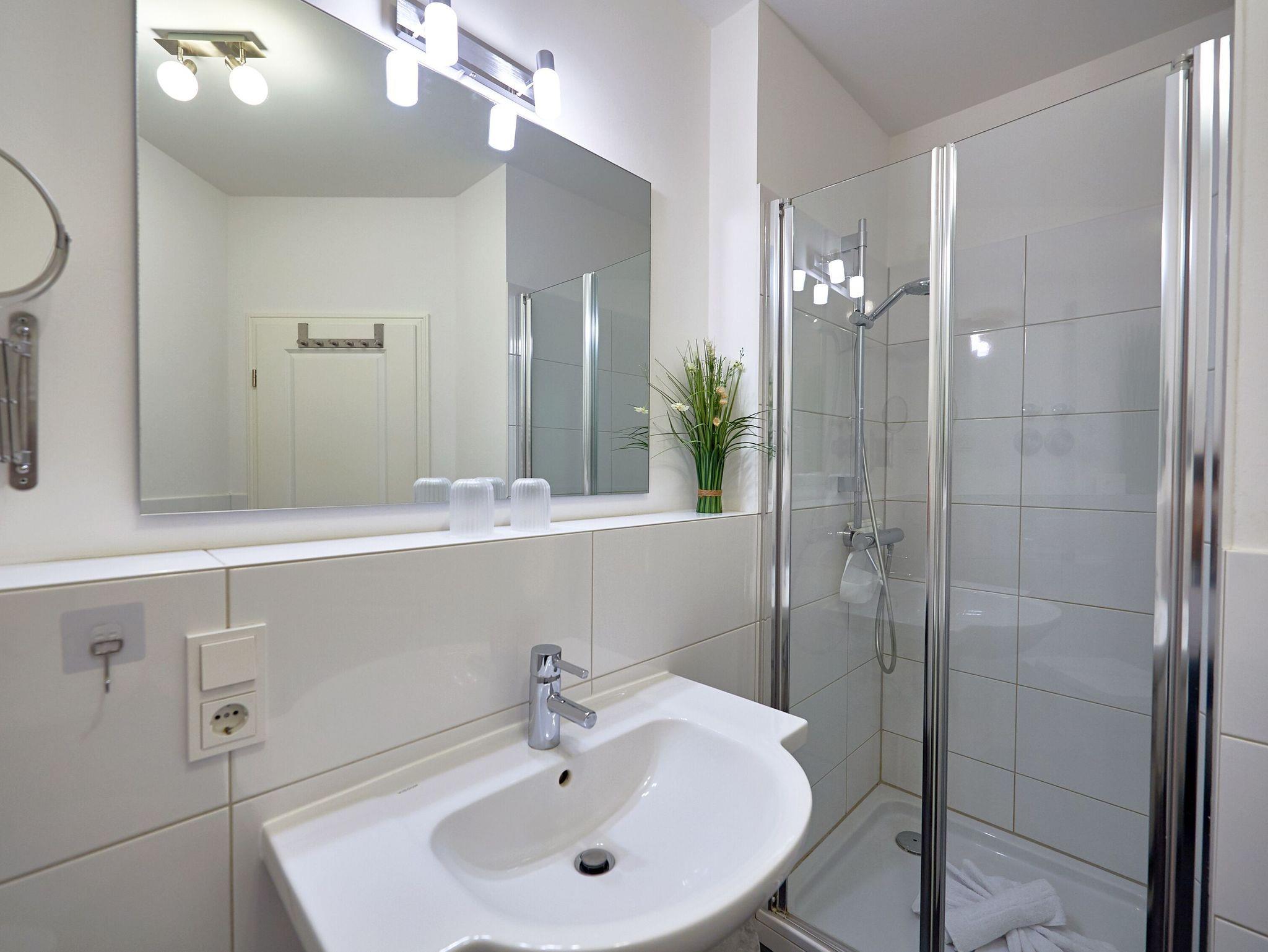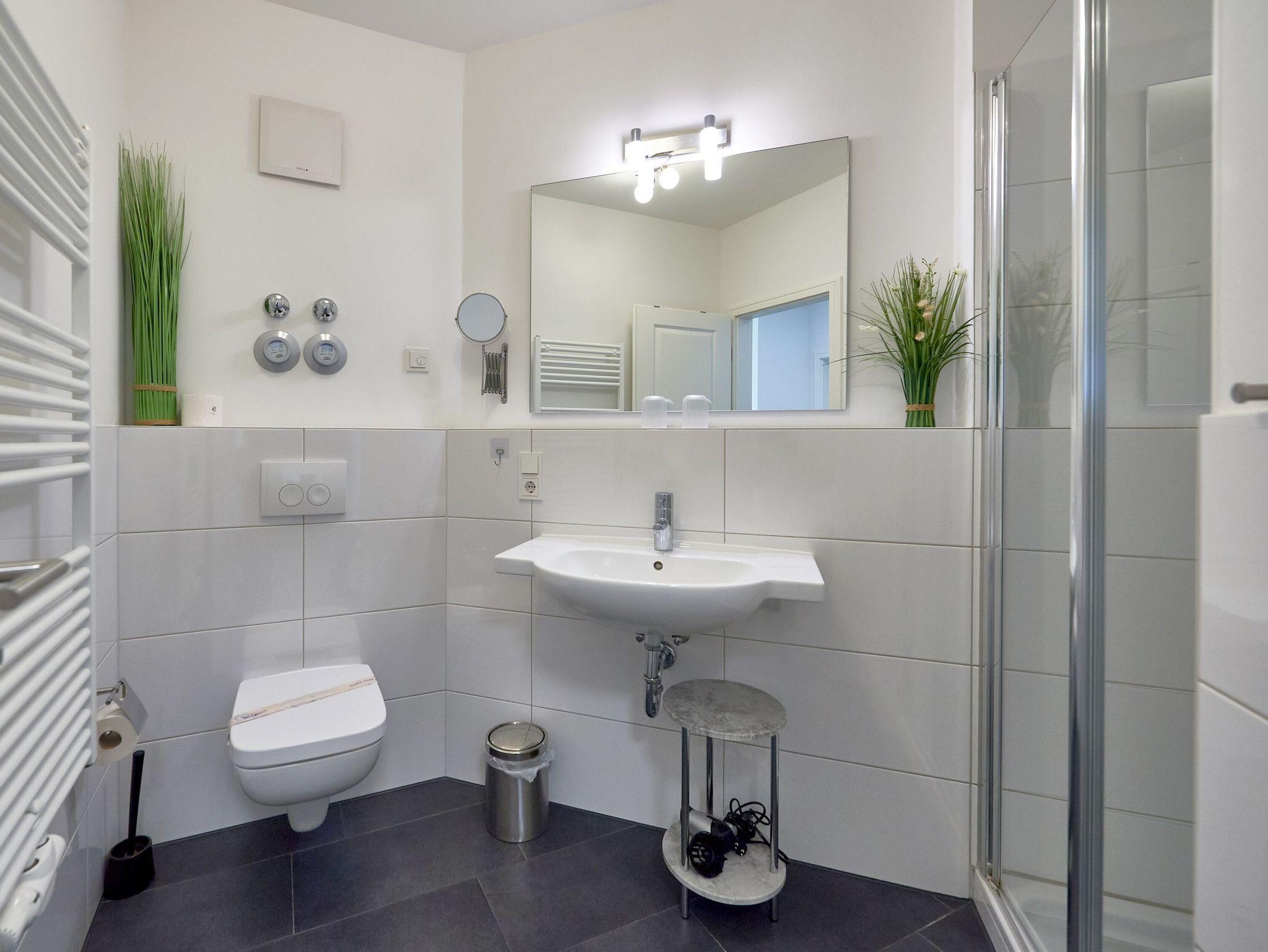 Das Appartement verfügt über ein großzügiges modernes Duschbad mit WC, beleuchtetem Waschtisch, Handtuchwärmer und Fön.