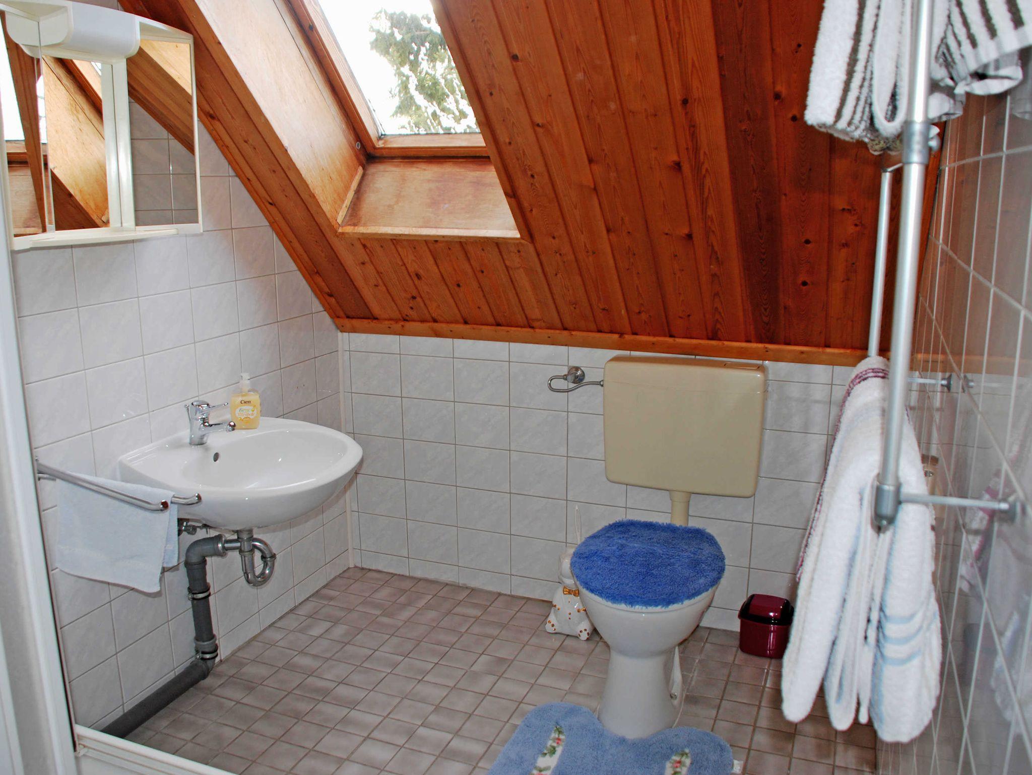 Das moderne Bad ist mit Dusche, WC und Waschtisch ausgestattet und verfügt über Tageslicht.