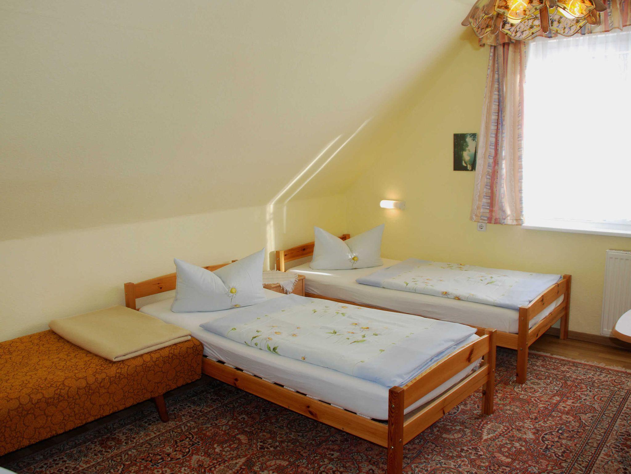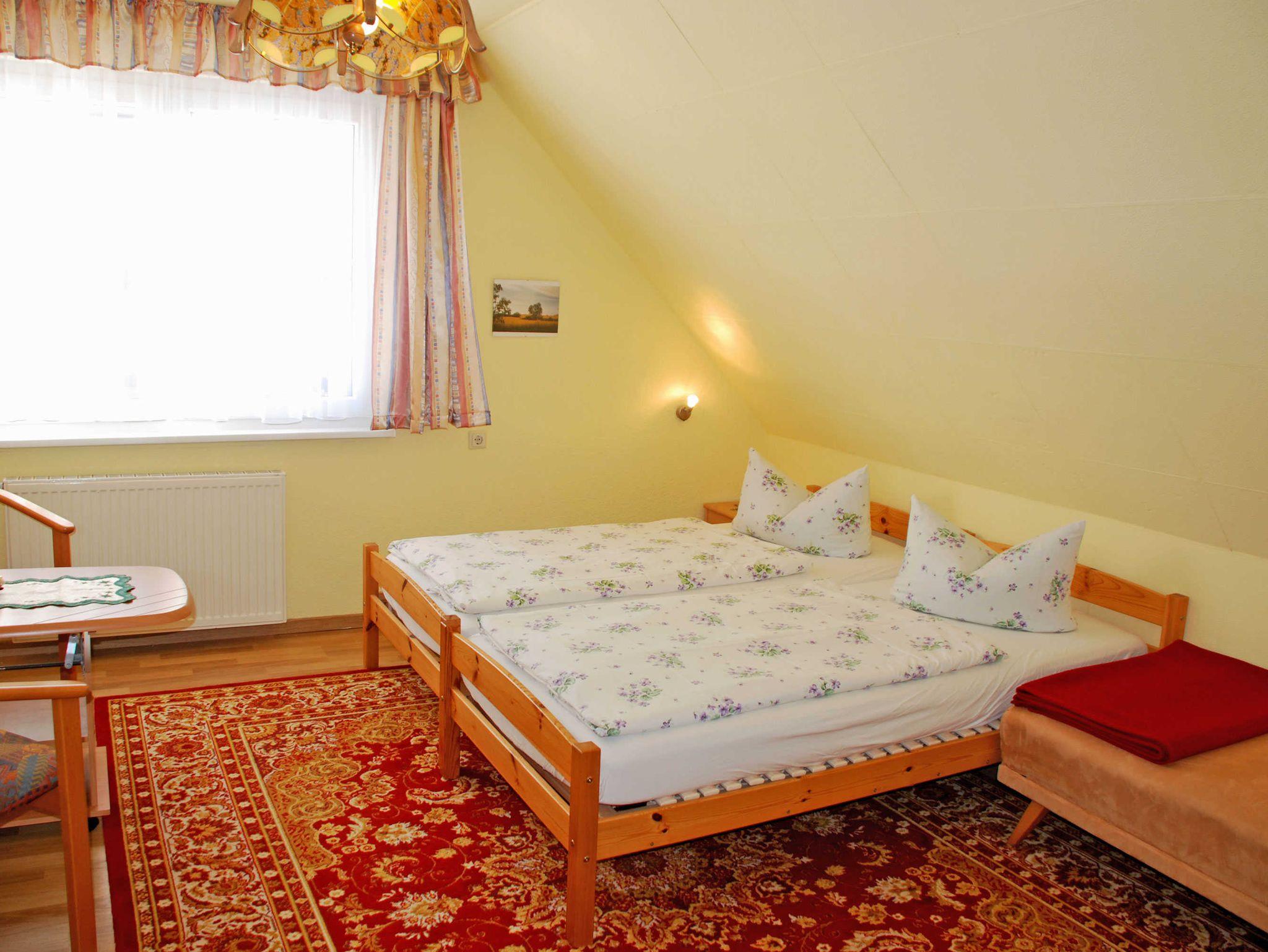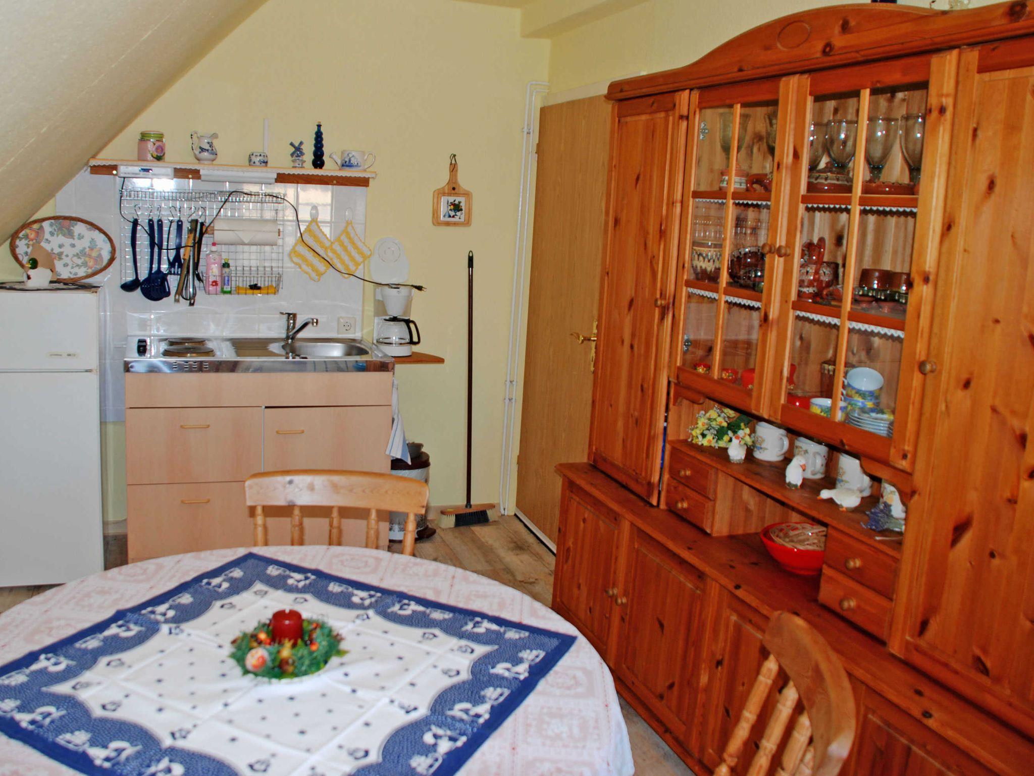 Die Ferienwohnung Christine liegt im Obergeschoss eines Wohnhauses und ist über eine Treppe im Flur separat erreichbar. Sie ist ca. 53 qm groß, hat Platz für maximal 6 Gäste liebevoll eingerichtet. Im Wohnraum, der sich in der offenen Galerie im Obergeschoss befindet, stehen eine bequeme Sitzcouch mit Tisch und ein TV-Gerät. Die searate Küche ist mit einem kleinen Herd, Mikrowelle, Wasserkocher, Kaffeemaschine, Toaster und Kühlschrank ausgestattet. Hier steht auch ein Esstisch mit Stühlen.