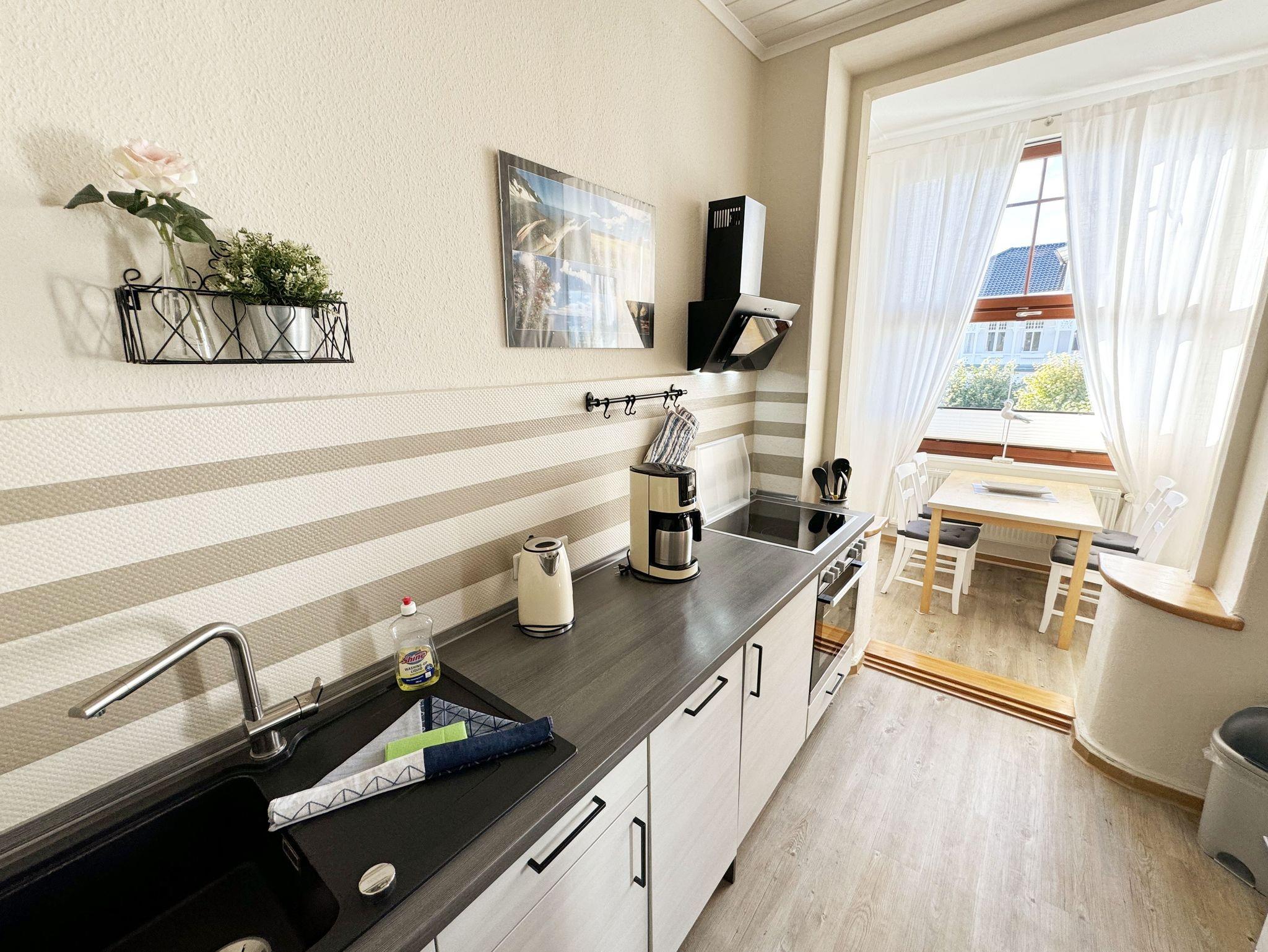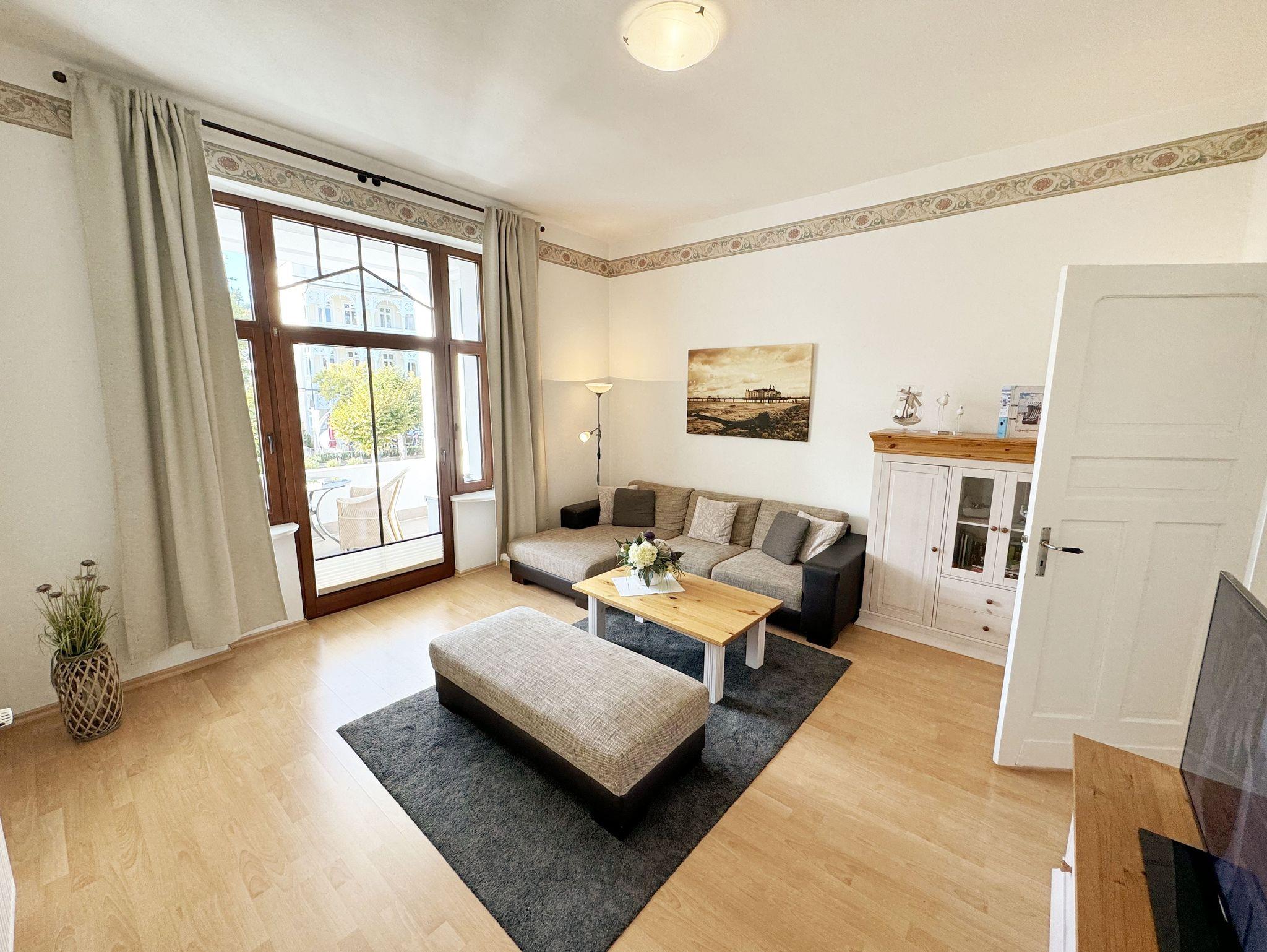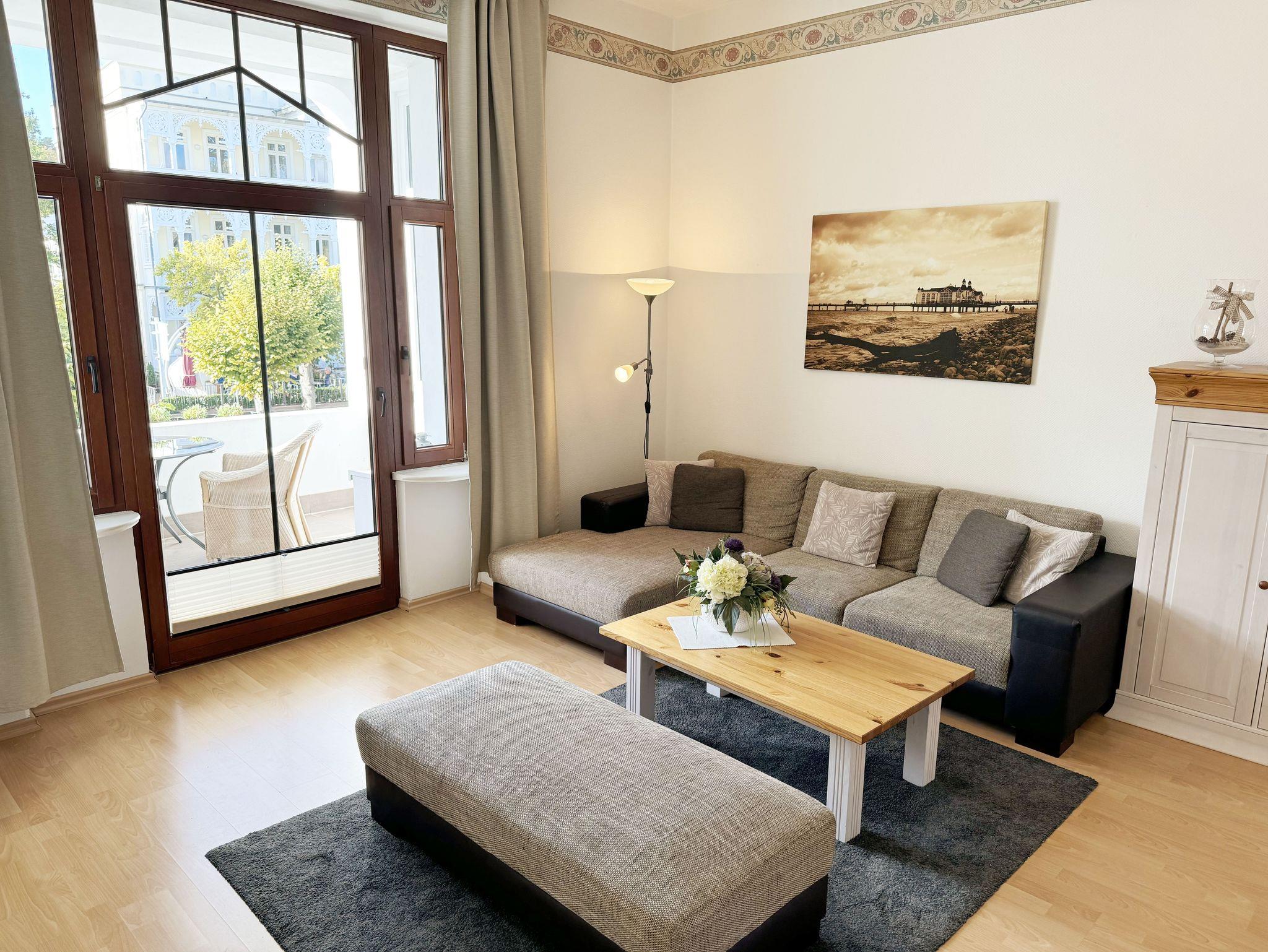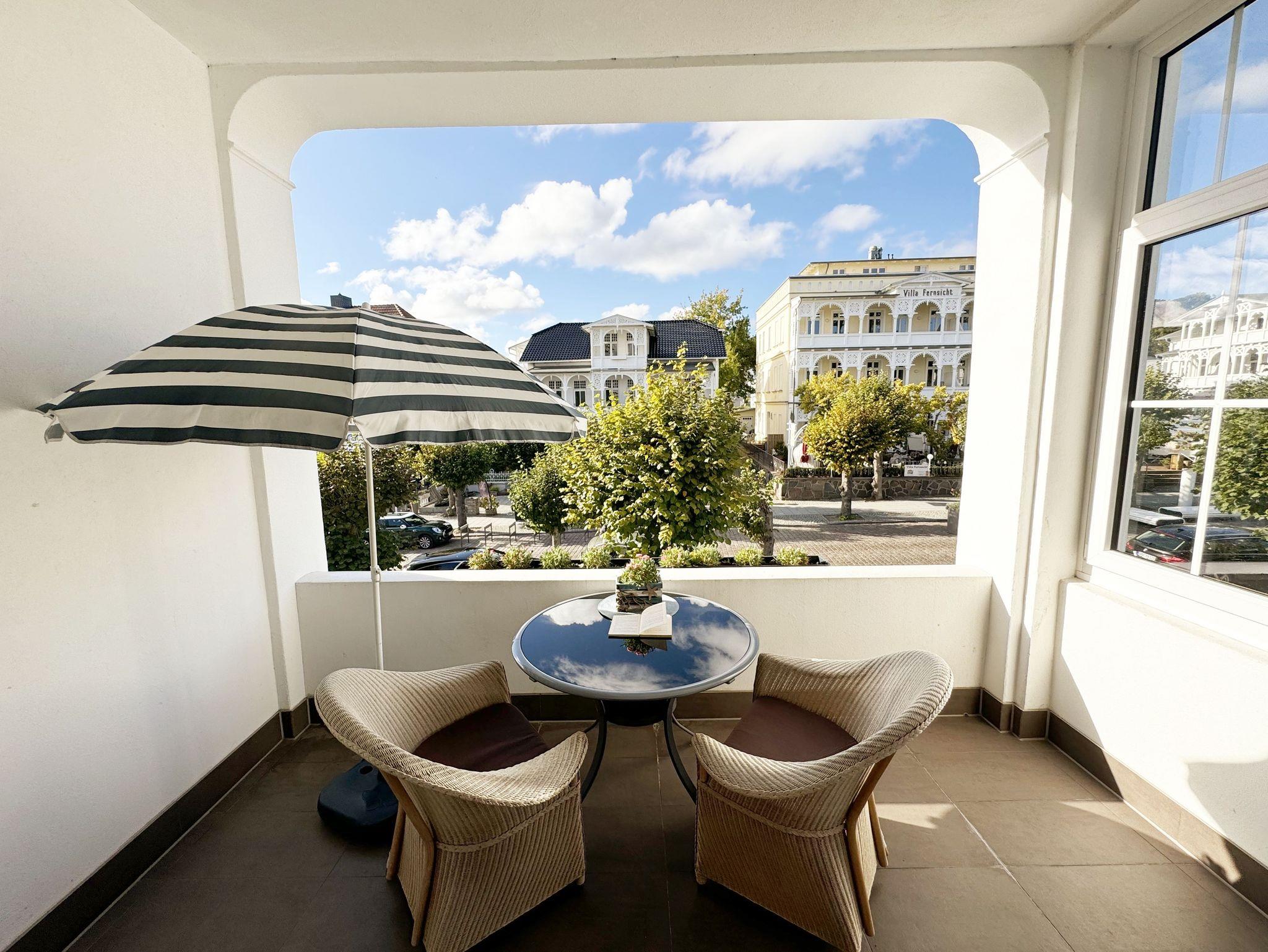 Charmante Ferienwohnung mit Balkon und Blick auf die Bäderarchitektur in Sellin auf Rügen.