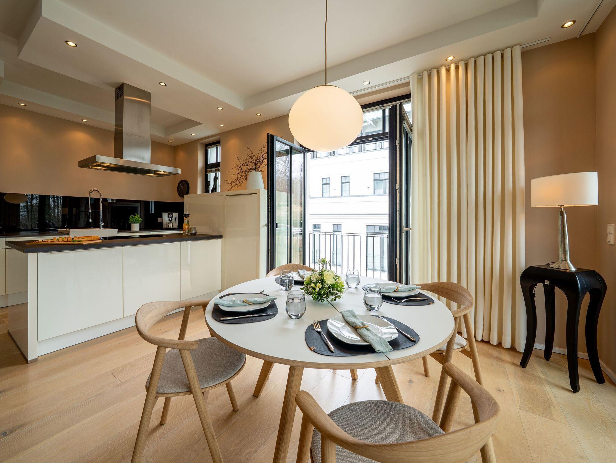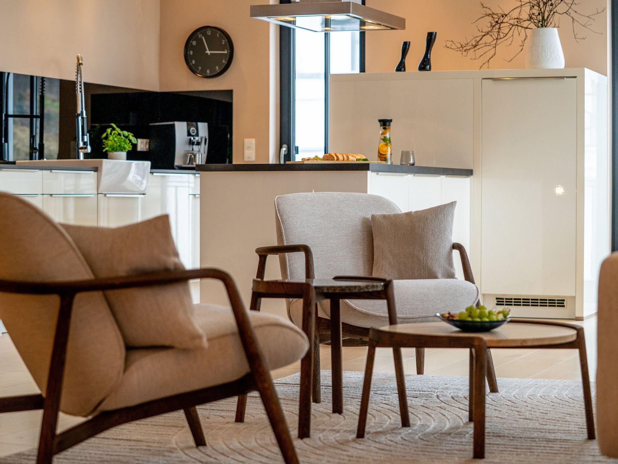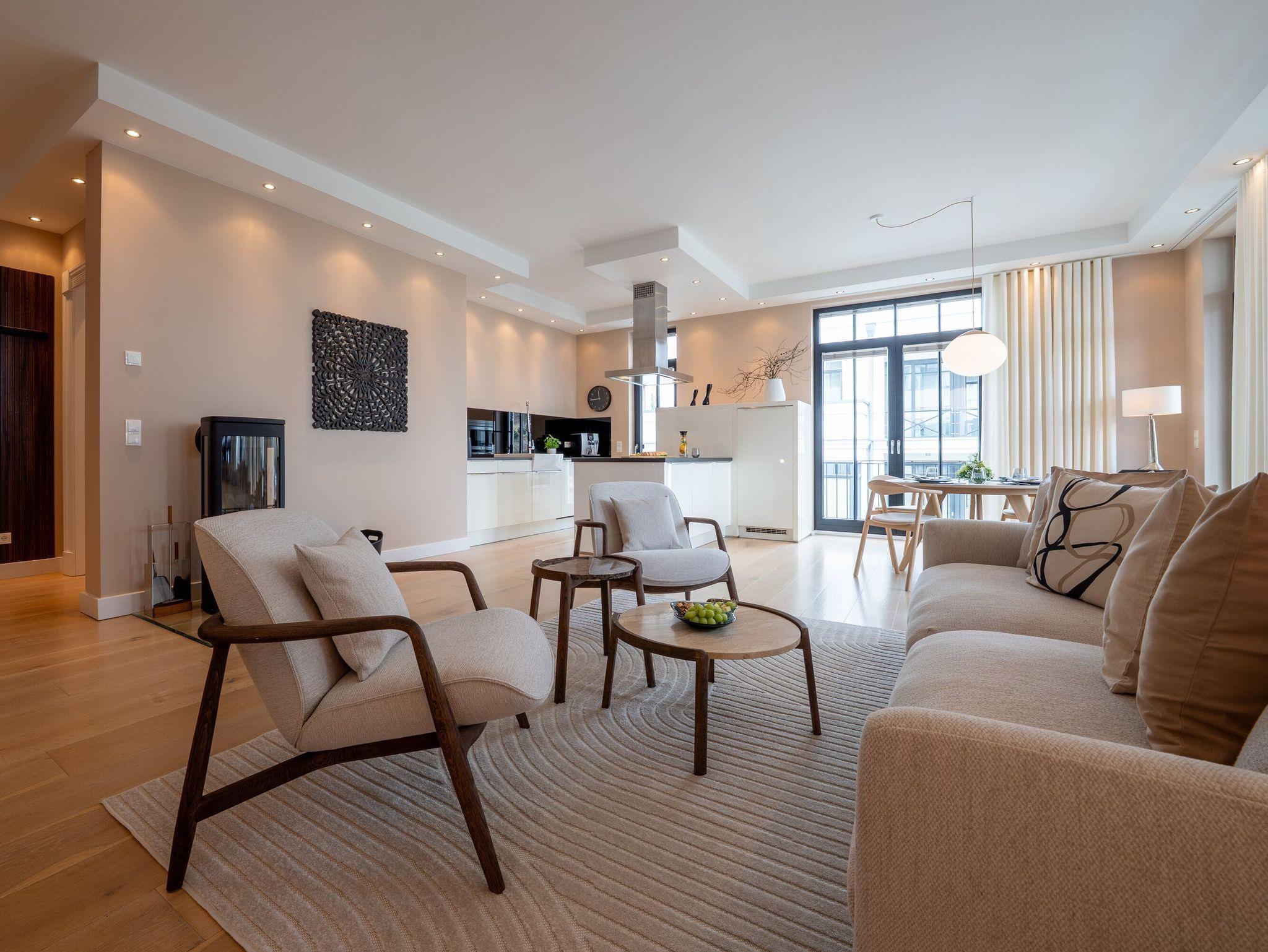 Das 111 m² große Appartement liegt im dritten Stock der Villa Philine und ist auch über einen Fahrstuhl zu erreichen. Vom Eingangsbereich aus betreten Sie den großzügigen Wohnraum mit Koch-, Ess- und Relaxbereich, der Ihnen entspannte Stunden auf der bequemen freistehenden Couch oder auch anregende Gespräche am runden Esstisch ermöglicht. An kühleren Tagen sorgt das prasselnde Feuer des Kaminofens für behagliche Stimmung.