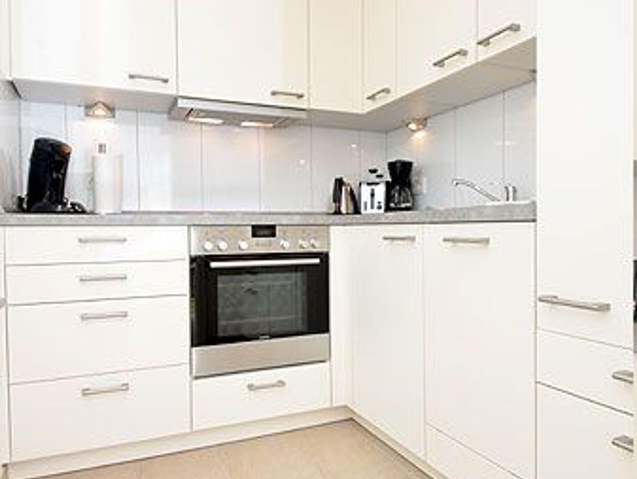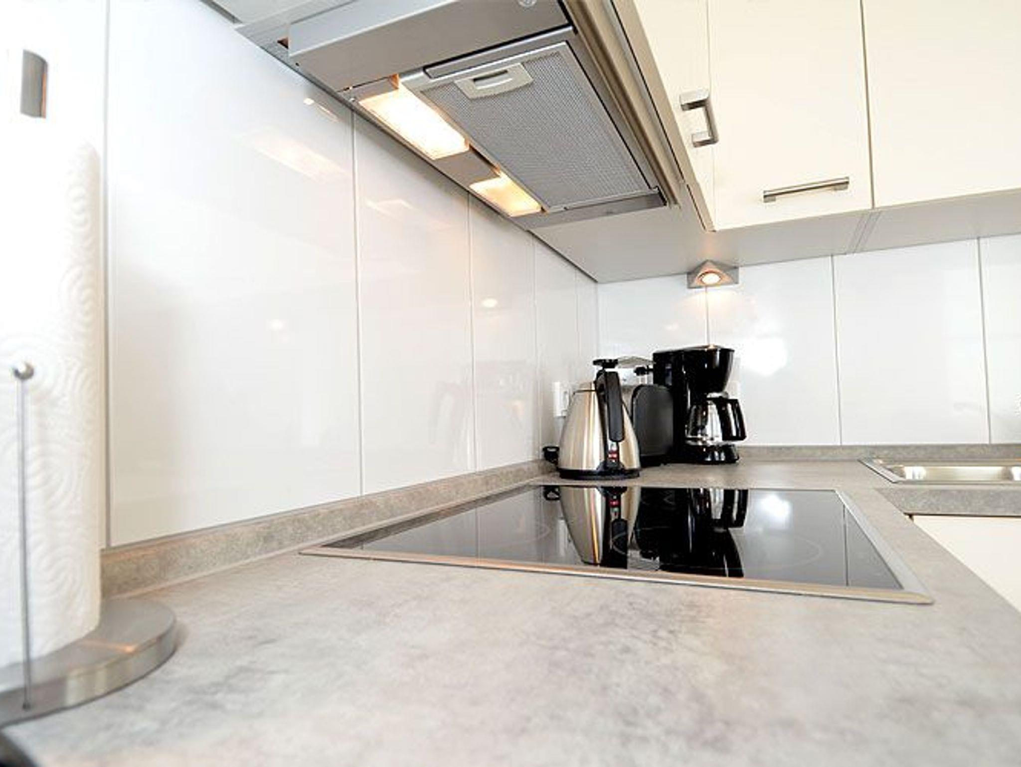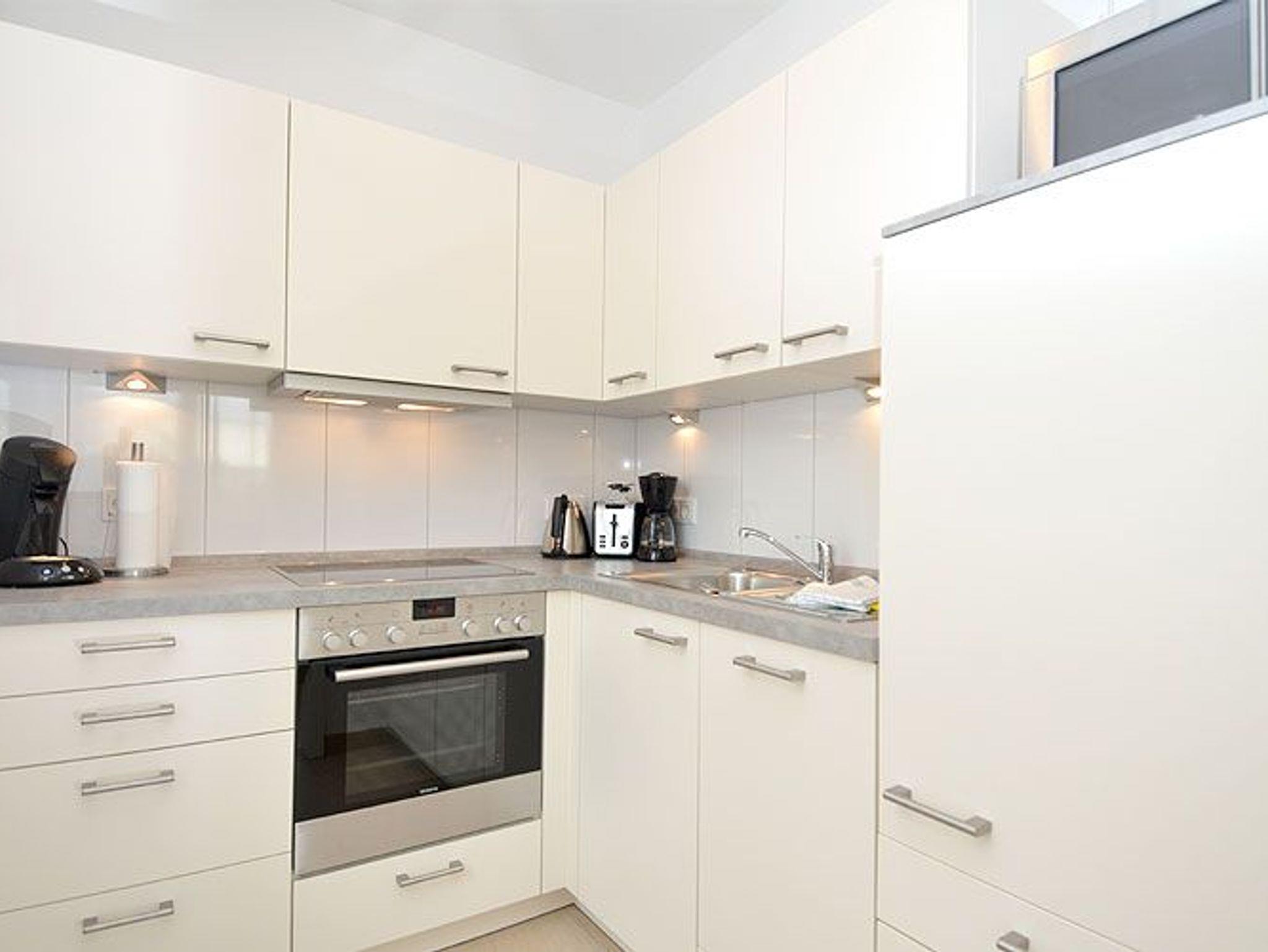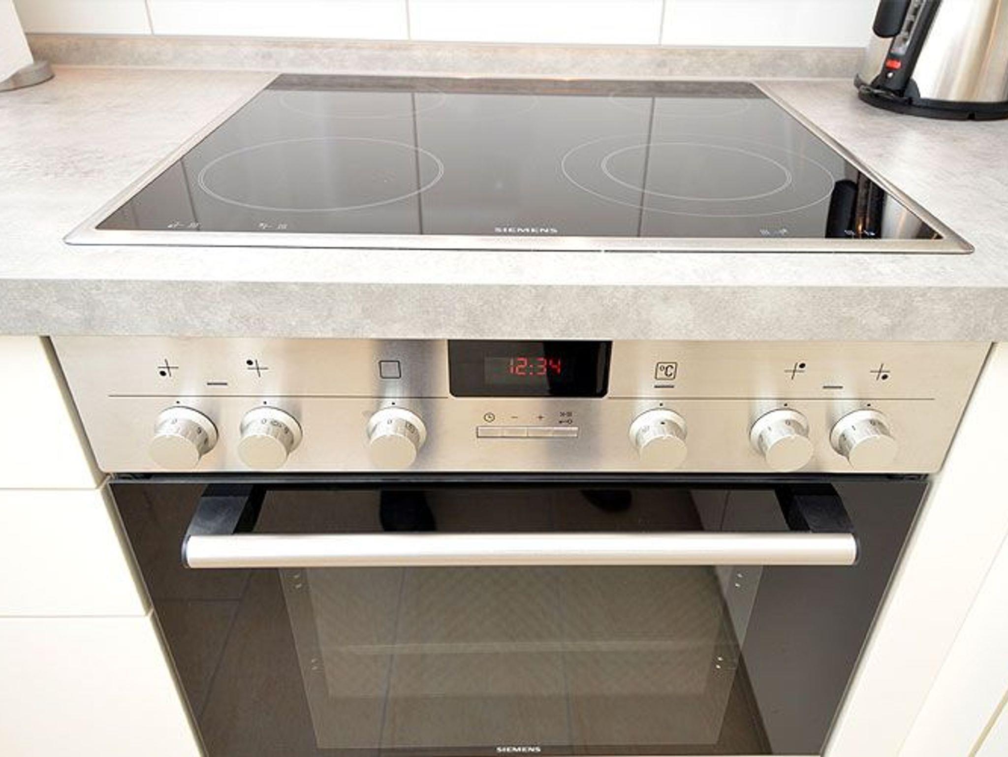Die optisch vom Wohnraum getrennte Küche ist mit einem großen Kühlschrank, einem Backofen, einem Ceranfeld mit 4 Kochfeldern, einer SENSEO-Kaffeemaschine, einer Mikrowelle sowie einer Spülmaschine und diversem Kleininventar, das die Küchenausstattung komplettiert, eingerichtet.