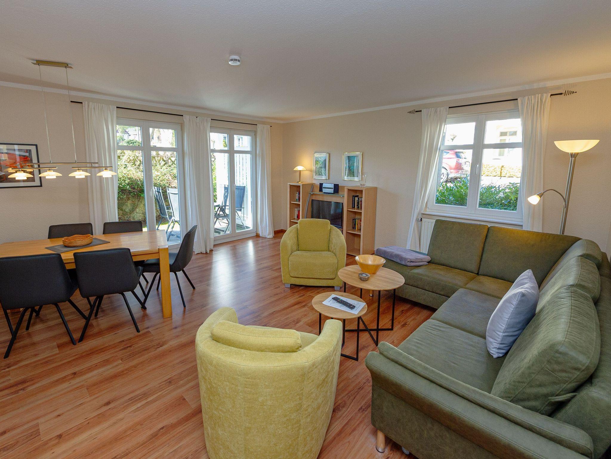 Der helle, freundliche Wohnraum ist mit einer bequemen Lederschlafcouch (Aufbettungsmöglichkeit für 2 Personen), zwei Sesseln und zwei Korbsesseln, einem Flachbild-TV, einer Mini-Stereoanlage mit CD-Player und einem Esstisch ausgestattet. Die harmonisch im Wohnbereich integrierte Küchenzeile ist ausgestattet mit einem Kühlschrank mit Gefrierfach, einem 4-Platten-Cerankochfeld, einem Backofen, einer Geschirrspülmaschine, einer Mikrowelle, Wasserkocher, Kaffeemaschine, Toaster und diversem Kleininventar, das die Küchenausstattung komplettiert.
