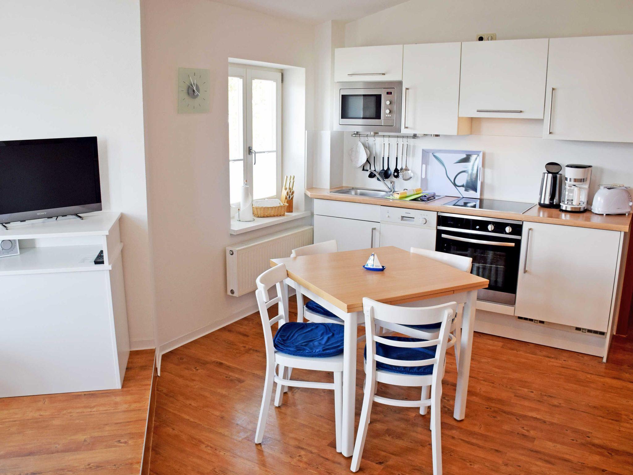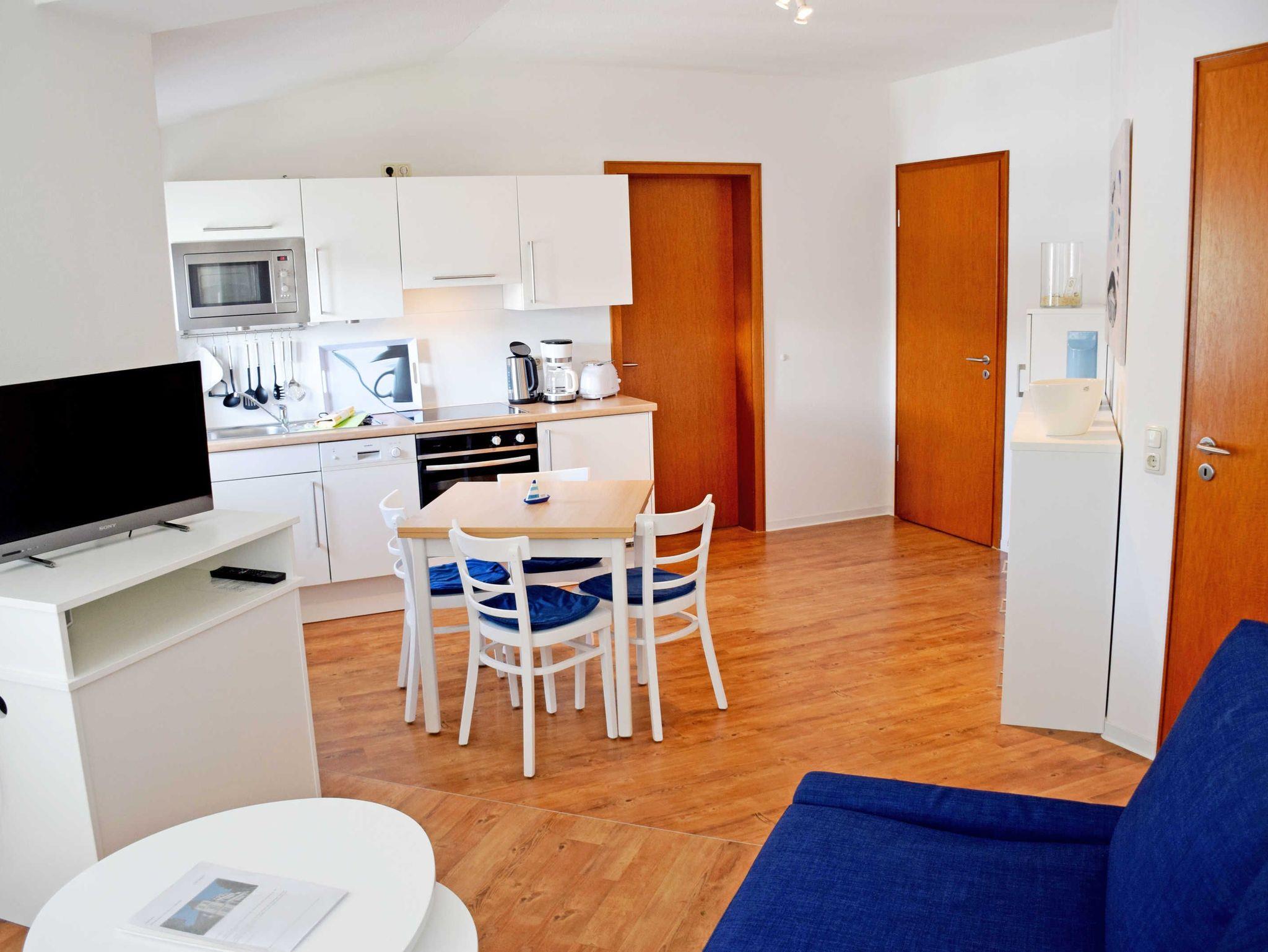 Gäste dieser Ferienwohnung können auch ein kostenloses WLAN-Internet nutzen. Im Wohnraum befinden sich eine bequeme Sitzcouch mit Schlaffunktion für 2 Gäste, Sessel und ein Tisch, ein modernes Flachbild-TV-Gerät. Hier steht auch ein Esstisch mit Stühlen.