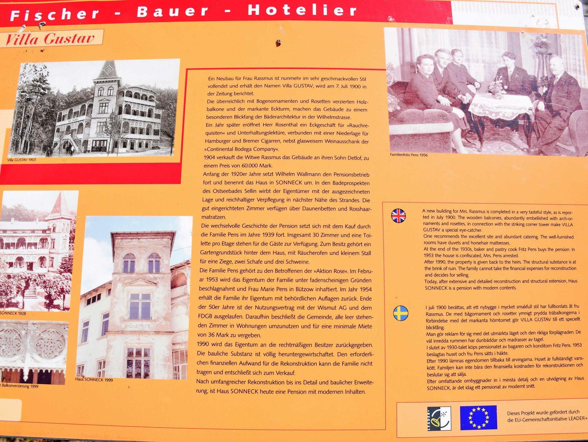 Es ist eines der schönsten Häuser in Sellin und wurde im Jahr 2000 behutsam nach Denkmalvorgaben restauriert. Die Wilhelmstraße führt nach ca. 300 m direkt zum feinsandigen, kilometerlangen Badestrand an der berühmten Selliner Seebrücke. Hier können Sie in Ihrem Rügen-Urlaub den Charme der goldenen Zwanziger Jahre genießen. Das Ostseebad Sellin gehört zum UNESCO Biosphärenreservat Südost-Rügen mit herrlicher, unverbrauchter Natur. In der näheren Umgebung gibt es zahlreiche Rad- und Wanderwege.
