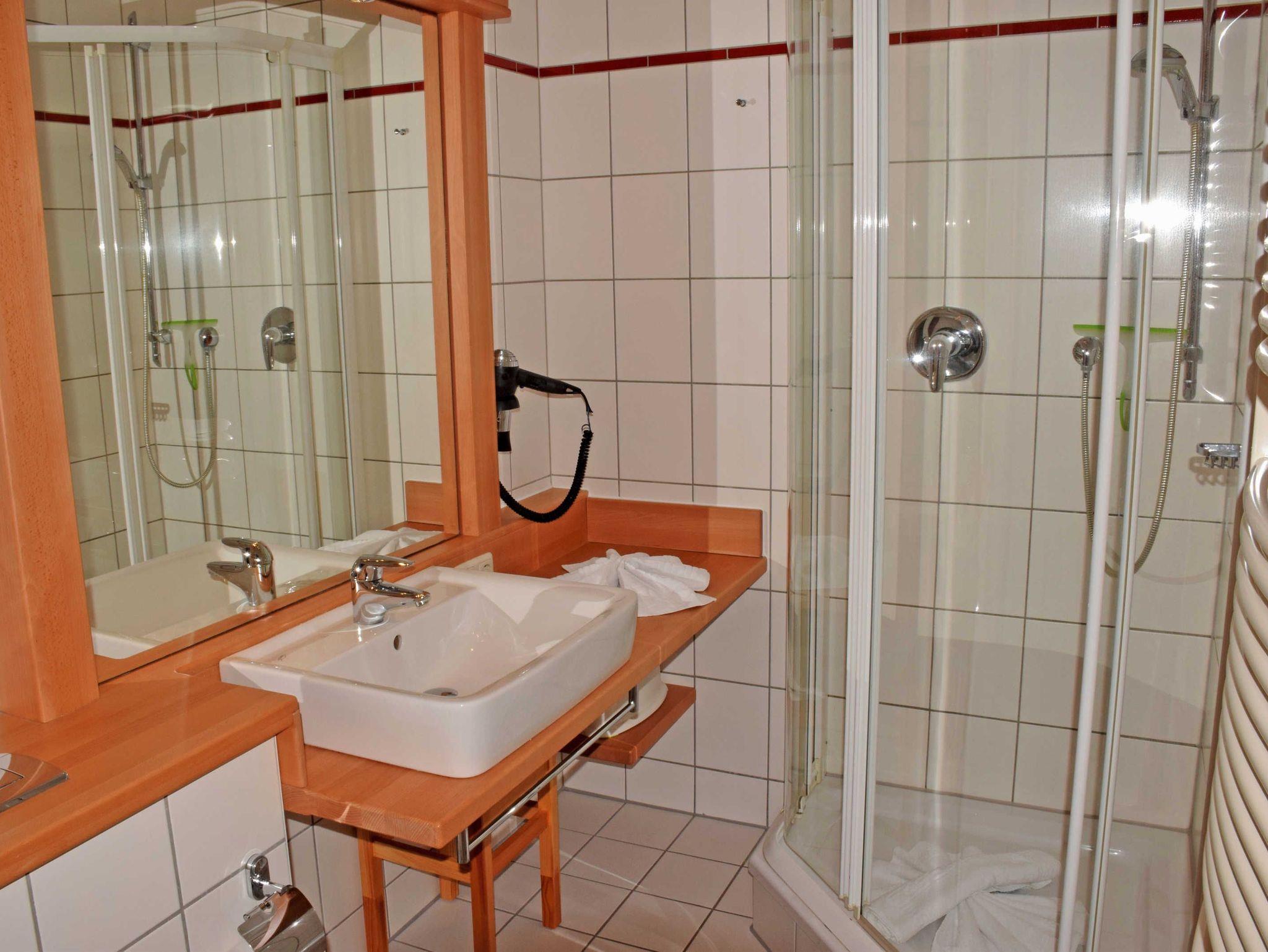 Das moderne Bad ist mit Dusche, WC und Waschtisch sowie Fön ausgestattet.