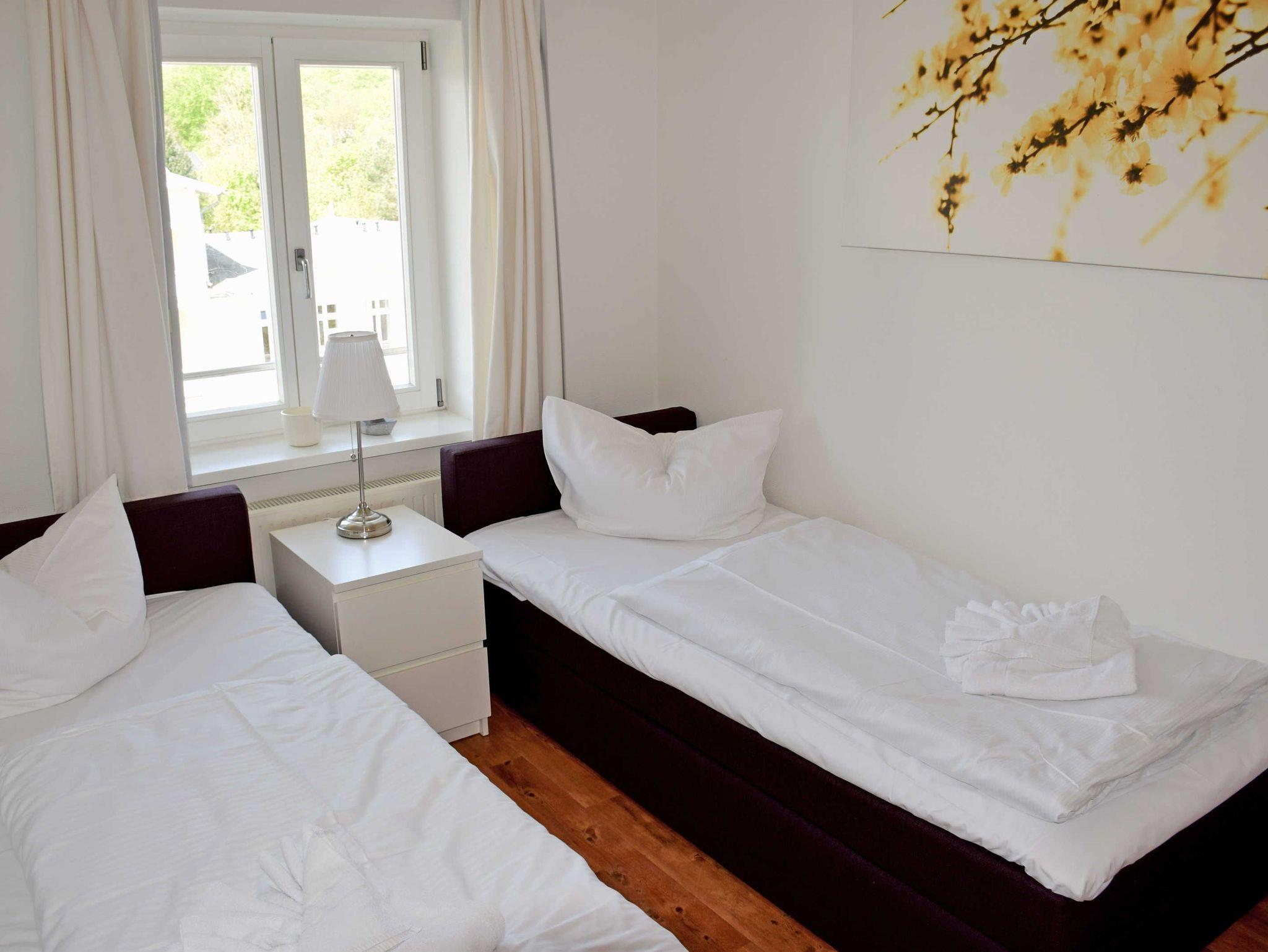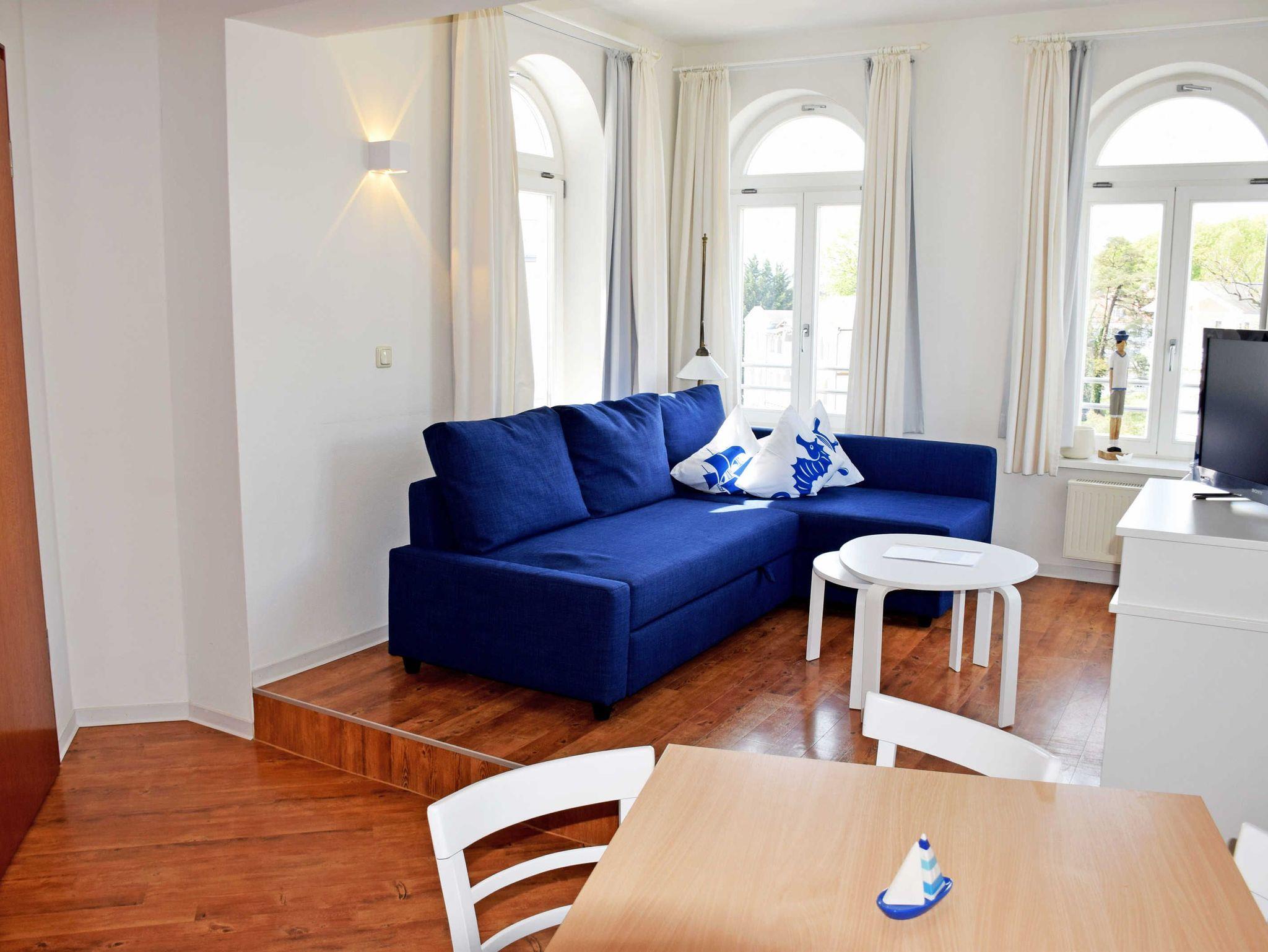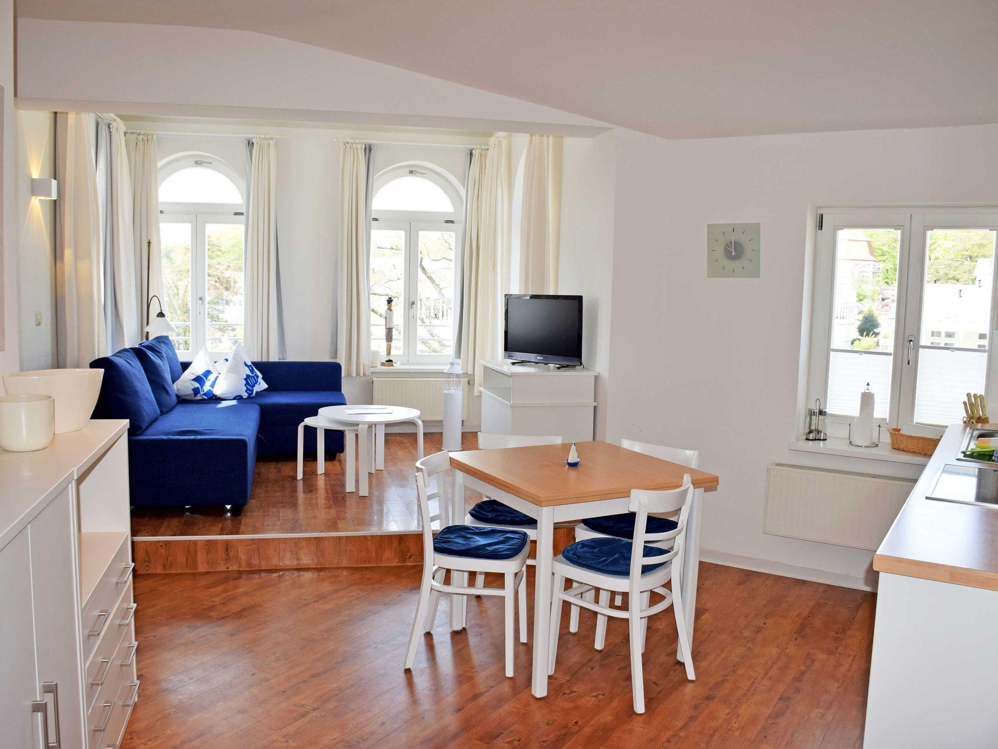 Unsere Ferienwohnung 20 mit Balkon und Strandkorb (max. 6 Erw. und ein Kind im Kinderreisebett bis 3 Jahre, 55 qm, mit Lift erreichbar, 2 Schlafzimmer, Wohnzimmer, Küchenzeile, Bad/Dusche, WLAN) verfügt über Internetanschluss und ist mit Herz individuell und komfortabel eingerichtet. Beeindruckend ist hier vorallem der herrliche Ausblick auf die Hauptpromenade Sellins mit den weißen Villen!