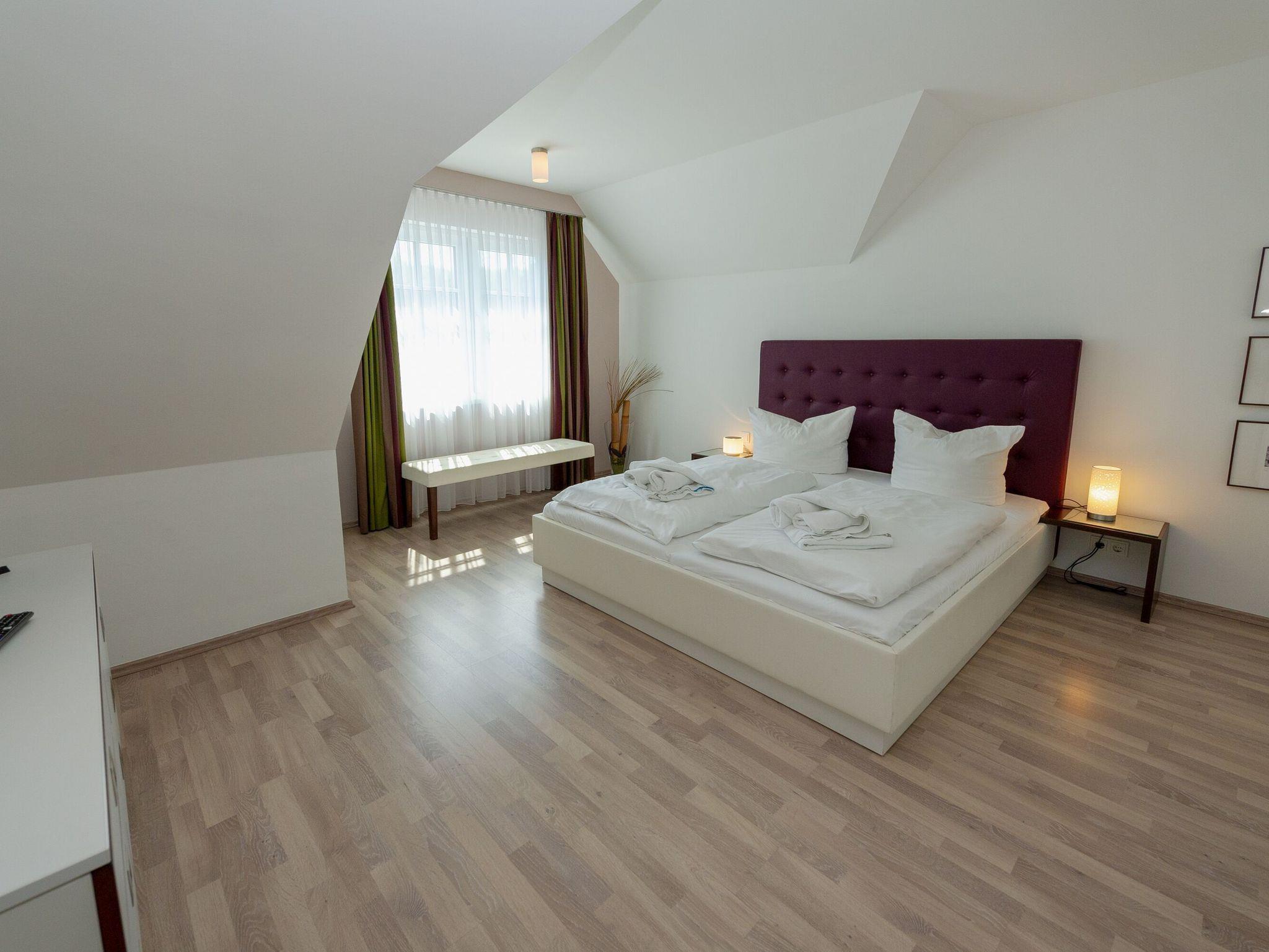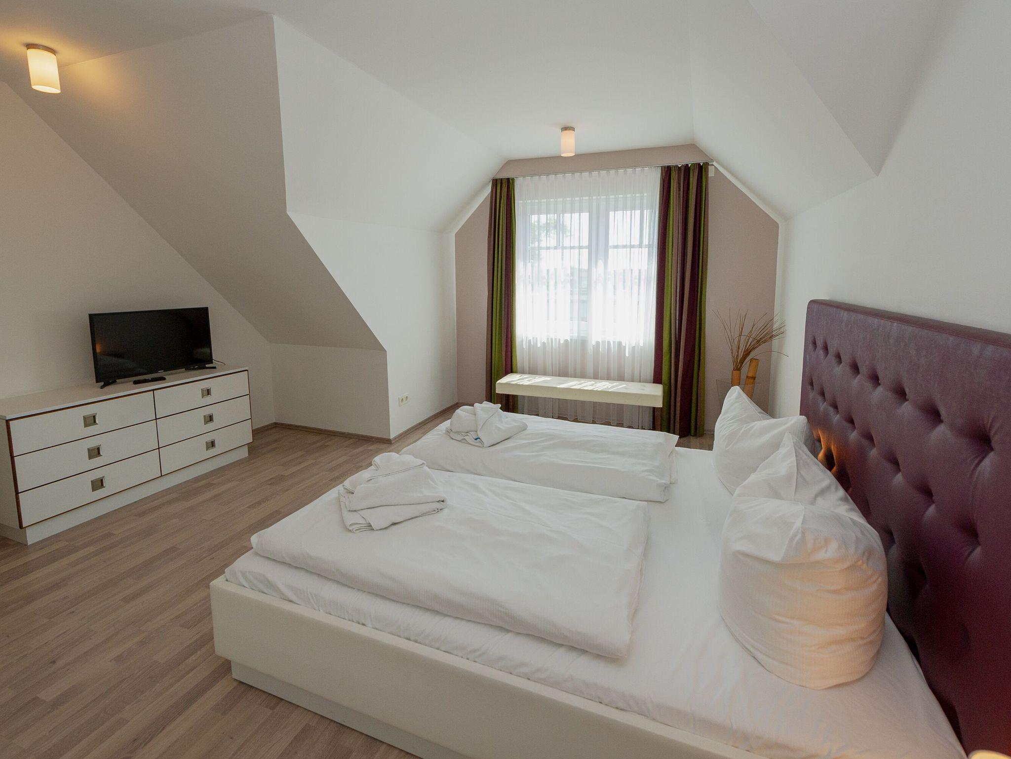 Im Obergeschoss befinden sich zwei Schlafzimmer mit jeweils einem Doppelbett, ein weiteres Schlafzimmer im Erker mit 2 Einzelbetten sowie das zweite Badezimmer, ausgestattet mit Dusche/WC, Badewanne, Waschtisch und beheizbarem Handtuchtrockner. Leichte Dachschrägen vermitteln Gemütlichkeit.
