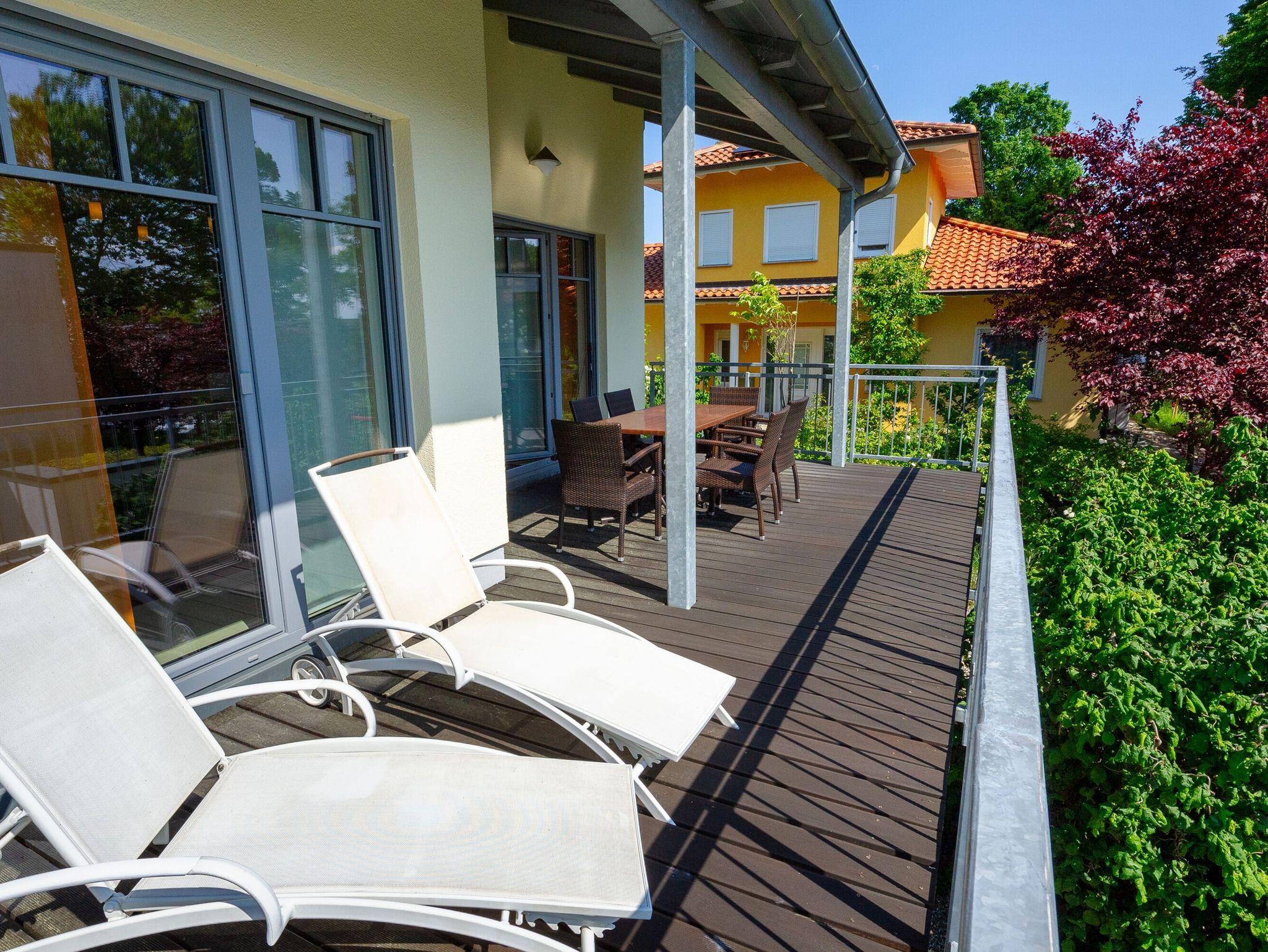 Die sonnige Hochterrasse gen Süden ist teilweise überdacht. Die beiden Sonnenliegen und die großzügige Sitzgruppe führen die exklusive Ausstattung auch im Außenbereich fort und bieten die Möglichkeit, sich rundum wohl zu fühlen.