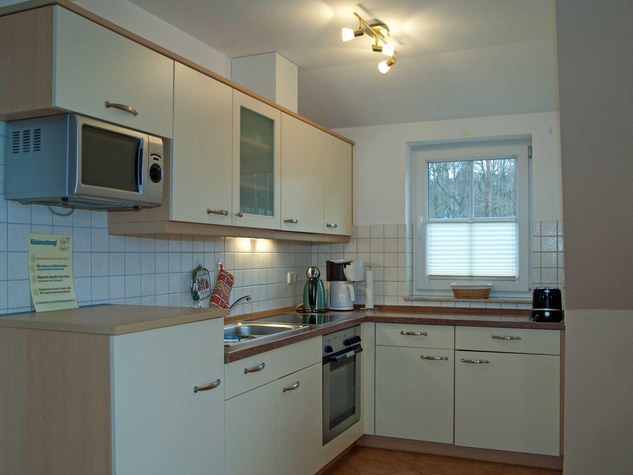 - E-Herd (Ceranfeld, Backofen), Mikrowelle, Kaffeemaschine, Wasserkocher, Toaster, sowie diverse Küchenutensilien, Kühlschrank mit Gefrierfach, Geschirrspüler