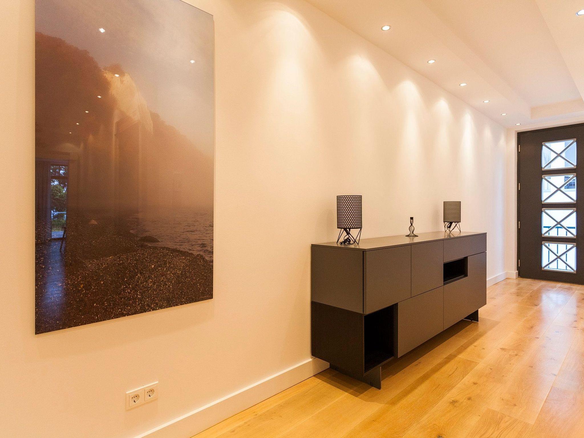 Über eine beeindruckende Eichentreppe welche die beiden Etagen der Strandresidenz verbindet gelangen Sie[nbsp] in den lichtdurchfluteten[nbsp] 70 qm großen Wohn- und[nbsp] Kochbereich mit einem eleganten Küchenblock inkl. neuestem Kaffeevollautomat der Siemens EQ Serie, einem Esstisch für alle Gäste und einem Tunnelkamin als Raumteiler.