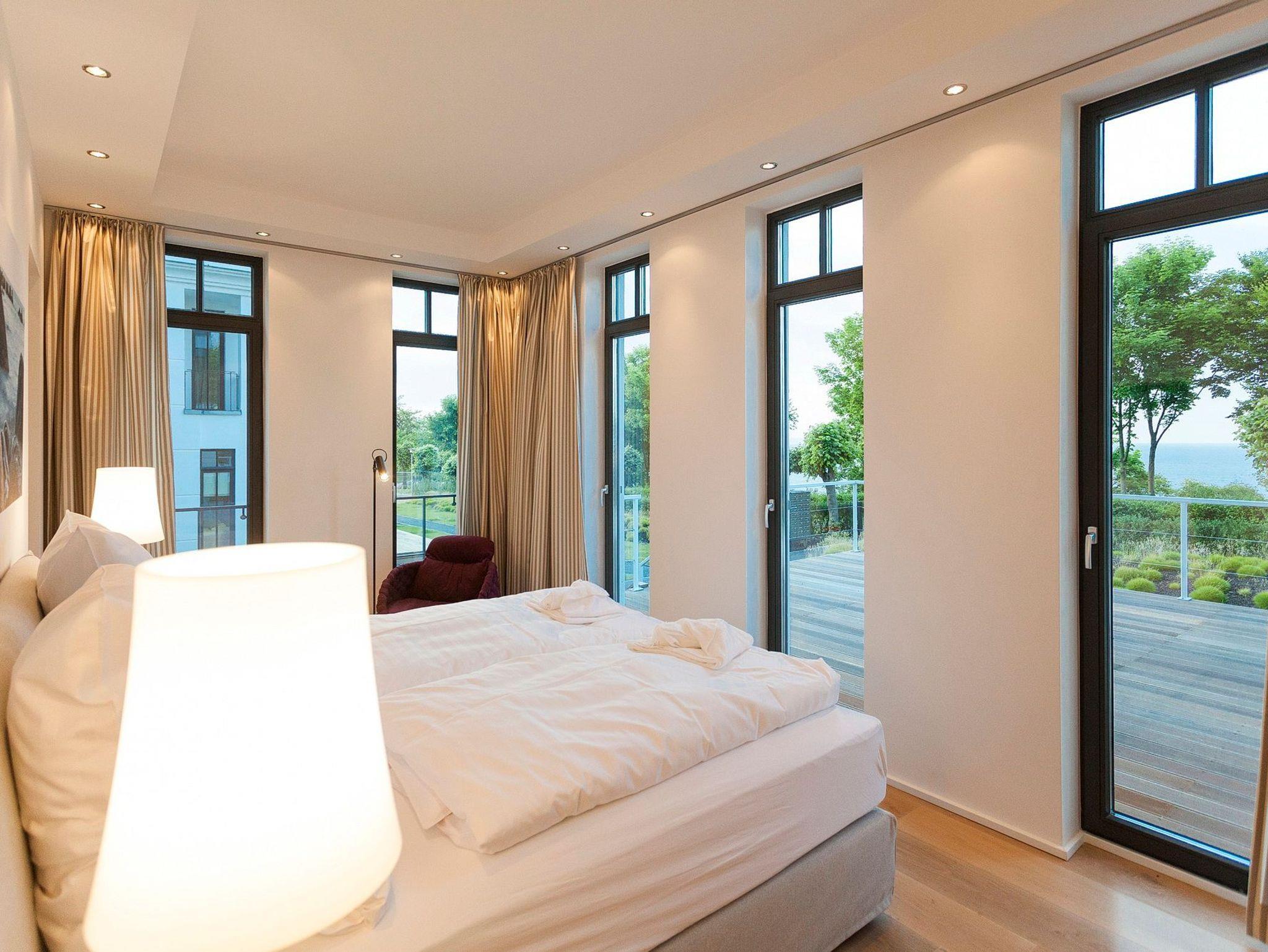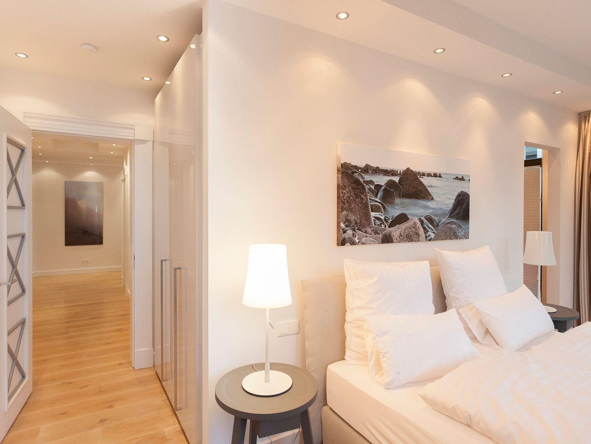 Drei stilvolle Schlafzimmer, zwei davon auf der Meerseite, alle ausgestattet mit Traumbetten von Schramm und großzügigen Einbauschränken werden jeweils von eigenen Ensuite-Bädern mit bodentiefen Duschen, Handtuchtrocknern, Kosmetikspiegeln und Dornbracht-Armaturen ergänzt.