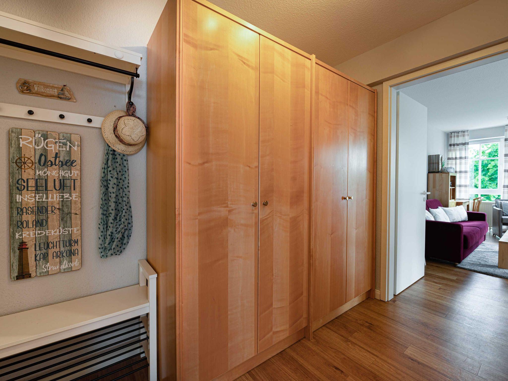 Ein weiterer Kleiderschrank, Gaderobe und Schuhregal befinden sich im Korridor.