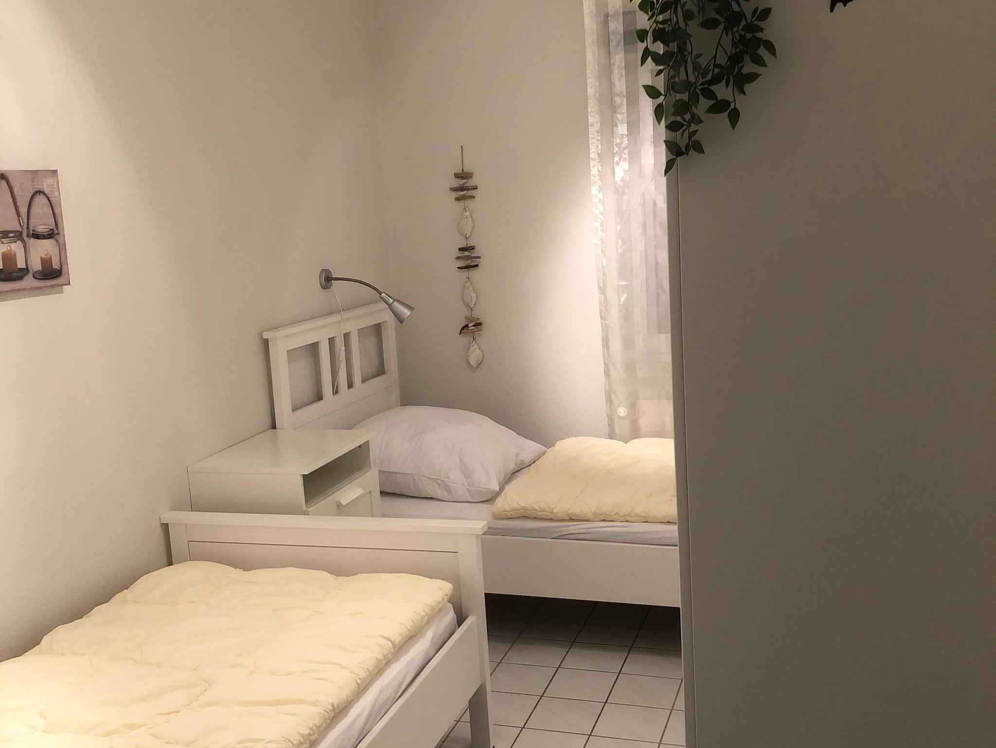 Das 2. Schlafzimmer verfügt über zwei nebeneinanderstehende Einzelbetten (je 90 x 200) mit Ablageflächen. Natürlich gibt es hier auch einen Kleiderschrank.
