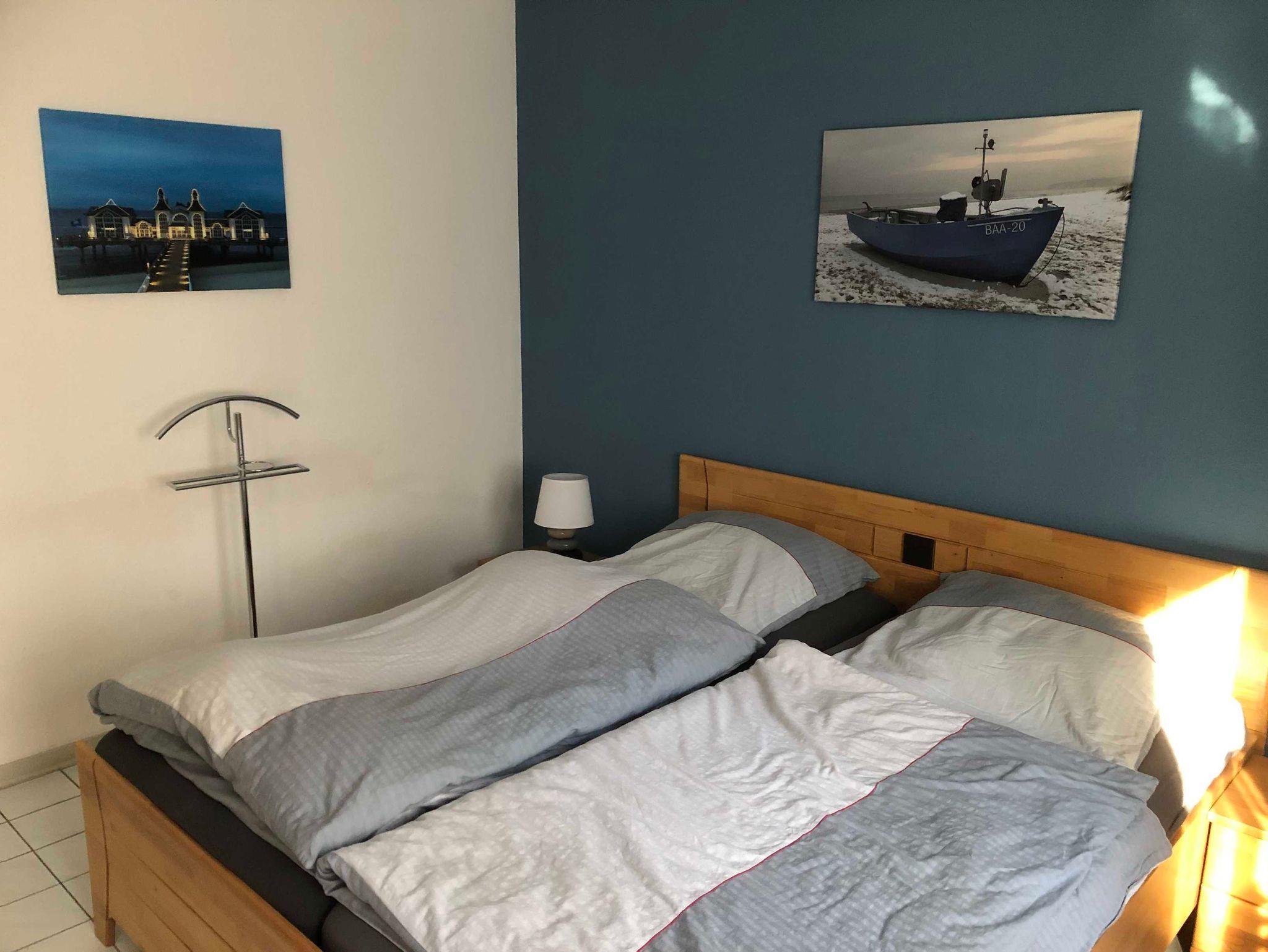 Des Weiteren enthält die Ferienwohnung zwei Schlafräume, in einem befindet sich ein Doppelbett und im anderen zwei Einzelbetten.