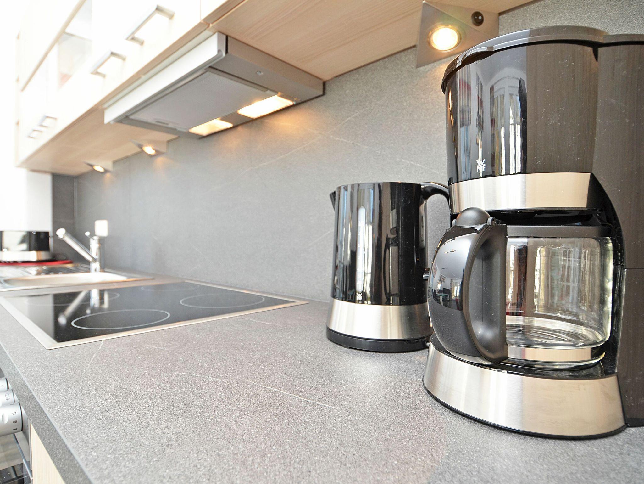 Die harmonisch in den Wohnbereich integrierte Küchenzeile mit einem 4-Zonen-Cerankochfeld mit Backofen, einem Kühlschrank mit Gefrierfach, einer Spülmaschine, einer Mikrowelle, Kaffeemaschine, Toaster und diversem Kleininventar sowie ein Esstisch für vier Personen ermöglichen es Ihnen, Ihren Tag gemütlich zu beginnen. Der nächste Bäcker ist nur zwei Gehminuten entfernt.