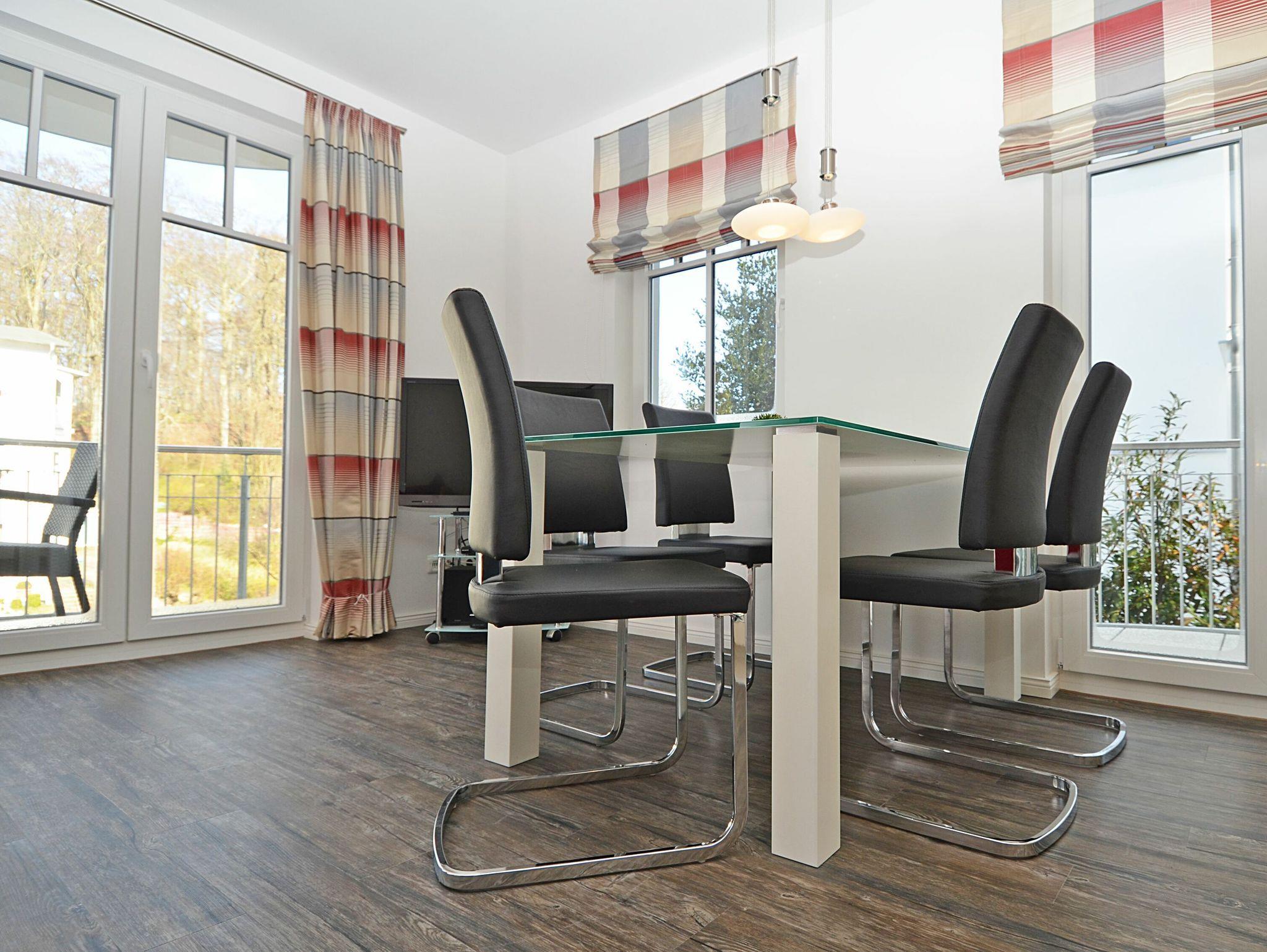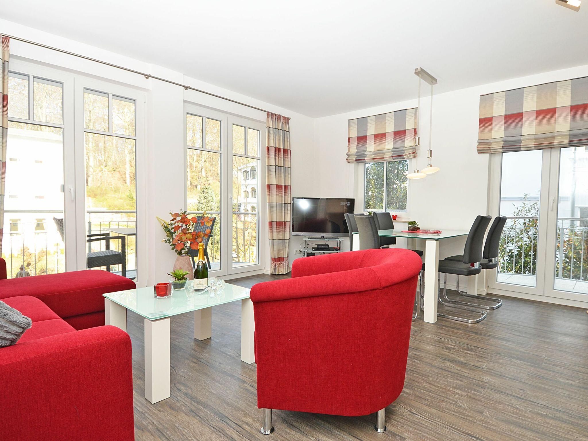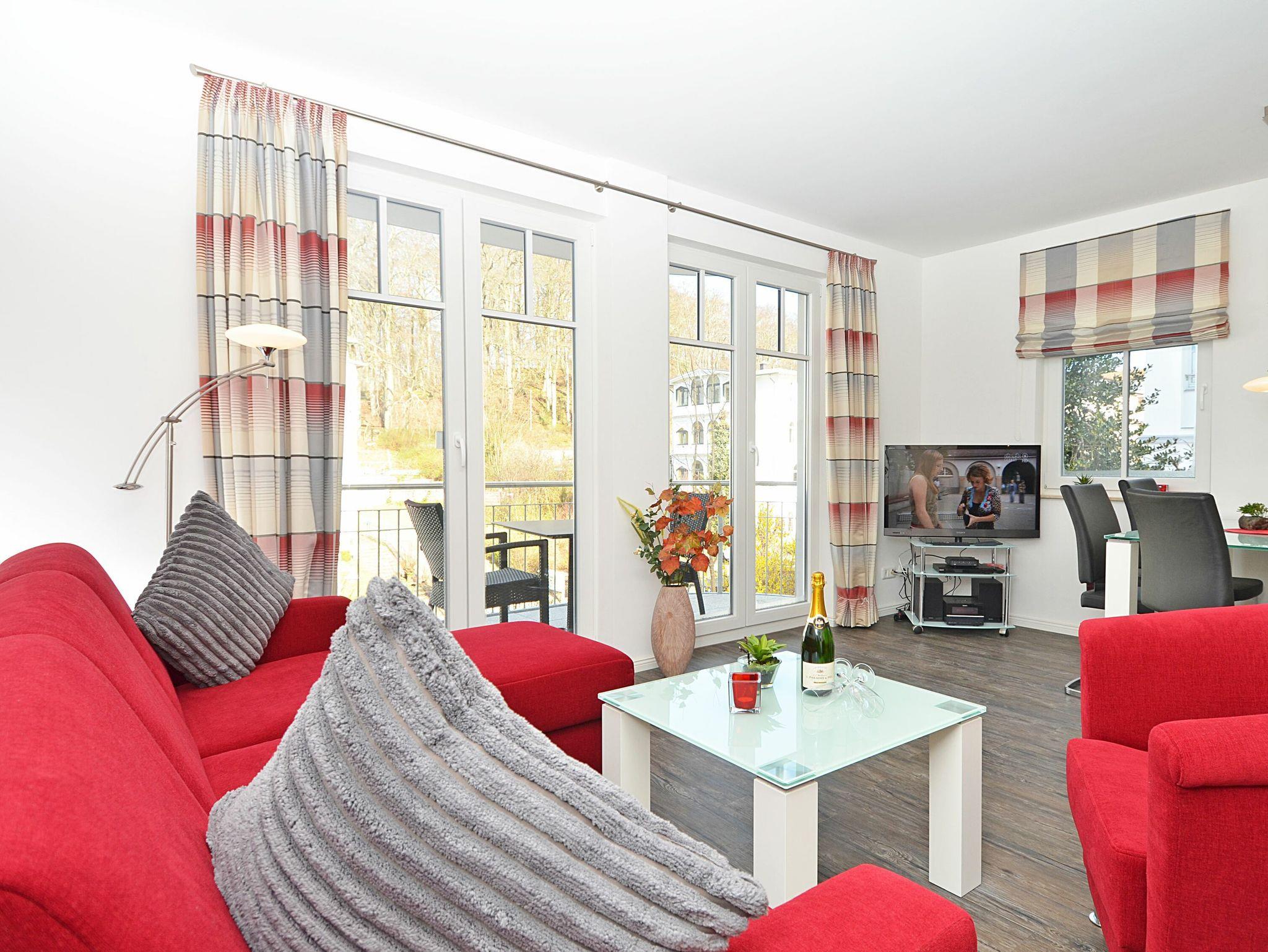 Vom Eingangsflur aus betreten Sie den komfortabel ausgestatteten Wohnbereich, der mit einem hochwertigen Sofa mit Recamiere, einem 40-Zoll LED-TV, Blu-ray-Player und einer Hifi-Anlage mit iPOD-Dockingstation zum Verweilen nach einem anregenden Tag einlädt. Ein W-LAN-Anschluss steht Ihnen kostenfrei zur Verfügung. Vom möblierten Balkon zur Westseite können Sie den Blick über die wunderschönen Bädervillen der Wilhelmstraße schweifen lassen und die Abendsonne genießen.