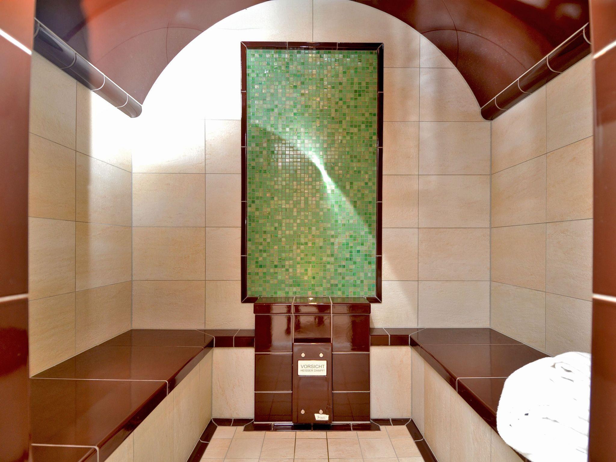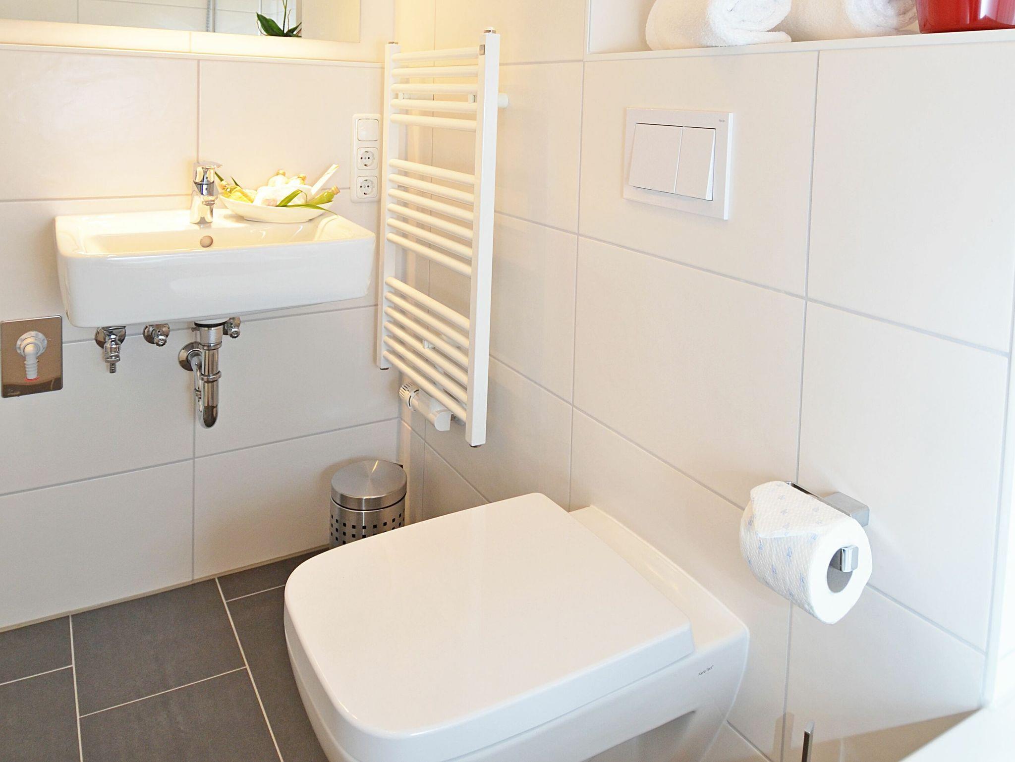 Die Wohnung komplettiert ein modernes Badezimmer, ausgestattet mit einer Badewanne, Handtuchwärmer und Fön. Im Haus wartet darüber hinaus gegen eine kleine Gebühr ein gemeinschaftlich nutzbarer Wellnessbereich mit Sauna und Ruheraum auf Ihren Besuch.