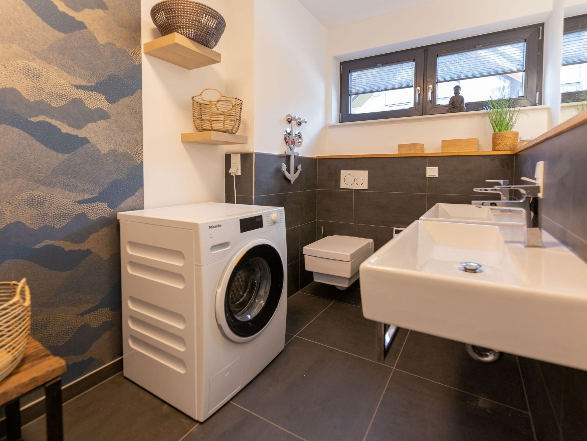 Das freundliche und großzügige Badezimmer mit Fenster ist zusätzlich mit einer Waschmaschine ausgestattet.