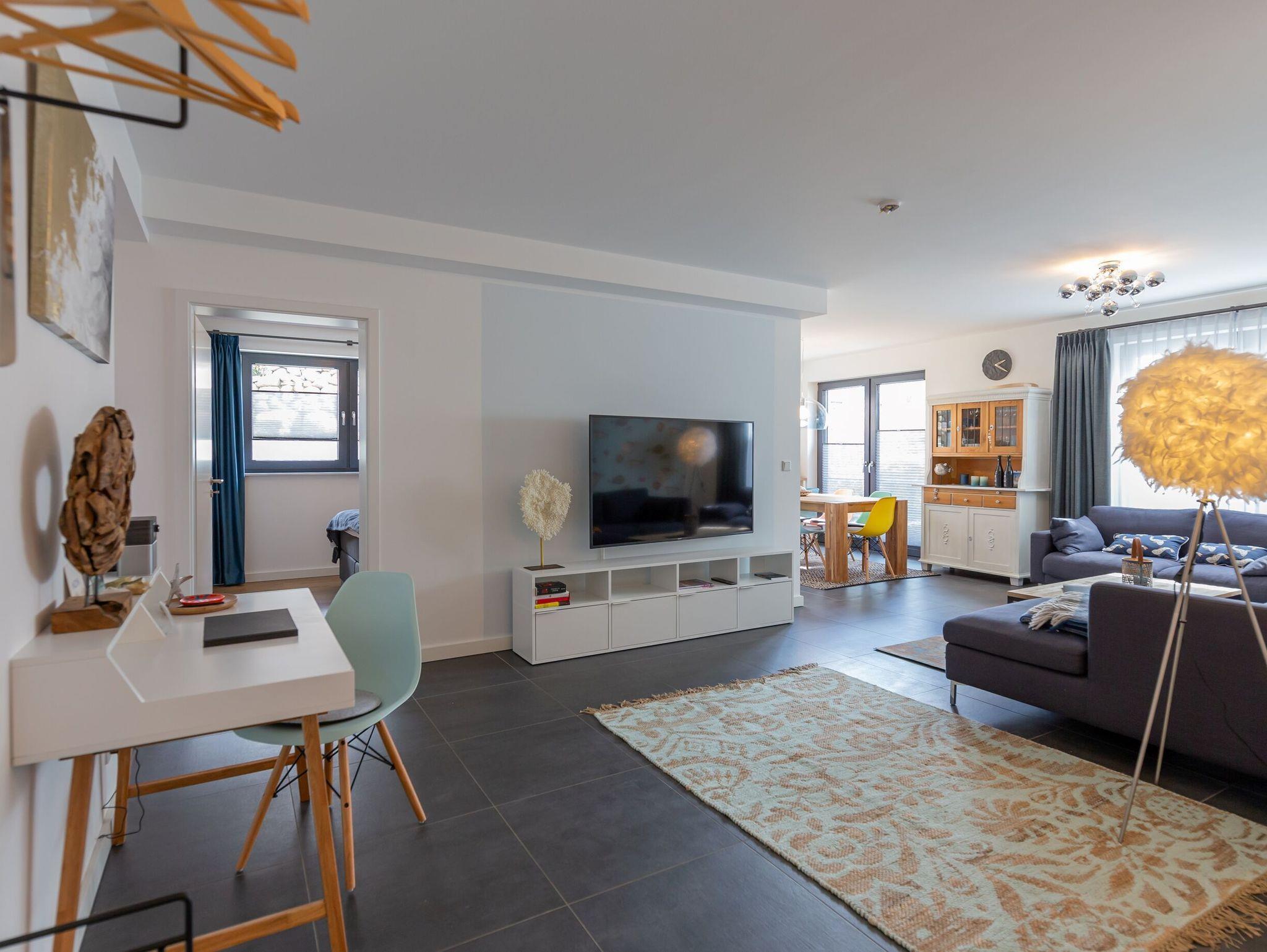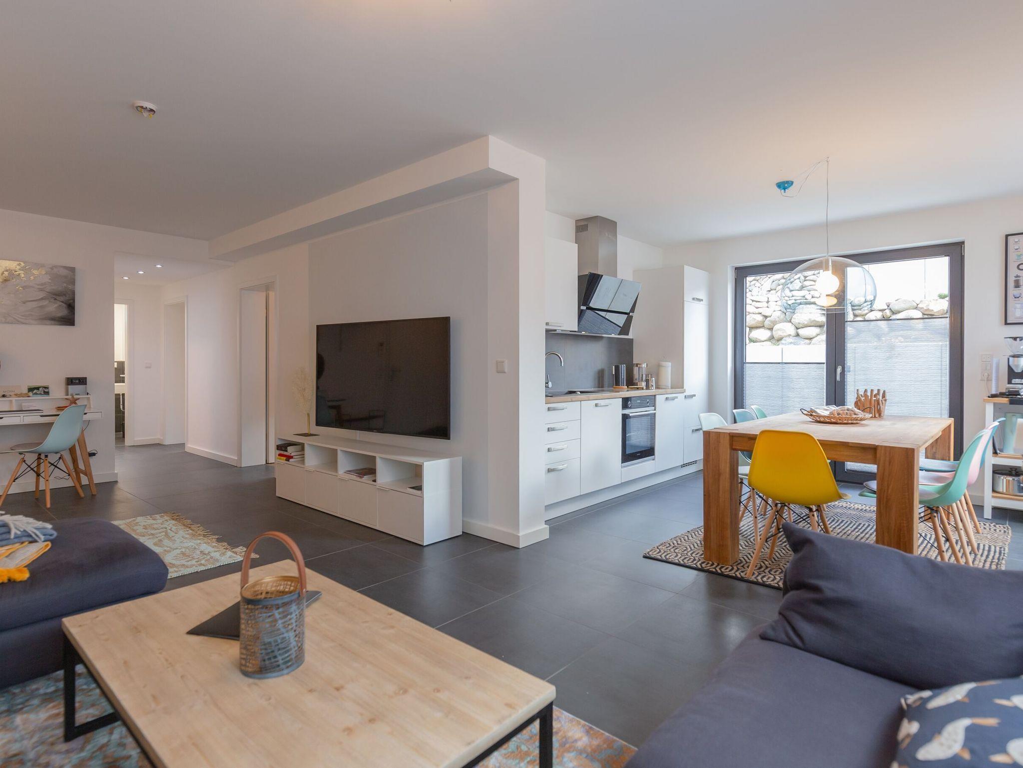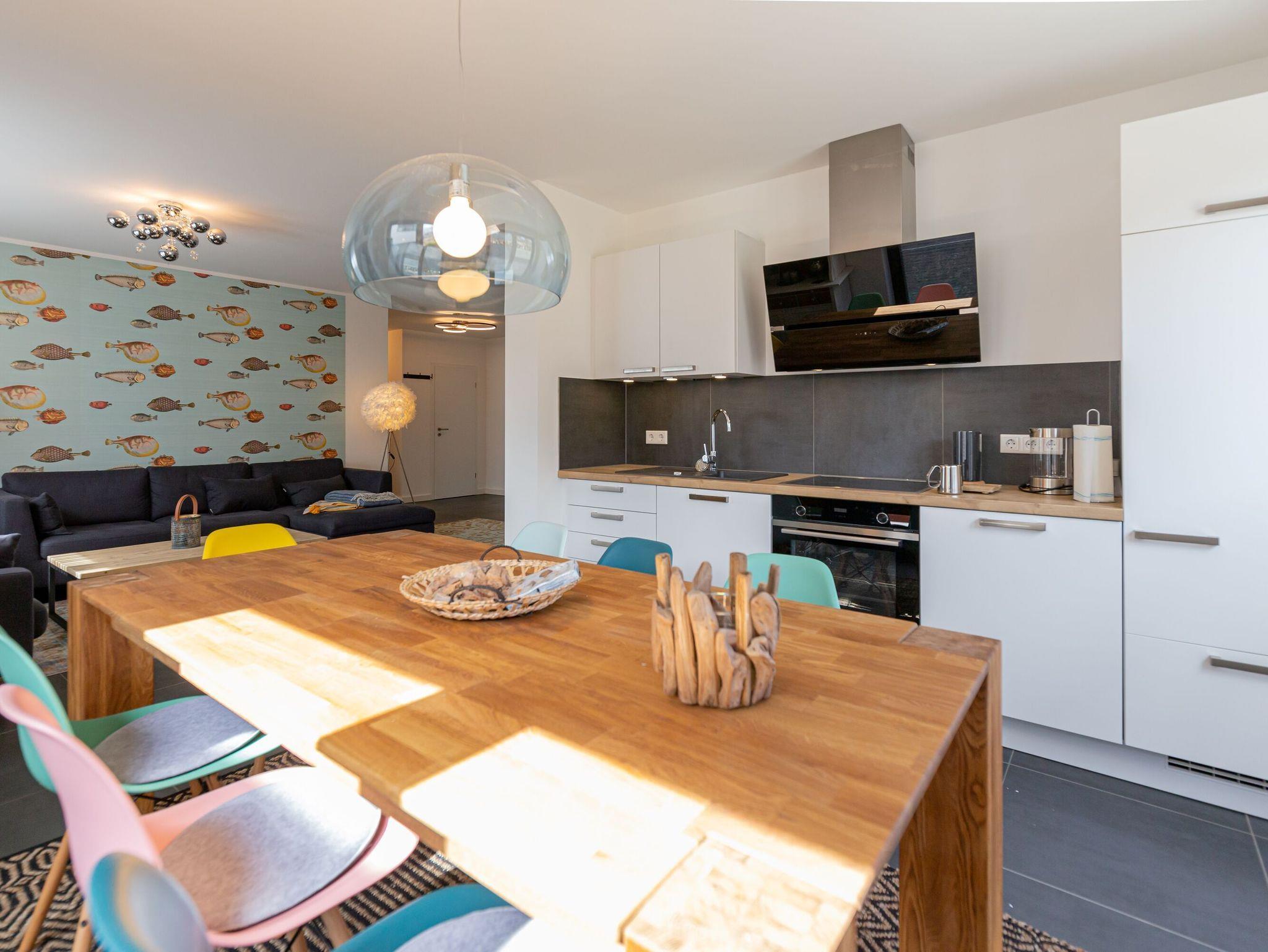 Betreten Sie die Ferienwohnung Mare, erwartet Sie eine herrlich maritime Atmosphäre zum Wohlfühlen und eine sonnige Terrasse. Der freundliche Wohnbereich verfügt über eine hochwertige, voll ausgestattete Küche mit einladendem Essbereich.