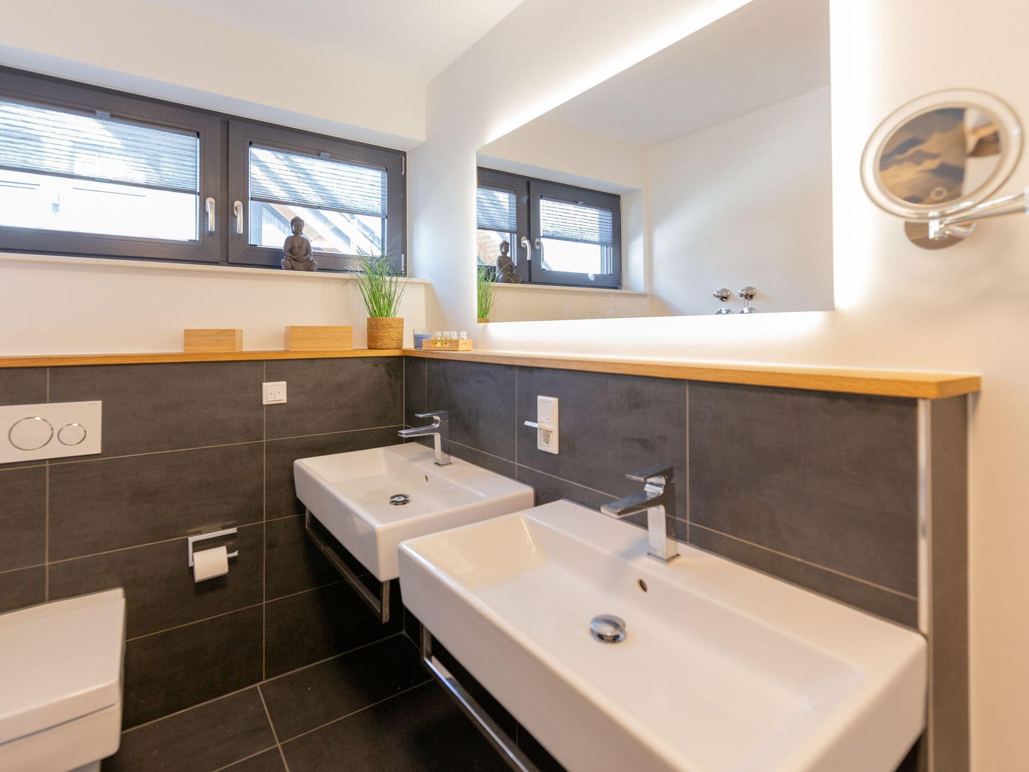 Die begehbare, ebenerdige Dusche und der große Doppelwaschtisch mit Tageslichtspiegel sind ebenfalls im Badezimmer vorhanden.