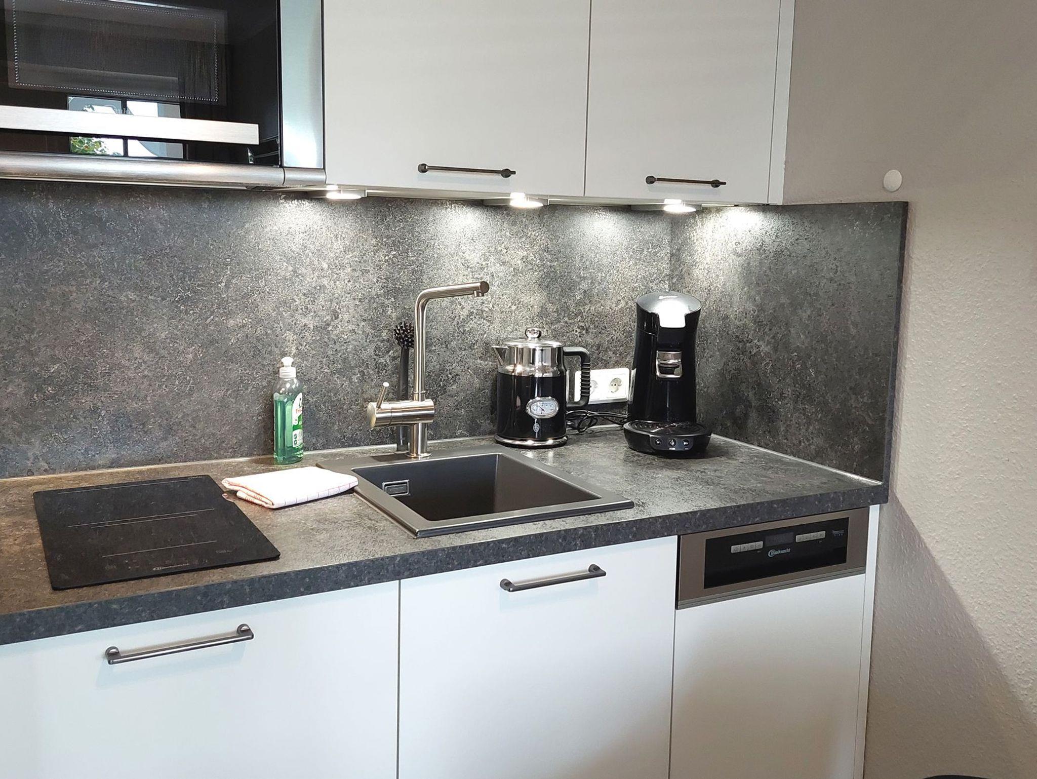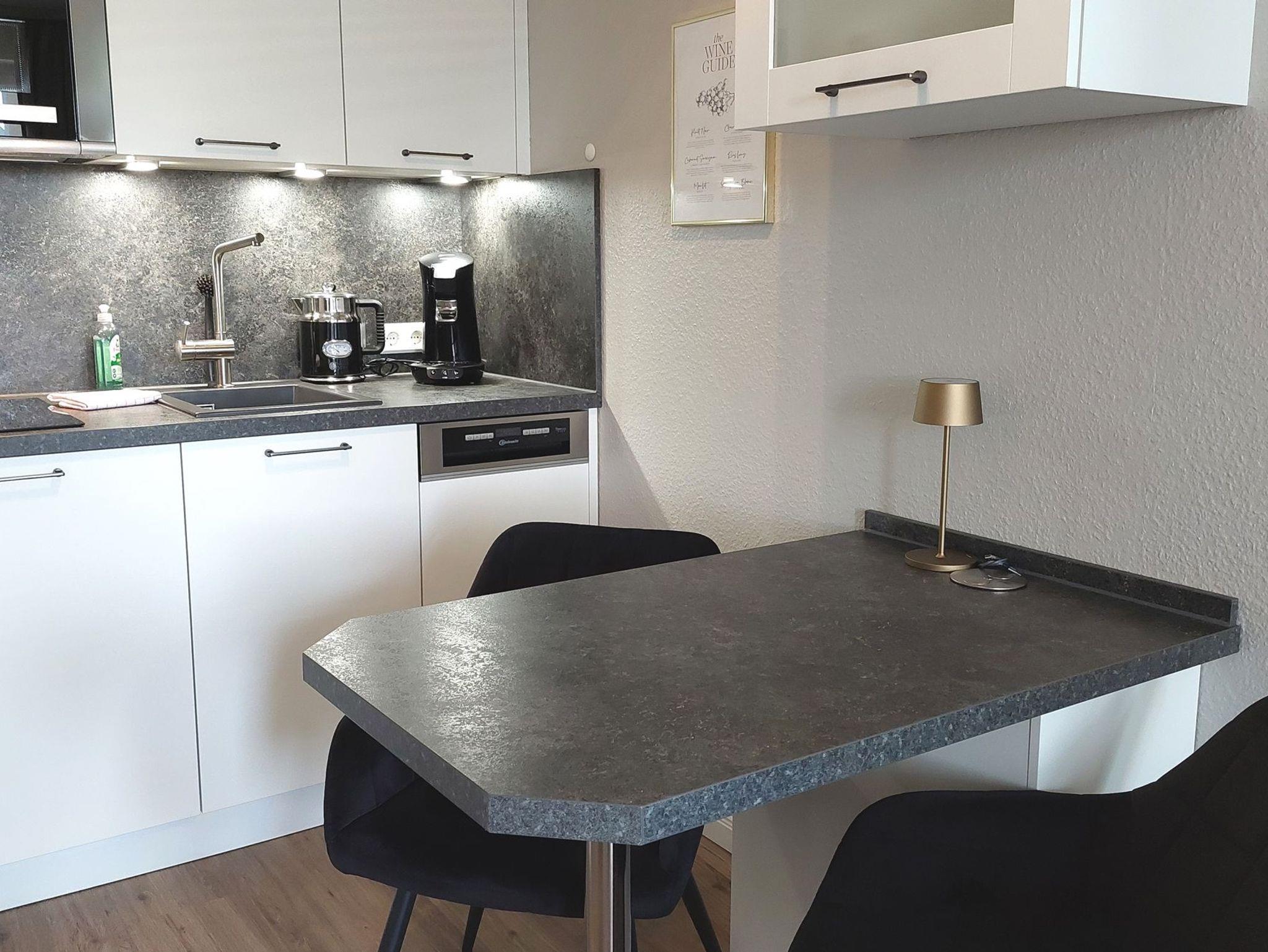 Im gemütlichen Wohnbereich befindet sich eine moderne, offene Küchenzeile samt Esstisch für bis zu 3 Personen.