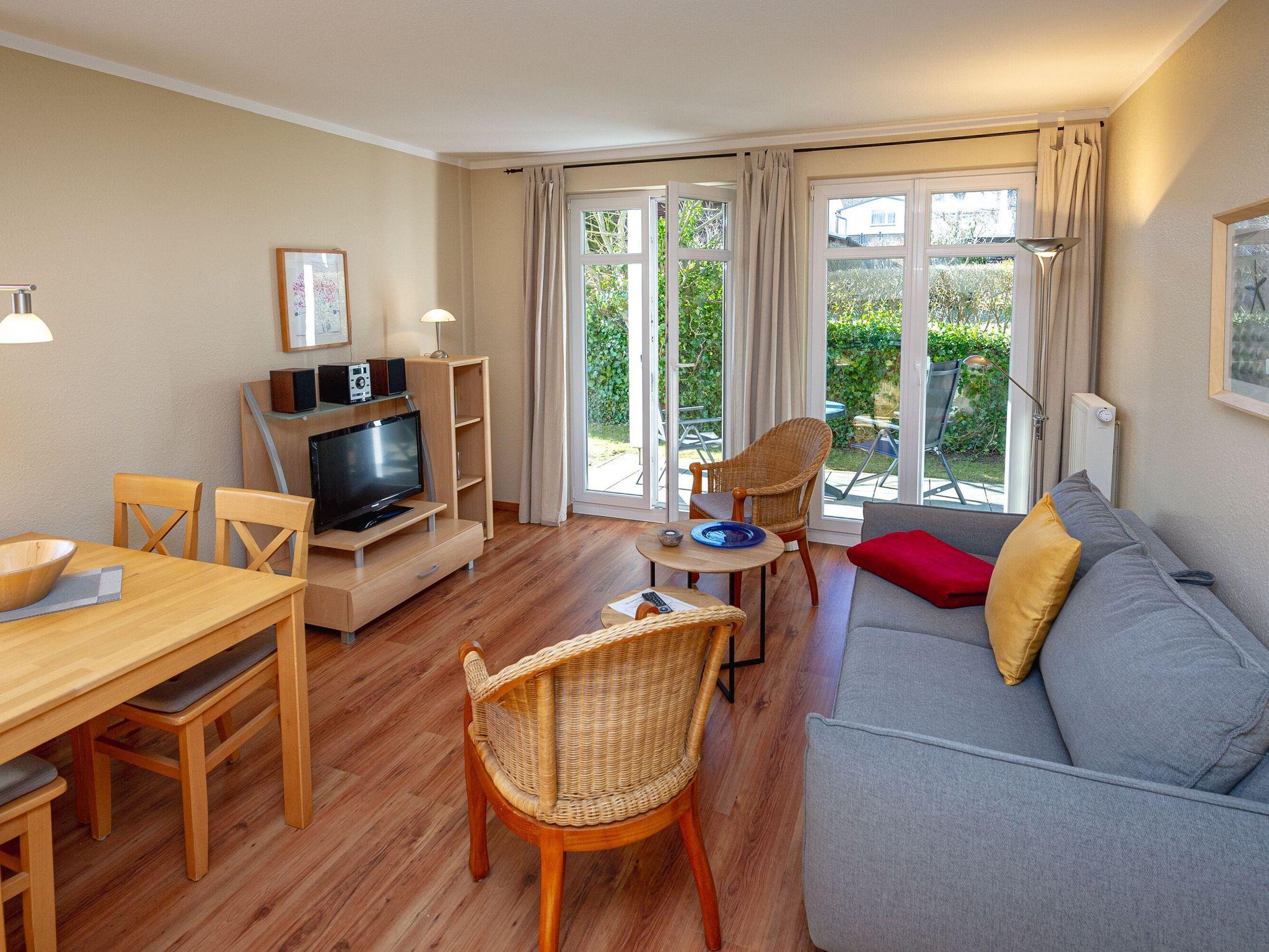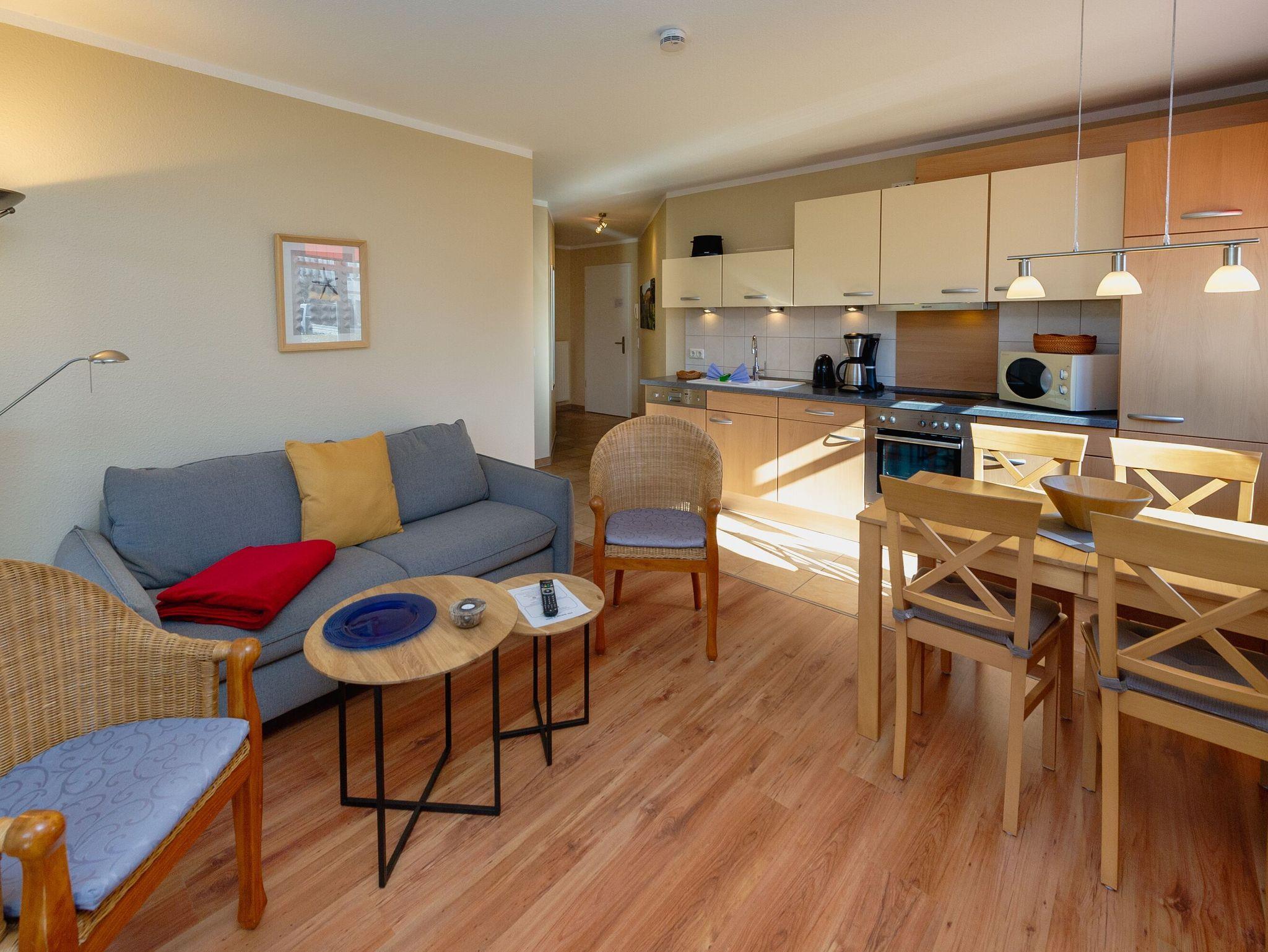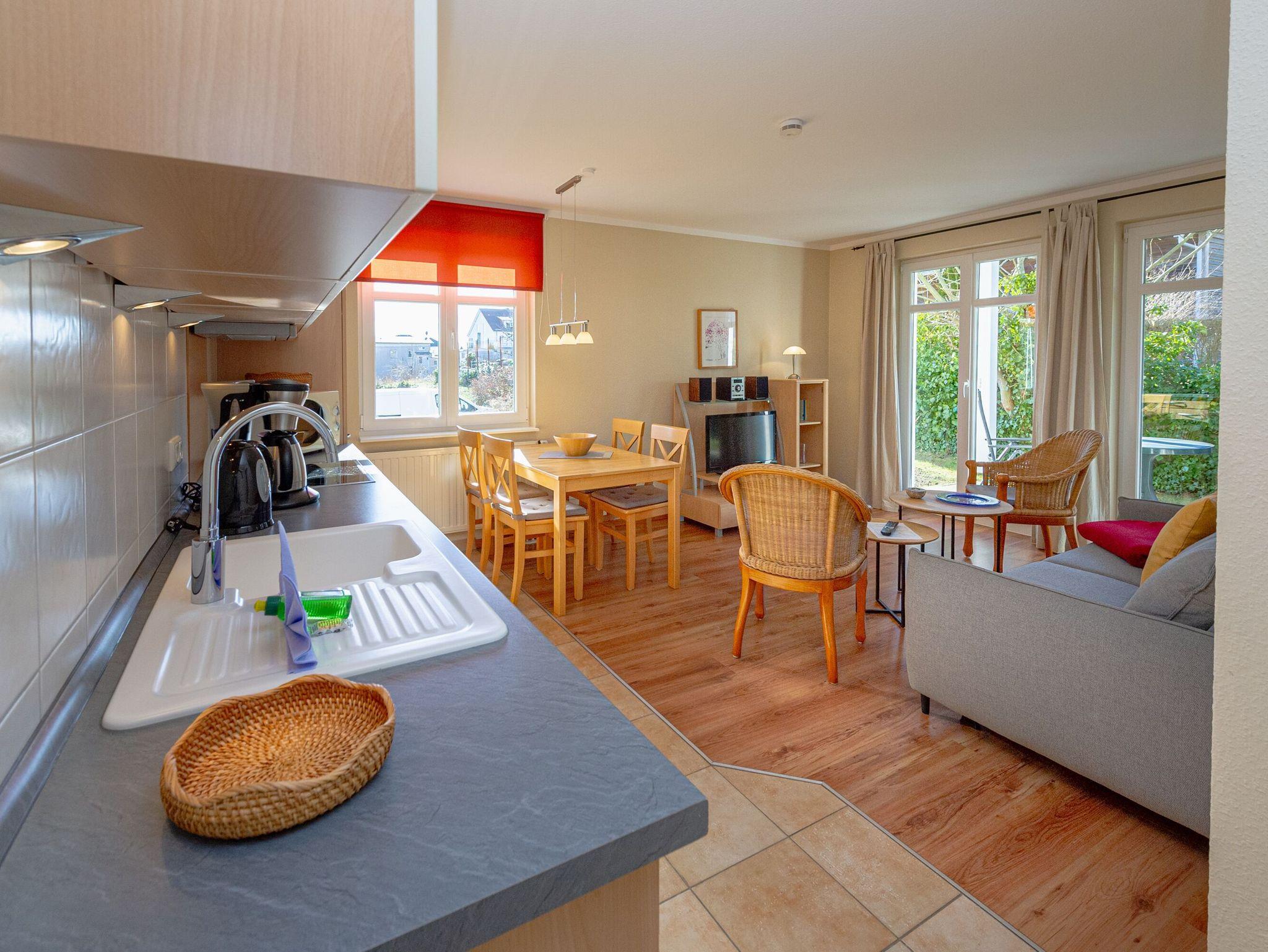 Der helle, freundliche Wohnraum ist mit einer bequemen Schlafcouch (Aufbettungsmöglichkeit für 2 Personen), zwei Sesseln, einem Flachbild-TV, einer Mini-Stereoanlage mit CD-Player und einem Esstisch ausgestattet. Die harmonisch in den Wohnbereich integrierte Küchenzeile bietet einen Kühlschrank mit Gefrierfach, ein 4-Platten-Cerankochfeld, einen Backofen, eine Geschirrspülmaschine, eine Mikrowelle, Wasserkocher, Kaffeemaschine, Toaster und diverses Kleininventar, das die Küchenausstattung komplettiert.
