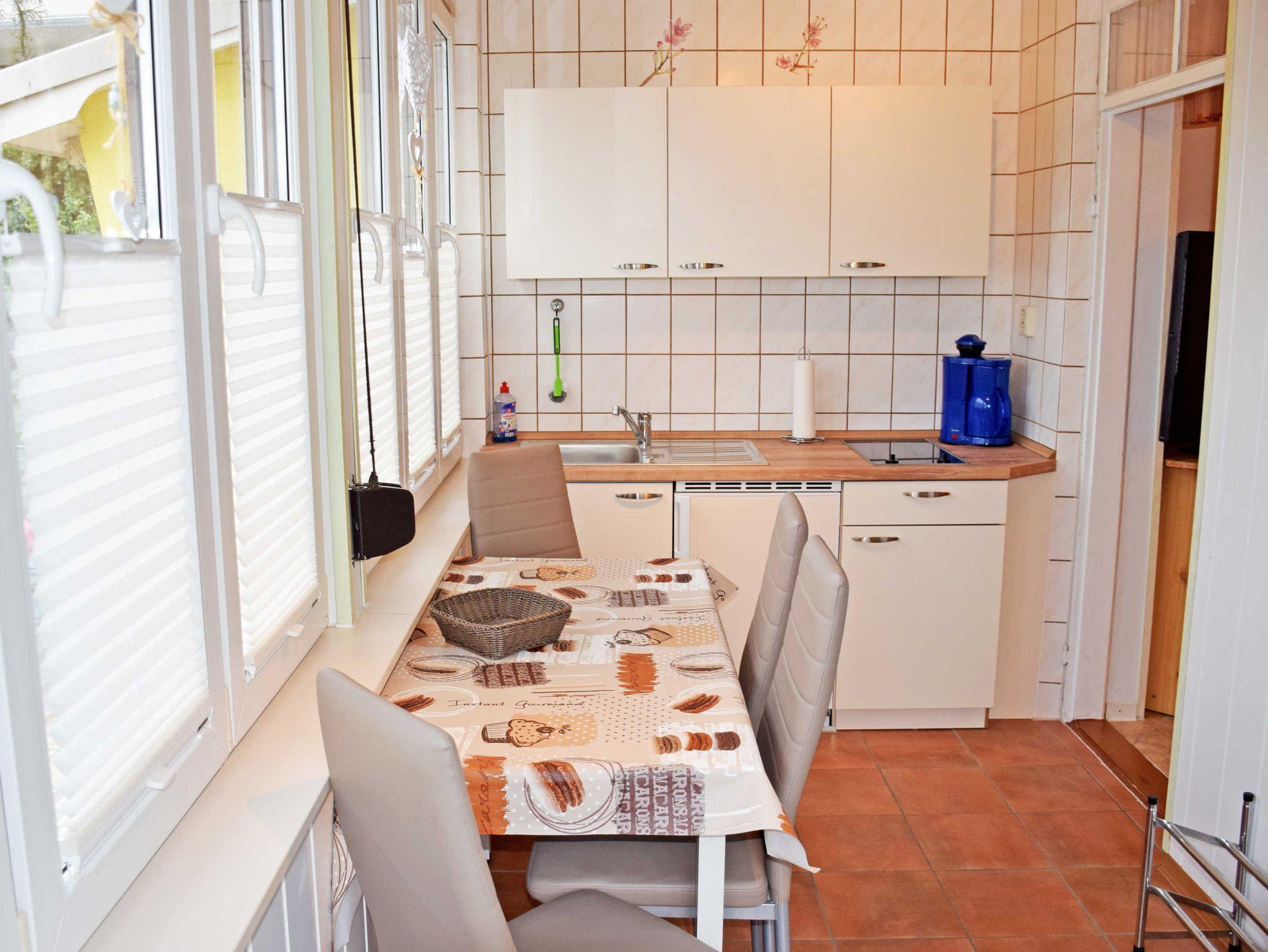 Selbstverständlich hat diese Ferienwohnung ein Bad mit Dusche und WC und sowie eine kleine Küche mit Esstisch und Stühlen. Zur Küchenausstattung gehören Herd, Spüle, Kühlschrank, Kaffeemaschine, Wasserkocher und Toaster. Zu dieser Ferienwohnung gehört auch eine mit bequemen Gartenmöbeln ausgestatte Terrasse. Hier können Sie laue Sommerabende genießen oder mit dem von uns bereitgestellten Grill einen gemütlichen Grillabend veranstalten.