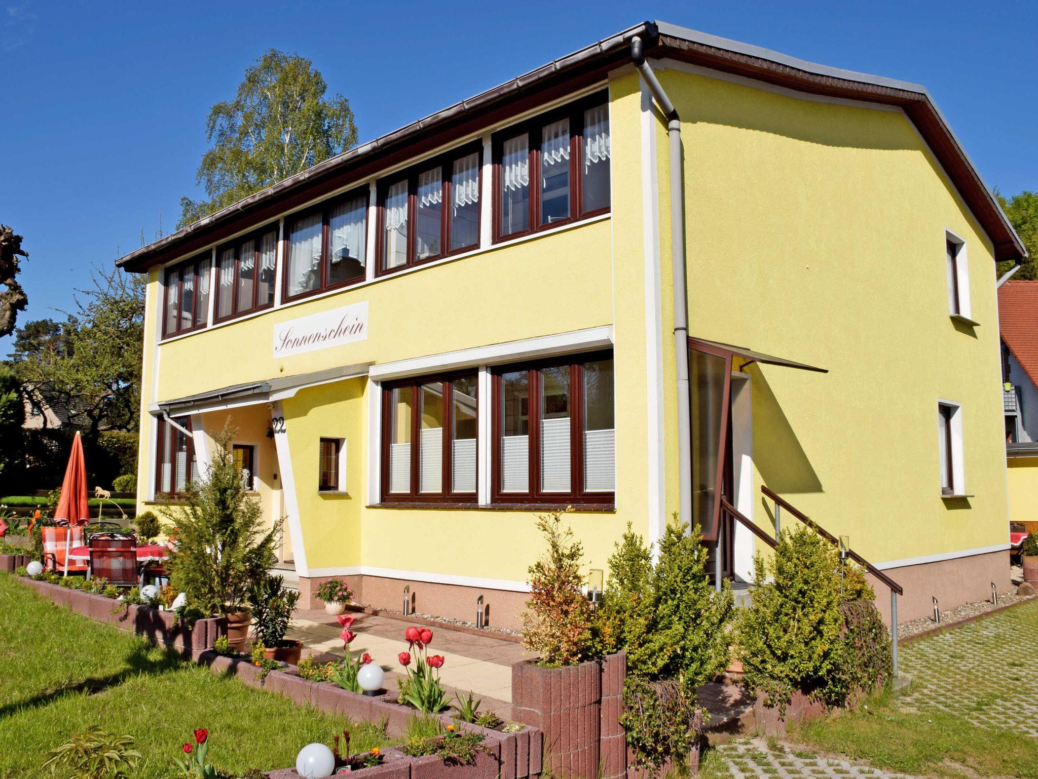 Zum Haus Sonnenschein gehören drei verschiedene, modern und freundlich eingerichtete Ferienwohnungen für 2 bis 5 Gäste (mit Dusche/WC, Küchenzeile). Diese verfügen jeweils über separate Wohnungseingänge. Auf dem Grundstück befinden sich eine kleine Wiese, Bäume und eine Terrasse mit Sitzmöbeln, die von den Gästen genutzt werden können. Hier steht auch ein Grill zur Verfügung. Gern vermitteln wir Ihnen auch Fahrräder zum Ausleihen.