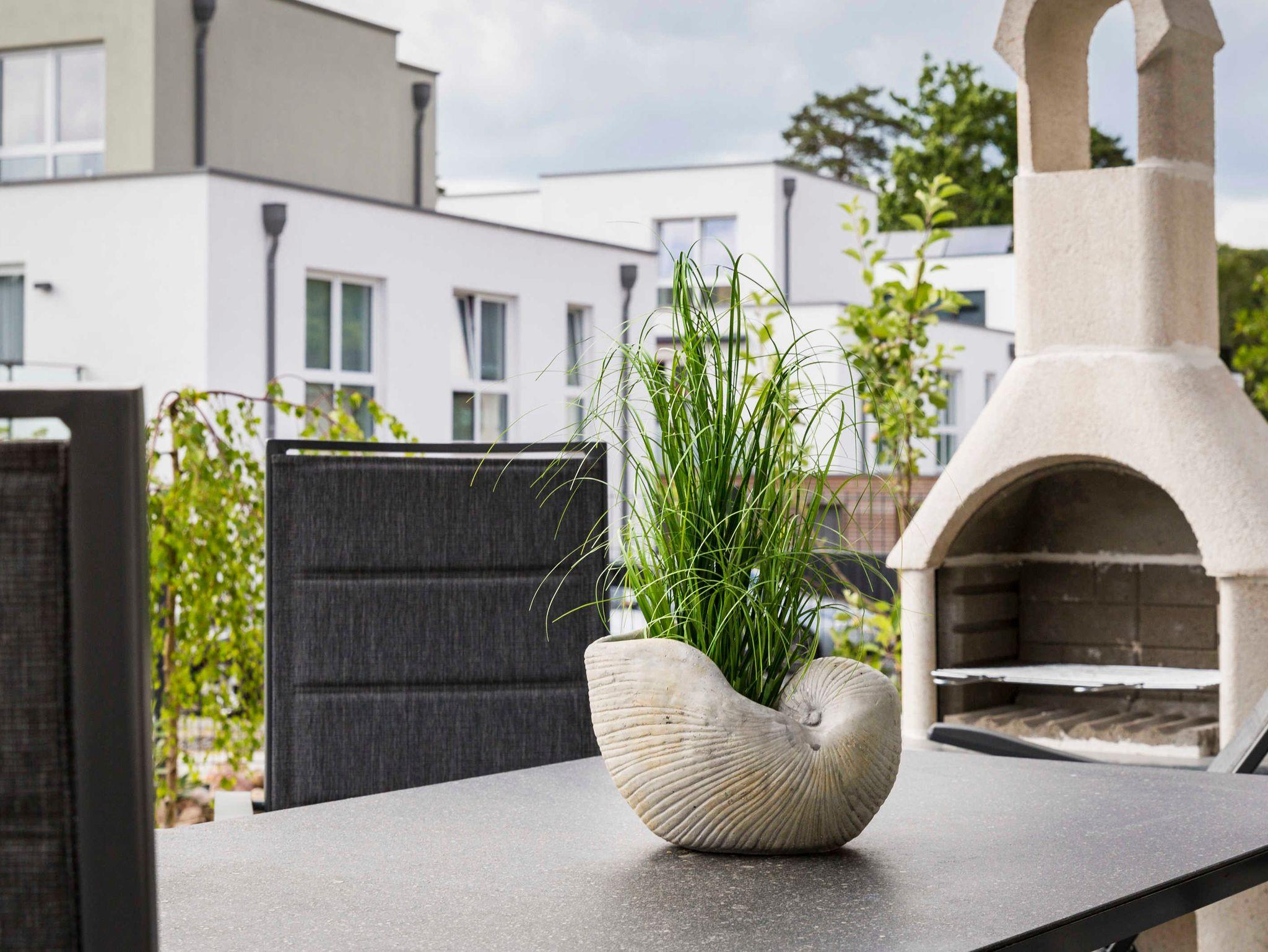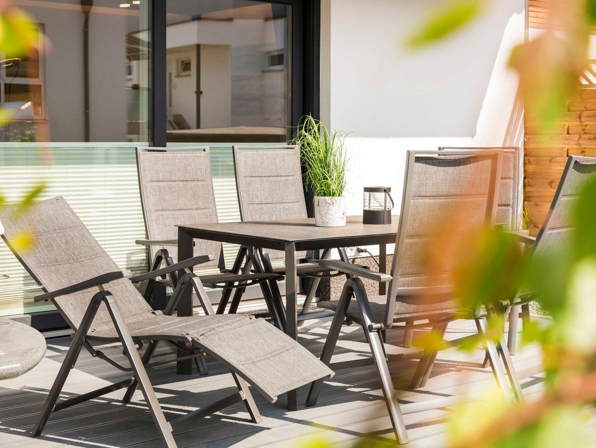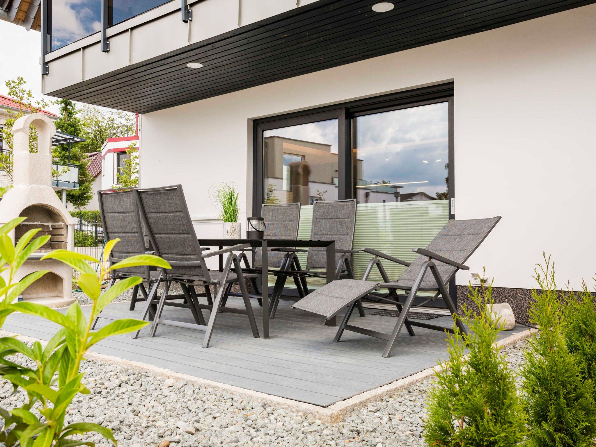 • Terrasse mit Gartenmöbeln und Grillkamin