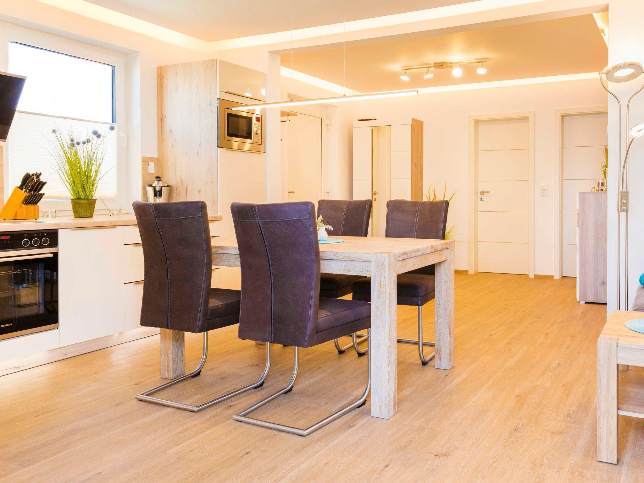 Im angrenzenden Essbereich haben bis zu 5 Personen auf bequemen Schwingstühlen ausreichend Platz.