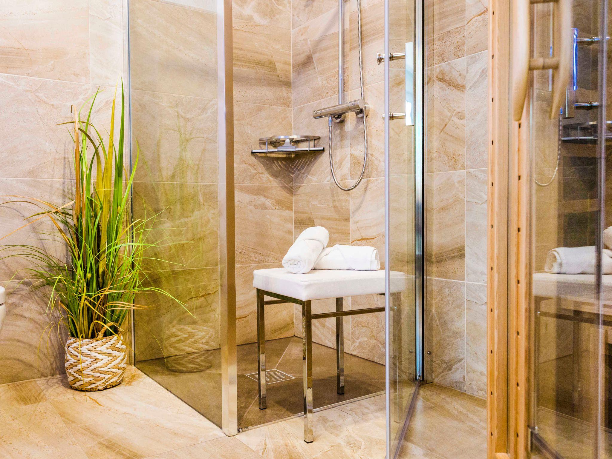 Das Bad hat eine ebenerdige Dusche mit zusätzlicher Regendusche und Echtglasabtrennung.