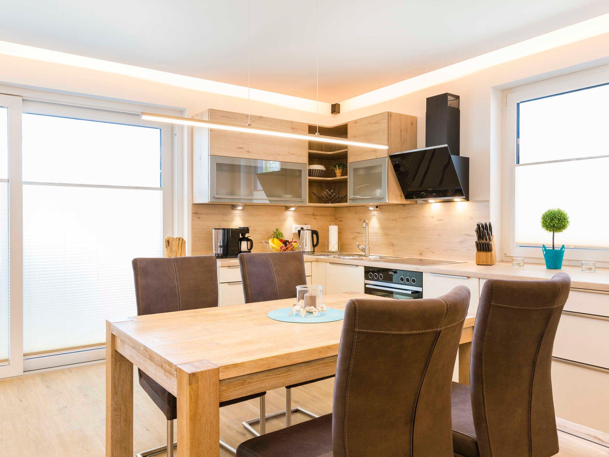 Die perfekt geplante Küche ist mit einem großen Kühlschrank mit Gefrierteil, einem Geschirrspüler, einem Backofen, einem Cerankochfeld sowie einer Mikrowelle ausgestattet.