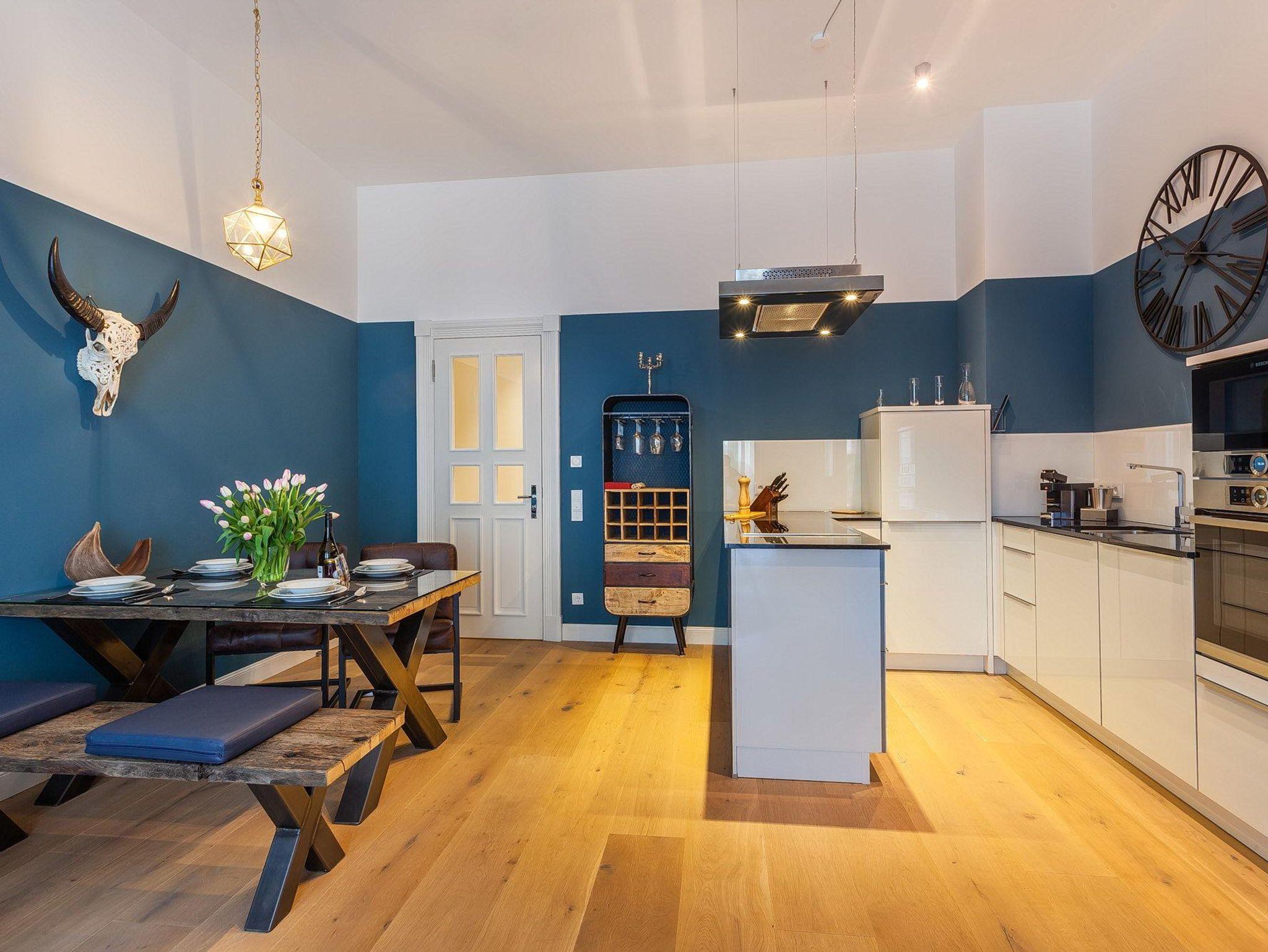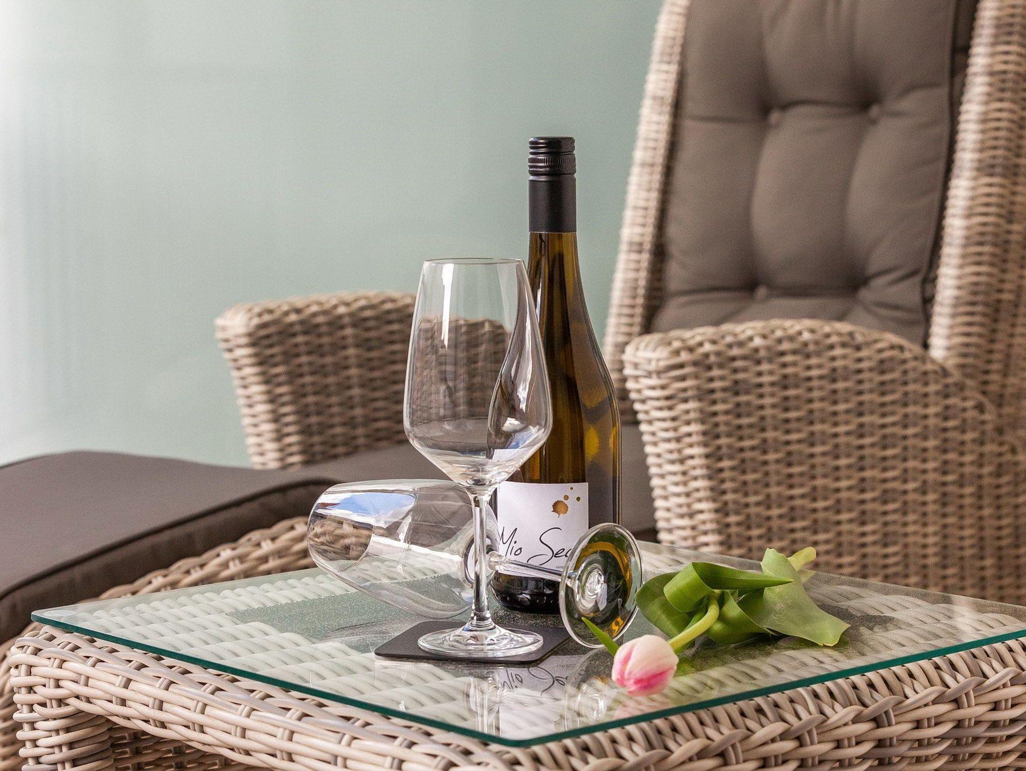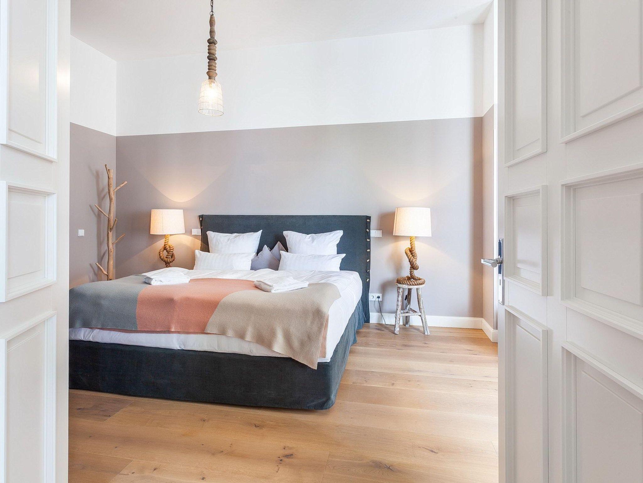 Die Ferienwohnung [at] HOME verspricht viel. Es lädt durch seine überdachte Loggia, bequemen Gartenmöbel und einem traumhaften seitlichen Meerblick zum Verweilen ein. Das 90 qm große Appartement überzeugt durch den offenen Wohnbereich und eine hochwertige Einbauküche. Das Schlafzimmer lädt mit seinem 180x200 cm großen Boxspringbett zum Träumen ein. Hier besteht die Möglichkeit einer Aufbettung zur dritten Person durch ein separates Boxbett (90x200 cm). Selbstverständlich lässt das angrenzende Badezimmer mit bodentiefer Dusche und Badewanne keine Wünsche offen.