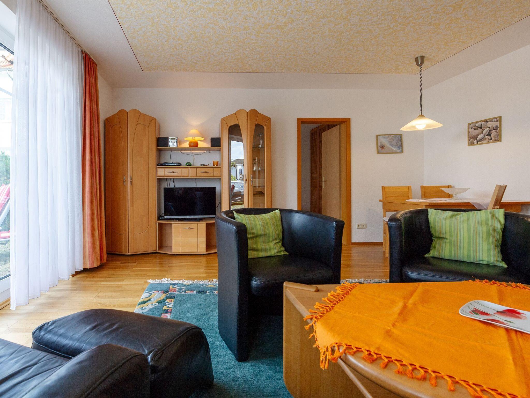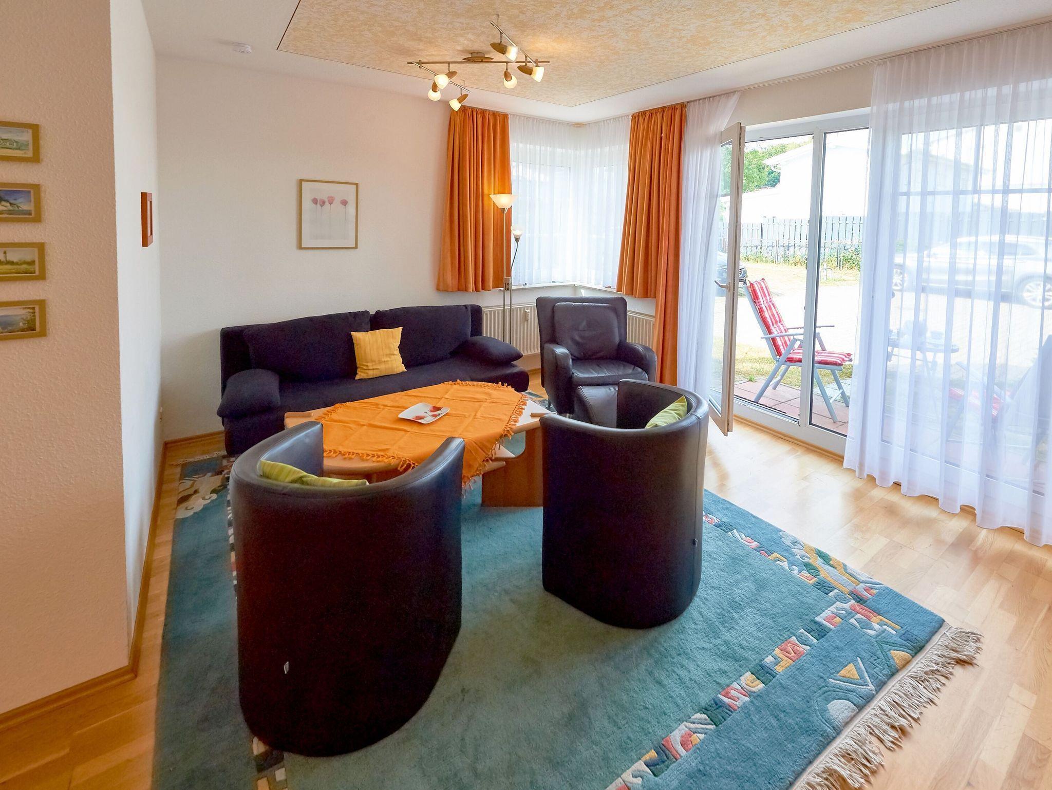 Über den Flur mit der Garderobe gelangen Sie in das kombinierte Wohn-/Schlafzimmer Ihres Urlaubsdomizils, das mit einem ausklappbaren Schlafsofa (Aufbettungsmöglichkeit für zwei Personen), bequemen Sesseln, einem Esstisch für 4 Personen sowie einem Fernseher nebst CD-/DVD-Player und einer Buchauswahl ausgestattet ist. W-LAN ist selbstverständlich kostenfrei verfügbar. Dem Wohnbereich vorgelagert ist die Terrasse, für die ein Tisch mit zwei Stühlen sowie eine Relaxliege zur Verfügung stehen.