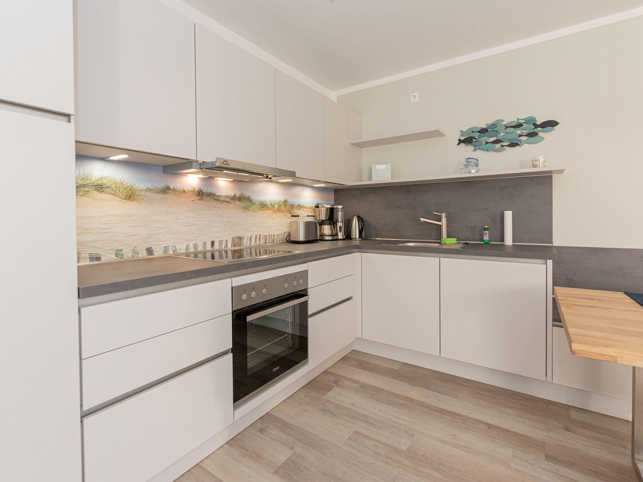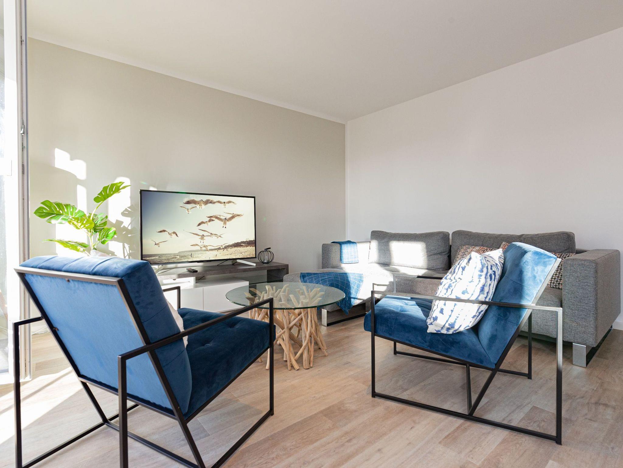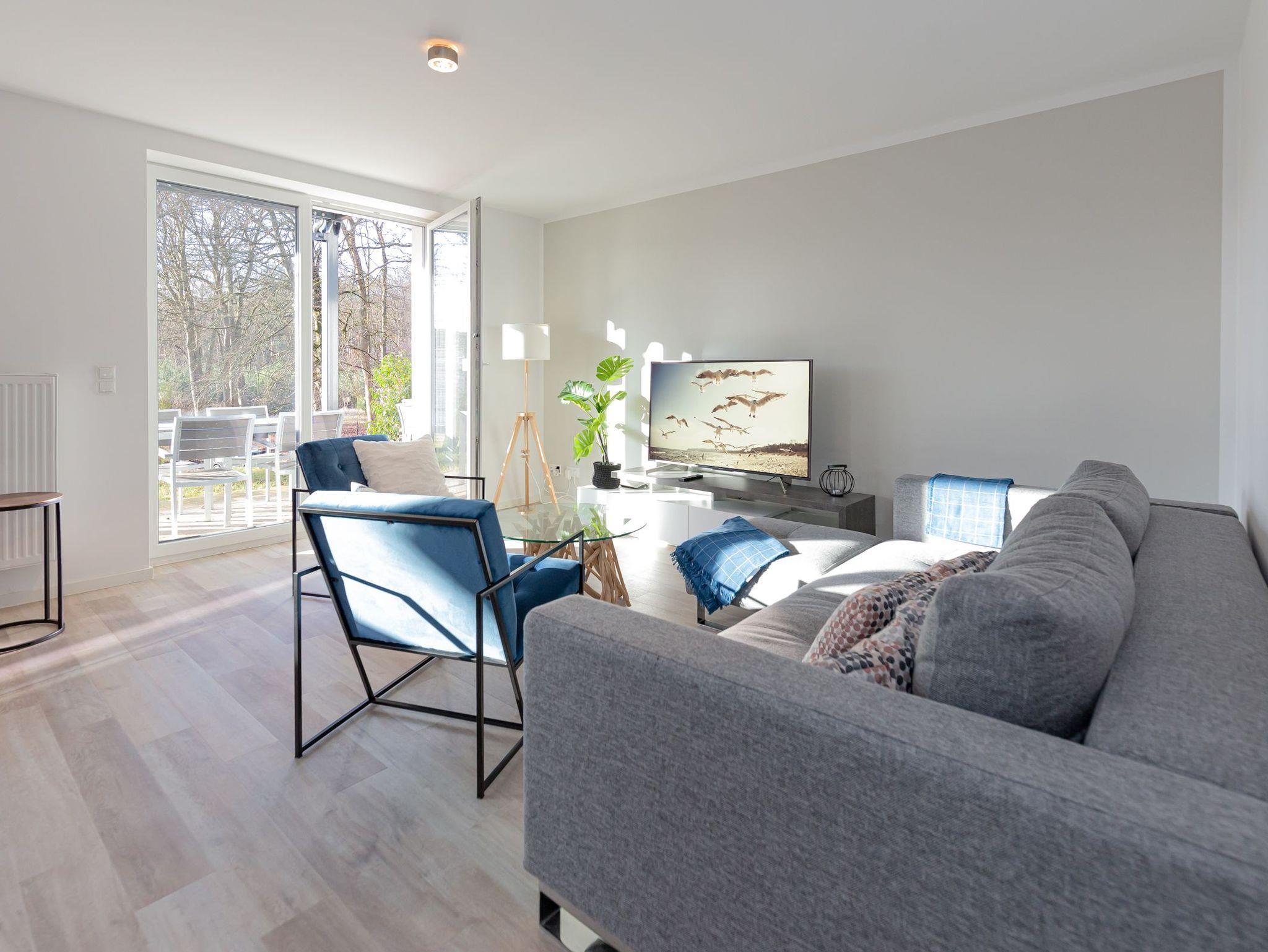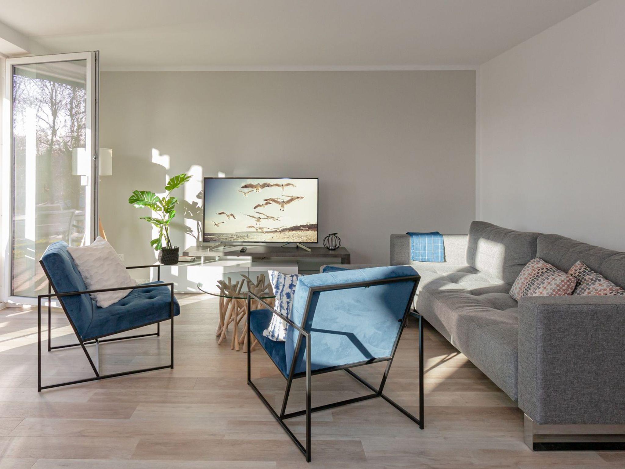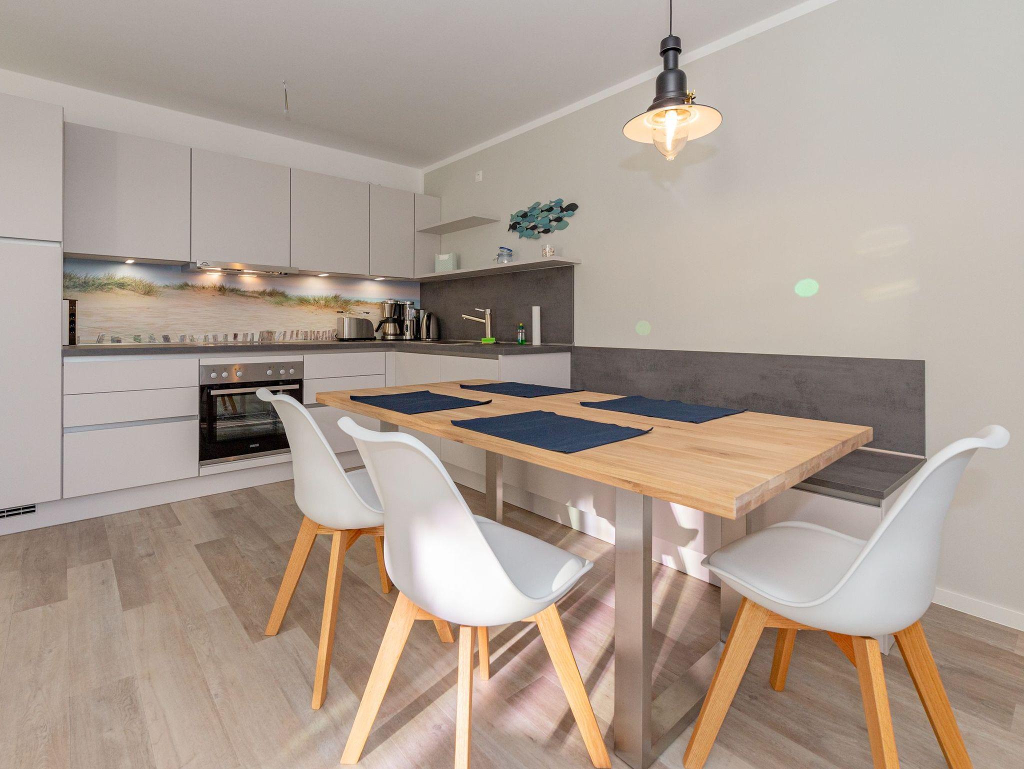 Betreten Sie das große Wohnzimmer mit dem angrenzenden Essbereich und der offenen Küche. Genießen Sie dank den großen Terrassenfenstern die Rügener Sonne beim ausgedehnten Frühstück. Die gemütliche Couchgarnitur stellt eine komfortable Aufbettung für bis zu 2 weitere Personen dar. Ein Smart-TV und der kostenfreie WLAN-Zugang runden das moderne Gesamterlebnis ab. Für die kleinen Mitreisenden stehen eine Spielesammlung, diverse Kartenspiele, ein Kinderreisebett und ein Hochstuhl zur Verfügung.