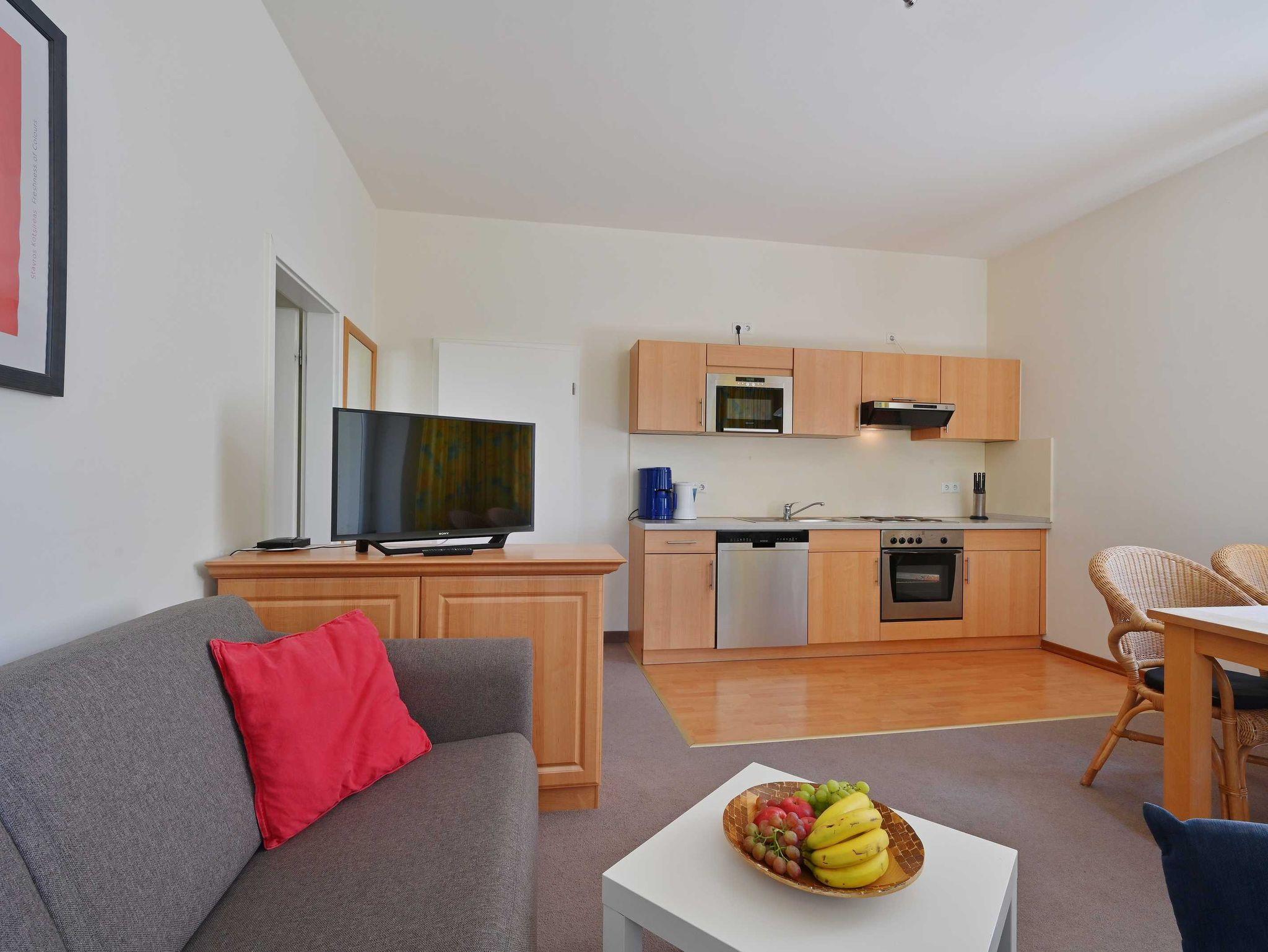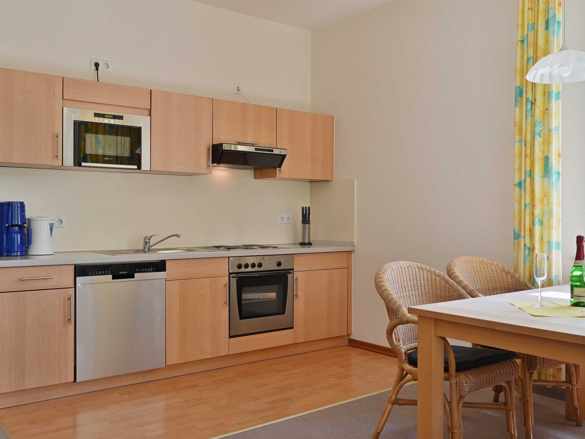 Ein Doppelbett, zwei Einzelbetten, eine Doppelschlafcouch, ein Balkon, voll ausgestattete Küchenzeile (mit Geschirrspüler, Mikrowelle, Backofen, Tiefkühlfach), Bad (Badewanne mit Dusche, WC), Fahrstuhl, kostenlose Sauna-Nutzung, Kinderbett und Kinderstuhl auf Anfrage kostenlos stellbar, kostenlose W-LAN-Nutzung, Münzwaschmaschine und Trockner, Parkplatz (entgeltlich), Hunde und Haustiere (entgeltlich) auf Anfrage möglich, Rauchen im gesamten Haus nicht erlaubt (aber auf dem Balkon möglich).