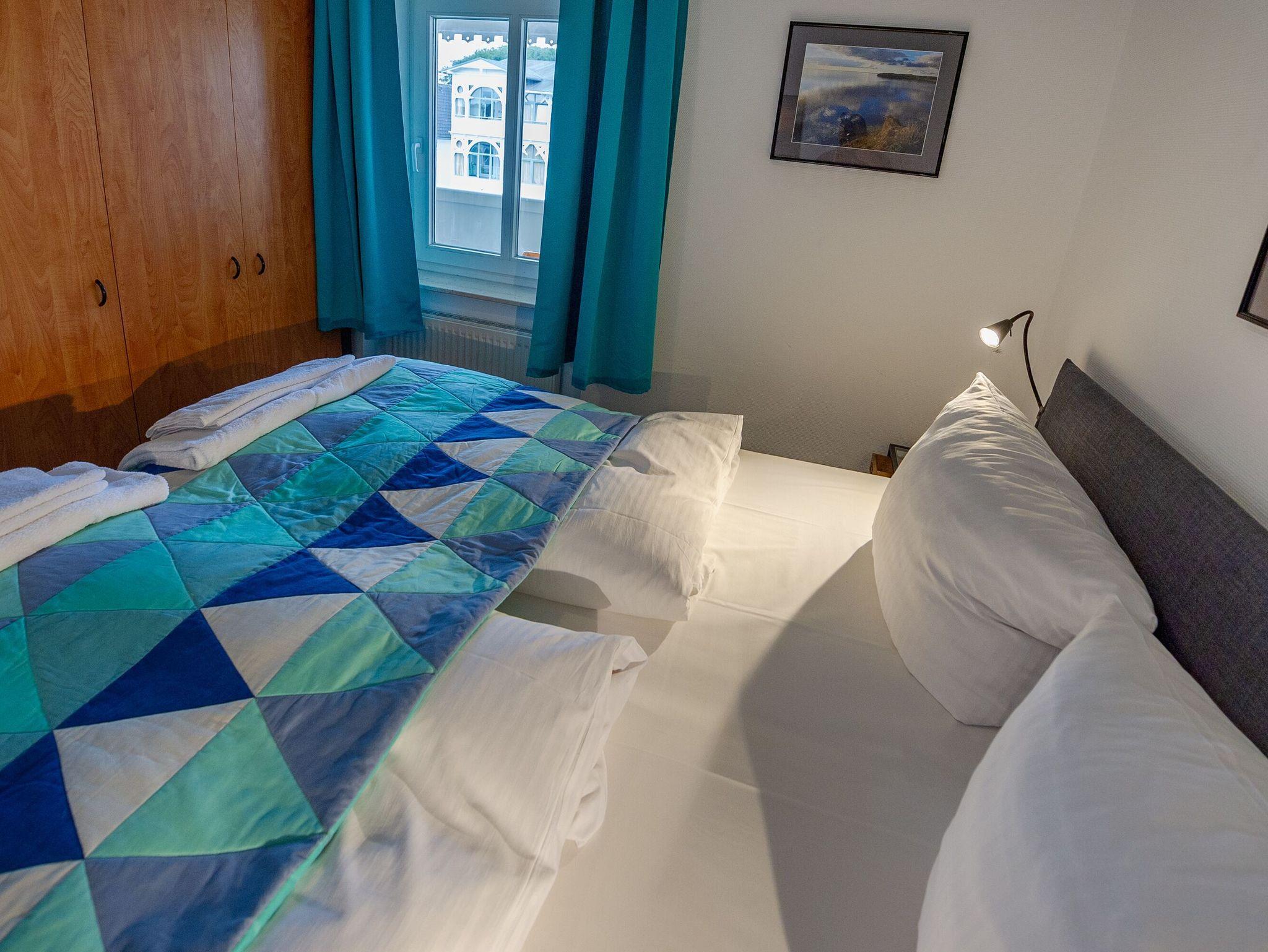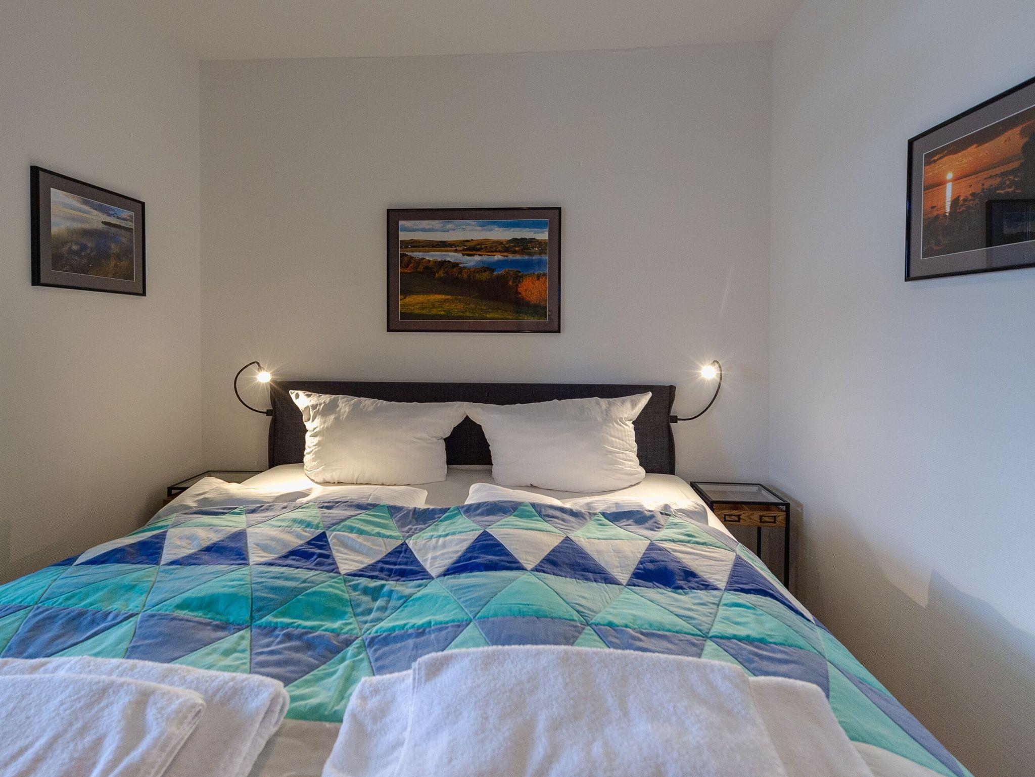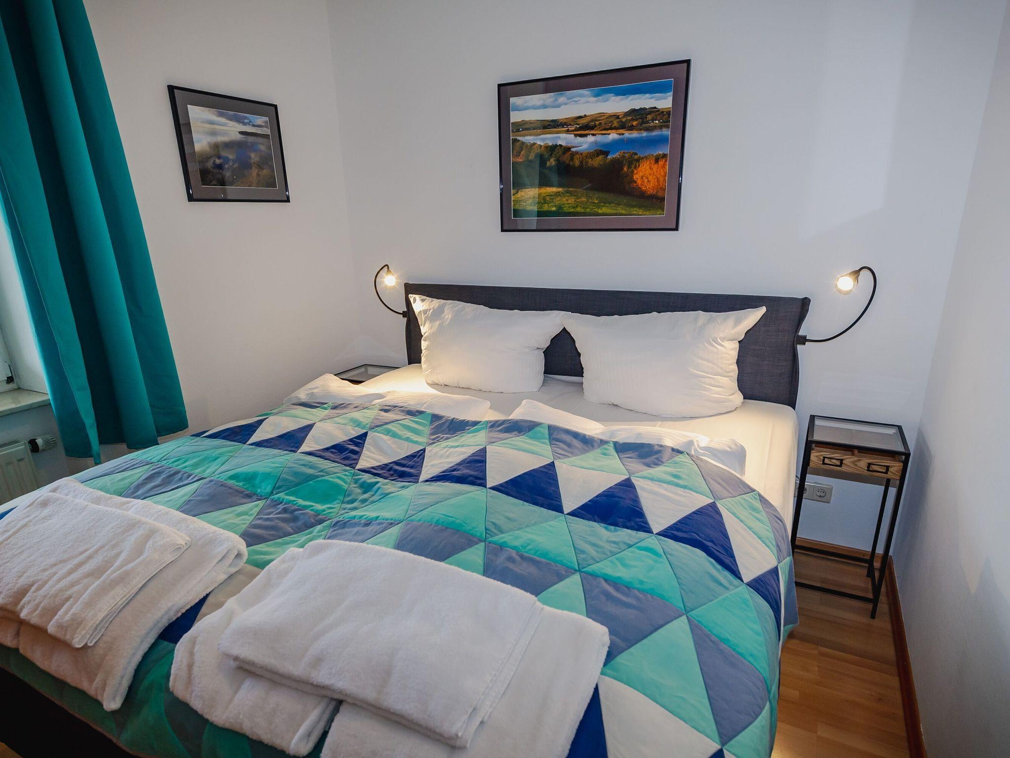 Im separaten Schlafzimmer erwarten Sie ein bequemes Doppelbett und ein Kleiderschrank für Ihre Urlaubsgarderobe. Gleich nebenan finden Sie das Badezimmer, ausgestattet mit Dusche/WC, Waschbecken, Spiegel und Fön.