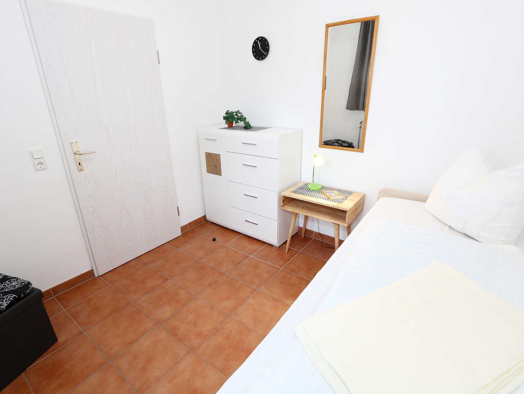 Die 3 Raum-Nichtraucher-Wohnung im 1. OG des ?Haus Holstein? liegt am erweiterten Kurpark, direkt am Friedensberg mit hervorragender Wohnqualität und verfügt über ca. 74 qm Wohnfläche. Der geräumige Flur ist mit einer Garderobe, einem Schuhschrank sowie einer kleinen Sitzbank ausgestattet. Der 11 m² große, überdachte und bestuhlte Balkon (Süden) ist vom Wohnbereich aus begehbar. Die Wohnung, welche für 2 bis max. 5 Erwachsene ausgestattet ist, besteht aus einem Wohnbereich mit einer Couch (Aufbettung für zwei Personen, 1,60 m x 2,00 m) mit massivem Couchtisch, einer Stehlampe sowie einer Vitrine, kleiner Schreibtisch und einem Sideboard. Des Weiteren befindet sich im Wohnbereich ein Smart-TV, Blu-Ray-Player, Mini-Stereo-Anlage mit Bluetooth und USB-Anschluss und Internet/WLAN. Der Internetzugang (WLAN) ist für Sie inklusive. Die großzügige Essecke umfasst einen modernen Tisch und sechs dazugehörige Stühle. Die separate Küche ist ausgestattet mit einer Einbauküche, bestehend aus einem Kühlschrank mit Gefrierfach, einen Backofen mit 4 Zonen Induktionskochfeld, einer Dunstabzugshaube, einem Geschirrspüler, einer Mikrowelle, einer Kaffeemaschine, einem Toaster, einem Eierkocher, einem Handmixer, einem Wasserkocher sowie viele kleine Küchenutensilien. Im Schlafzimmer befindet sich ein Doppelbett (1,80 m x 2,00 m) mit einer Komforthöhe über 60 cm, Kaltschaum-Wendematratzen H2/H3, zwei Nachttischablagen und ein großer Kleiderschrank mit Spiegel. Im kleinen Schlafzimmer, welches Sie vom 1. Schlafzimmer betreten, befindet sich eine komfortable Duo-Liege (1,00m x 2,00m, H2/H3) sowie zwei Schubkästen und einer Kommode. Das innenliegende Bad ist mit einem Waschplatz mit beleuchtetem Spiegel, einer Dusche mit flachem Einstieg, Fön, WC und Handtuchheizkörper ausgestattet. Im Abstellraum finden Sie kleine Helfer wie einen Staubsauger, ein Bügeleisen mit Bügelbrett und Wäscheständer für den Balkon. Alle Räumlichkeiten sind in der Wohnung gefliest und haben jeweils ein Insektenschutzgitter. Für unsere kleinen Gäste steht ein Kinderreisebett (mit Zusatzmatratze) zur Verfügung. Haustiere sind nicht erlaubt. Ein überdachter PKW-Stellplatz Nr. 11 (max. 2 m Höhe) befindet sich direkt unterm Haus. Im Gemeinschaftskeller stehen Ihnen eine Münzwaschmaschine und ein Münztrockner zur Verfügung. Abstellmöglichkeiten für Fahrräder sind gegeben. Die Erstausstattung eines Wäschepaketes (komplette Bettwäsche, 1 Duschhandtuch, 1 kleines Handtuch) können Sie bis 14 Tage vor Anreise gegen einen Aufpreis dazu buchen oder durch eigene ergänzen. Ab 2 gebuchten Paketen erhalten Sie einmalig 1 Geschirrhandtuch und 1 Duschvorleger hinzu.