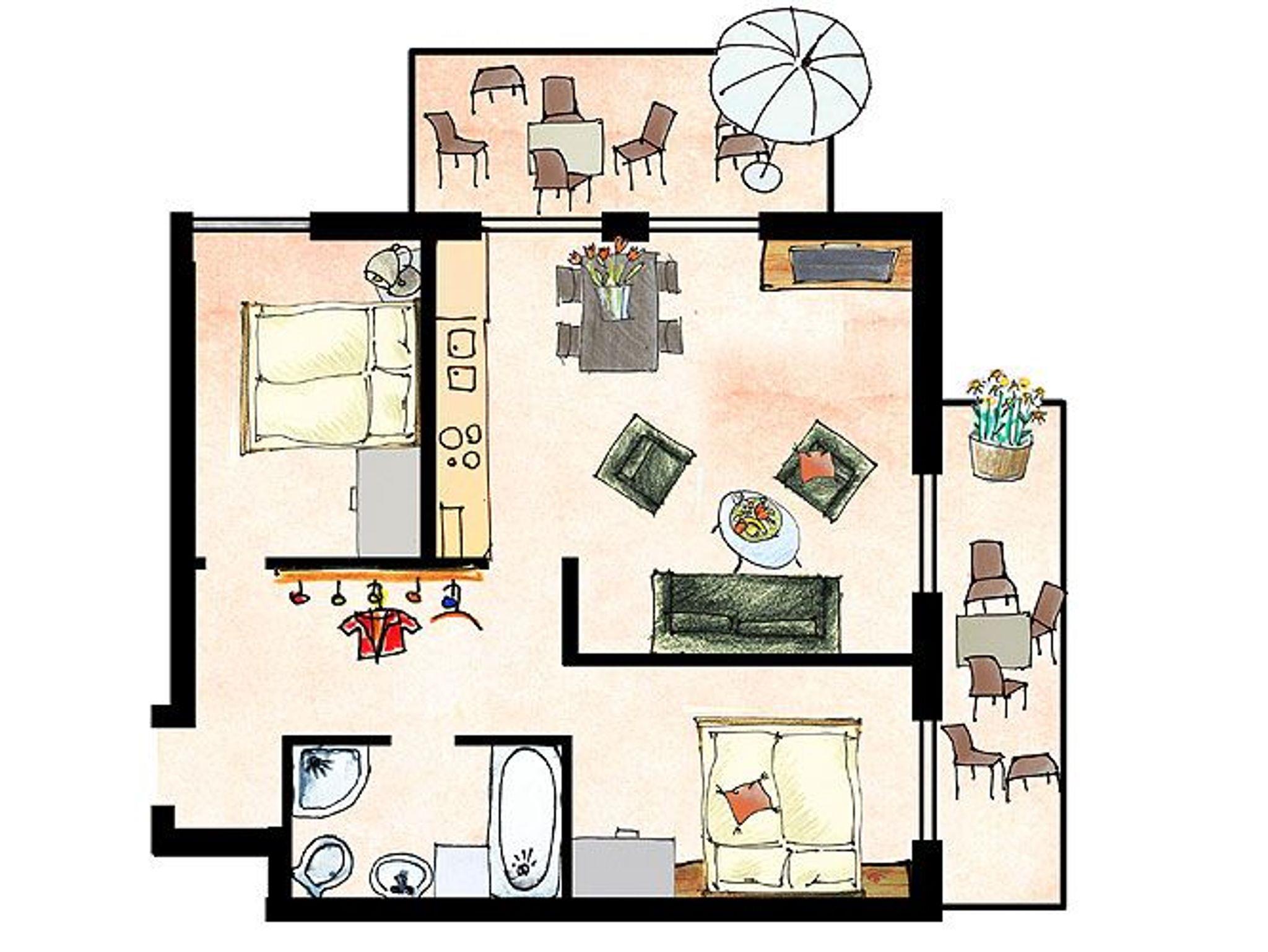 Ihr 3-Raum-Appartement besteht aus einem kombinierten Wohn-/Esszimmer, zwei Schlafzimmern mit komfortablen Doppelbetten (1,80 x 2,00 m bzw. 1,60 x 2,00 m), einer geräumigen Diele sowie einem Badezimmer mit Dusche/WC, Badewanne, beleuchtetem Waschtisch, Fön und beheizbarem Handtuchtrockner.