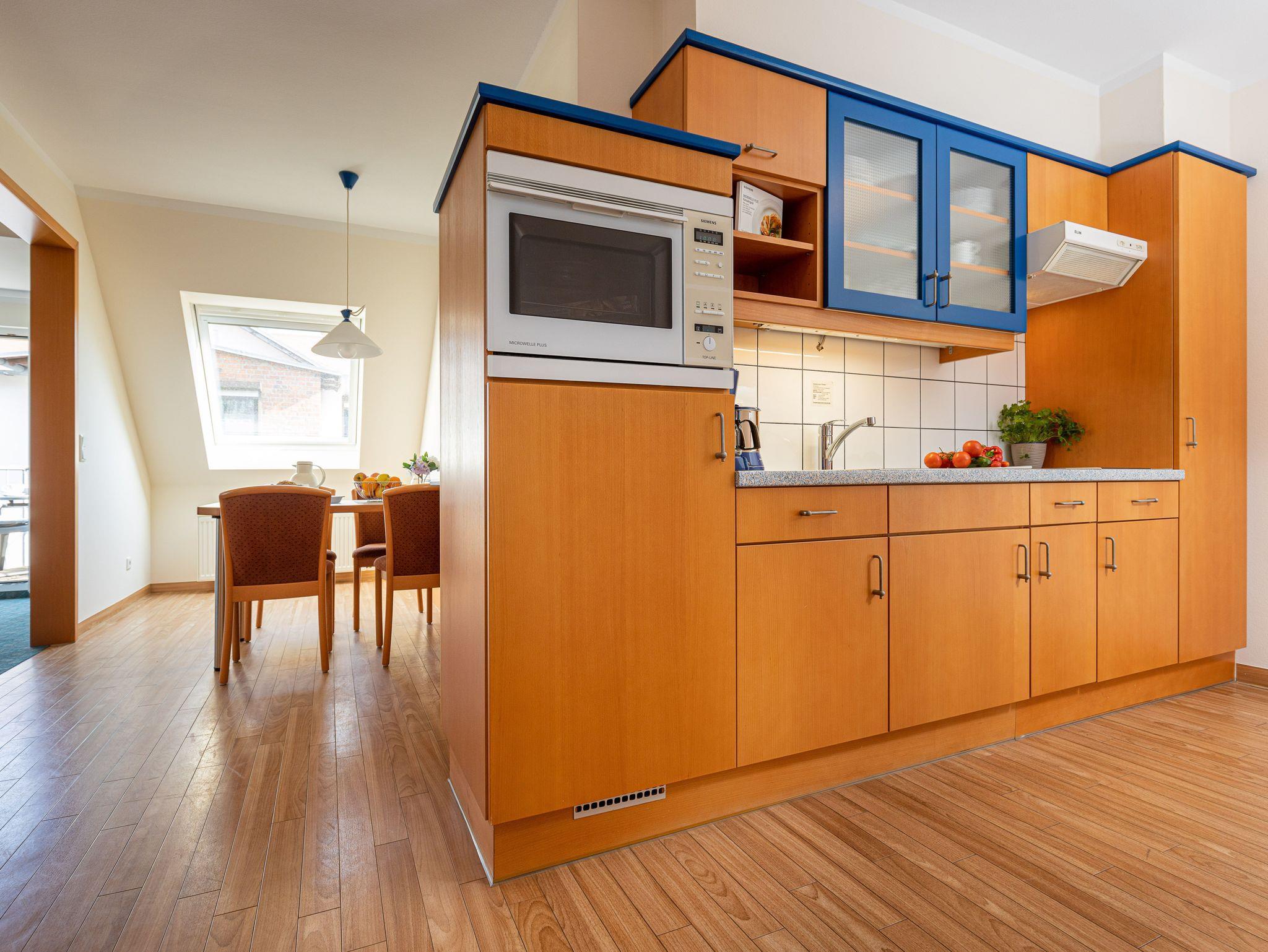 Die Küchenzeile ist mit einem Kühlschrank, einem Ceranfeld und einem Backofen/Mikrowelle ausgestattet. Ebenso finden sich hier alle nötigen Küchenkleingeräte (Wasserkocher, Kaffeemaschine, Toaster..).