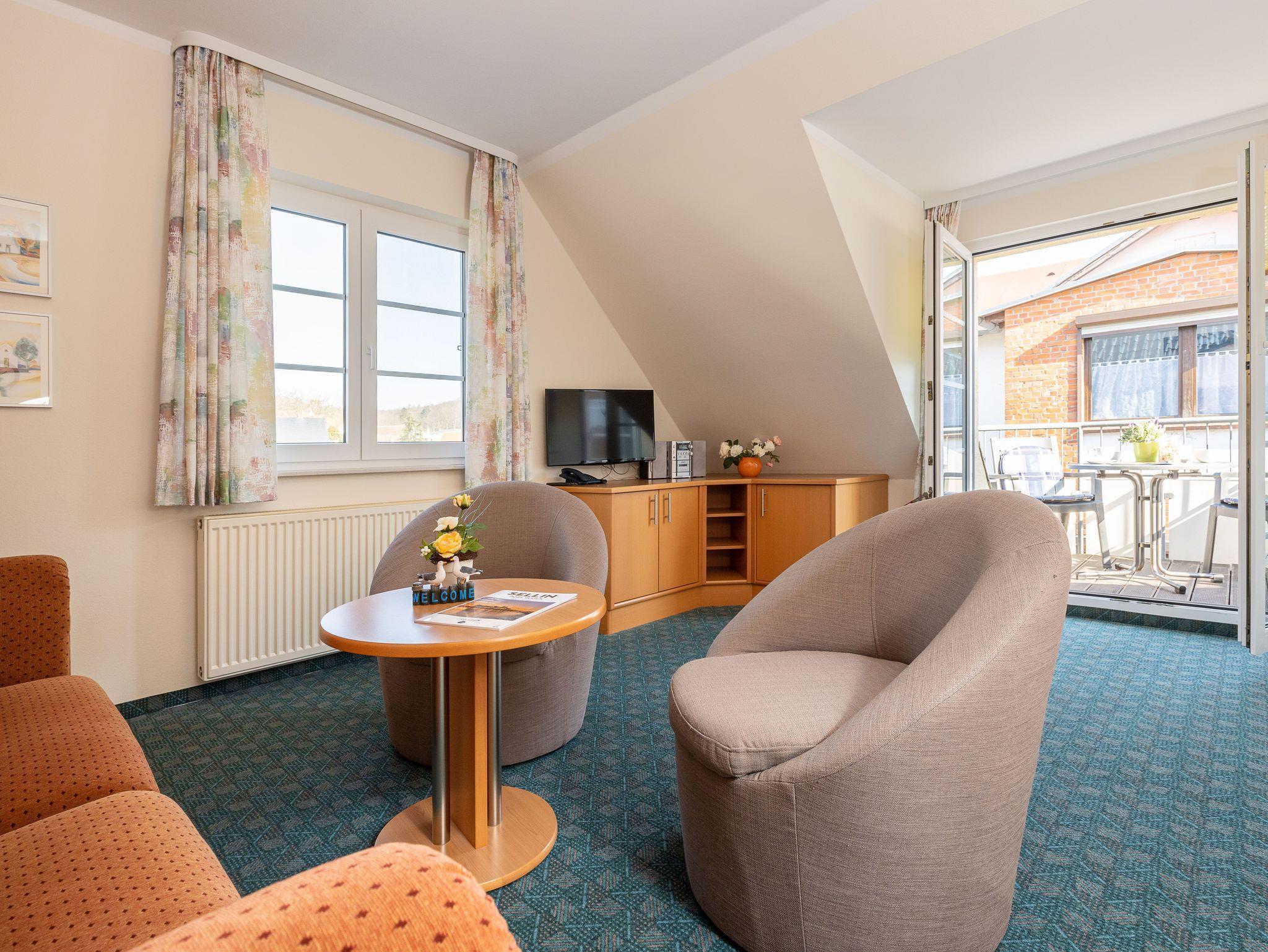Das helle Wohnzimmer verfügt über eine Couchgarnitur, einen TV und einen kostenfreien WLAN-Zugang. Zudem erreicht man von hier aus den sonnigen Balkon inkl. Balkonmöbel.
