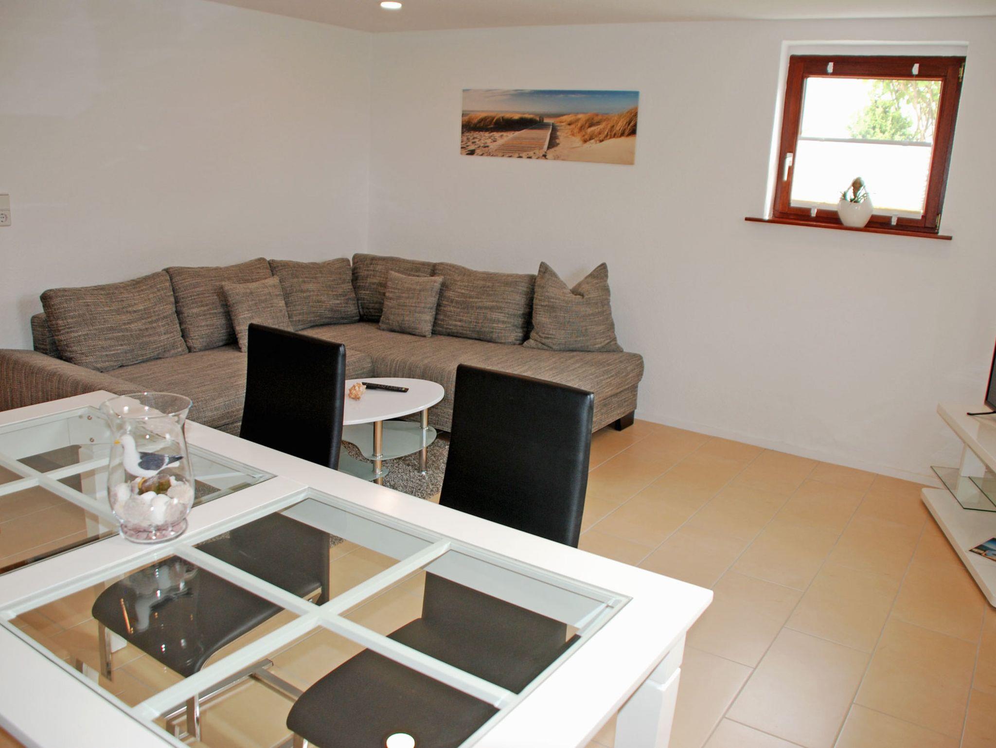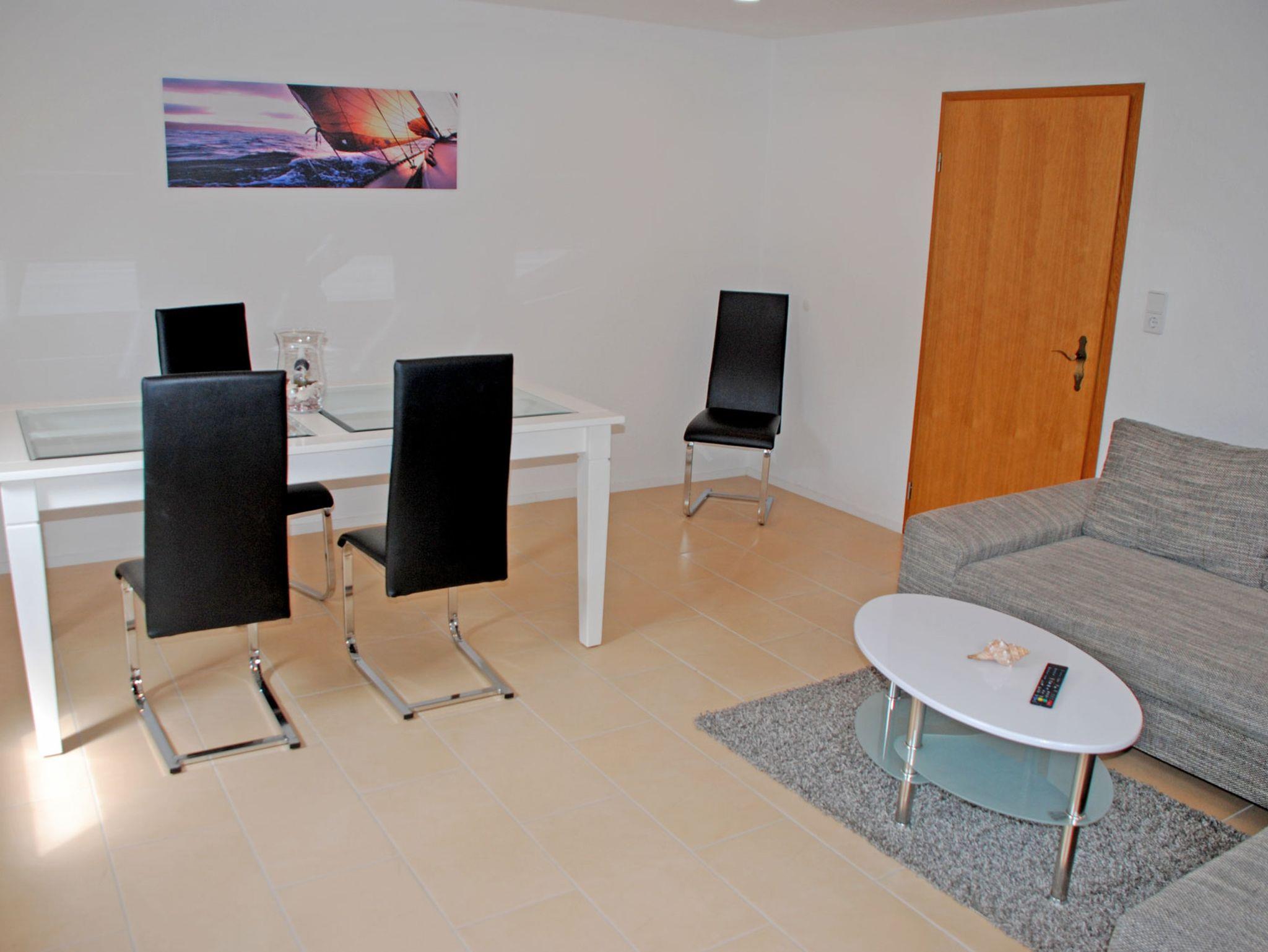 Diese modern eingerichtete Ferienwohnung liegt im Soutterain eines Doppelhauses und bietet auf 65 qm großzügig Platz für max. 3 Erwachsene sowie 2 Kinder bis 17 Jahre und hat Internet - WLAN. Über den separaten Eingang gelangen Sie in den großzügigen Flur mit Garderobe, Spiegel und Kleiderschrank. Im großen, hellen Wohnzimmer stehen eine bequeme Polstersitzgruppe mit Tisch und Sesseln und ein Schrank mit Flachbild - TV - Gerät. Hier steht auch ein Esstisch mit Stühlen. Im großen Schlafzimmer stehen ein bequemes Doppelbett mit Nachttischen und Leselampen, ein Einzelbett sowie ein Kleiderschrank. Bei Bedarf kann im Wohnbereich die Couch für zwei Kinder bis 17 Jahre mit aufgebettet werden. Die separate, moderne Küche ist mit einem 2-Plattenherd, Geschirrspüler, Abzugshaube, Wasserkocher, Kaffeemaschine, Toaster und Kühlschrank komplett ausgestattet.