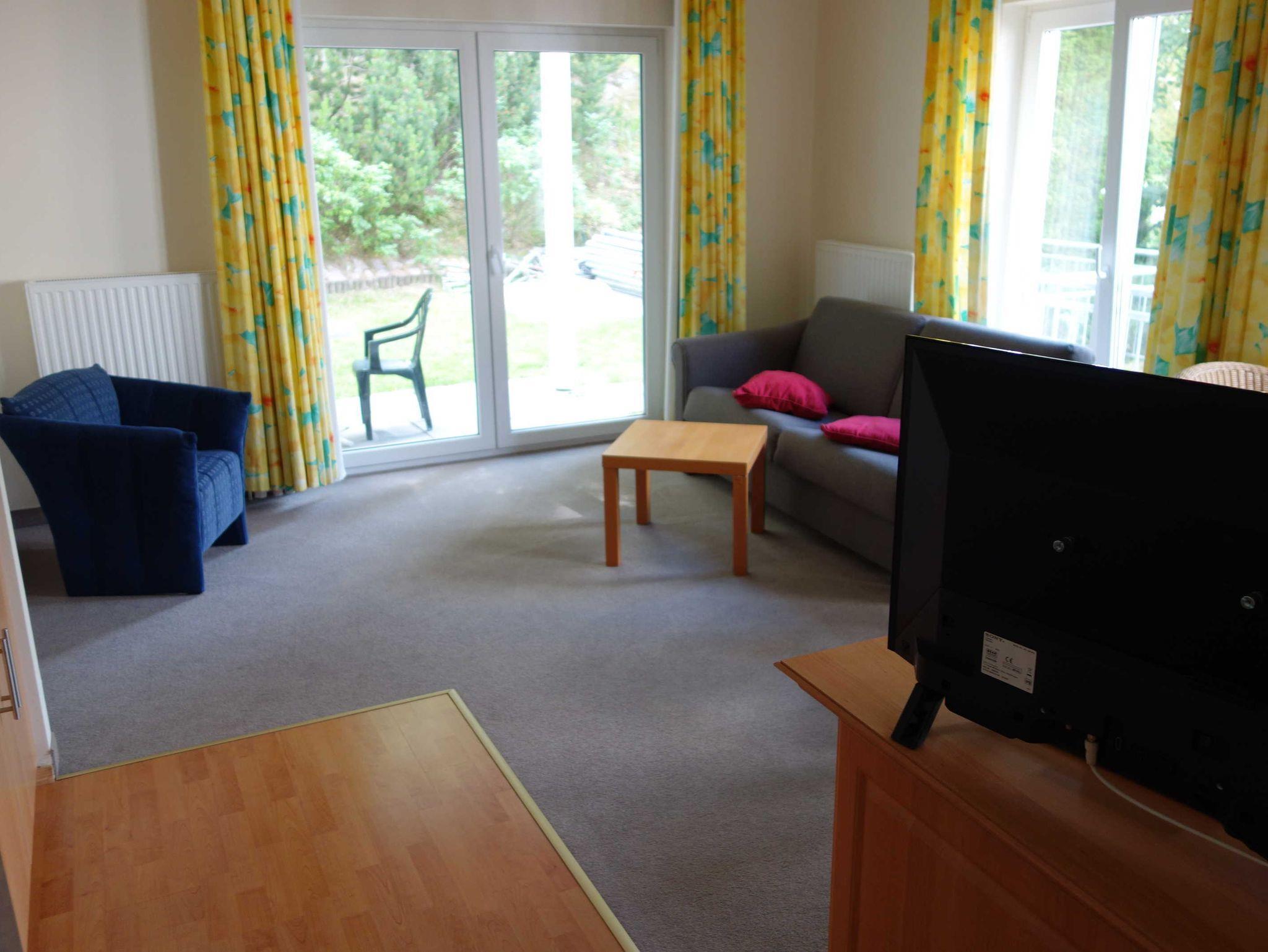 Ein Doppelbett, zwei Einzelbetten, eine Doppelschlafcouch, einen Balkon / Terrasse mit Gartenzugang, voll ausgestattete Küchenzeile (mit Geschirrspüler, Mikrowelle, Backofen, Tiefkühlfach), Bad (Badewanne mit Dusche, WC), Fahrstuhl in das 1. Obergeschoss, kostenlose Sauna-Nutzung, Kinderbett und Kinderstuhl auf Anfrage kostenlos stellbar, kostenlose W-LAN-Nutzung, Münzwaschmaschine und Trockner, Parkplatz (entgeltlich, bitte im Voraus telefonisch buchen), Hunde und Haustiere für 10 Euro pro Nacht auf Anfrage möglich, mehr Informationen unter Urlaub mit Hund. Das Rauchen ist im gesamten Haus nicht erlaubt (aber auf dem Balkon möglich).