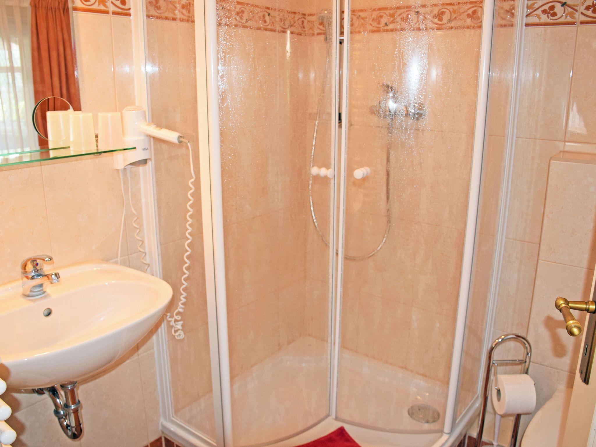 Das Bad verfügt über Dusche, Waschtisch und WC. Über eine kunstvoll gearbeitete Holztreppe gelangen unsere Gäste in das Obergeschoss. Die Eltern schlafen hier in einem Schlafzimmer mit bequemen Doppelbett mit Nachttischen und Leselampen, das Kind in einem extra Kinderschlafzimmer mit einem Einzelbett. In beiden Schlafzimmern stehen große Schränke.