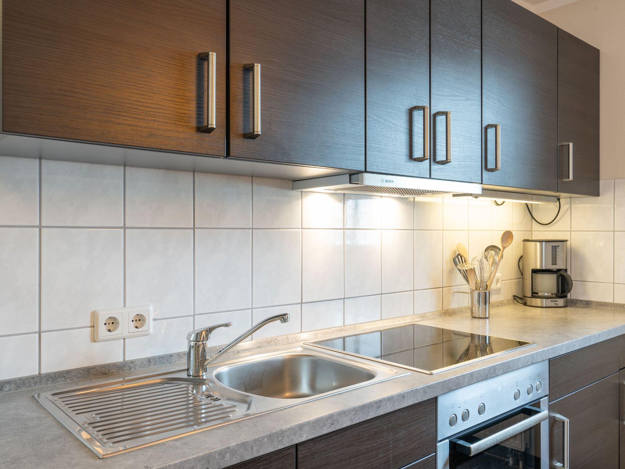 Die Ferienwohnung verfügt über kostenfreies WLAN und die Erstausstattung an Bettwäsche ist inklusive. Die beiden Schlafzimmer mit Verdunklung verfügen jeweils über ein Doppelbett, im Wohnzimmer befindet sich zusätzlich eine Doppelschlafcouch. Darüber hinaus verfügt die Ferienwohnung über ein Bad mit ebenerdiger Dusche sowie ein WC. Die voll ausgestattete, offene Küche mit Backofen, Mikrowelle, Geschirrspüler, Kaffeemaschine und Toaster lässt keine Wünsche offen. Ein Fernseher inkl. 3 Sky-Sender rundet die Einrichtung ab.