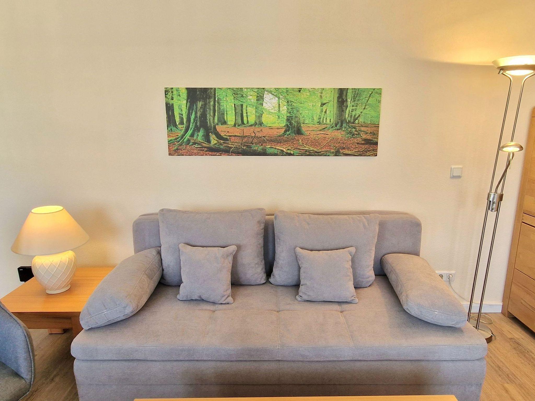 Die Ferienwohnung verfügt über kostenfreies WLAN und die Erstausstattung an Bettwäsche ist inklusive. Das Schlafzimmer mit Verdunklung verfügt über ein Doppelbett, im Wohnzimmer befindet sich zusätzlich eine Doppelschlafcouch. Darüber hinaus verfügt die Ferienwohnung über ein Bad mit Dusche/WC, Föhn und Kosmetikspiegel. Die voll ausgestattete, offene Küche mit Backofen, Mikrowelle, Geschirrspüler, Kaffeemaschine und Toaster lässt keine Wünsche offen. Zwei Fernseher inkl. 3 Sky-Sender runden die Einrichtung ab.