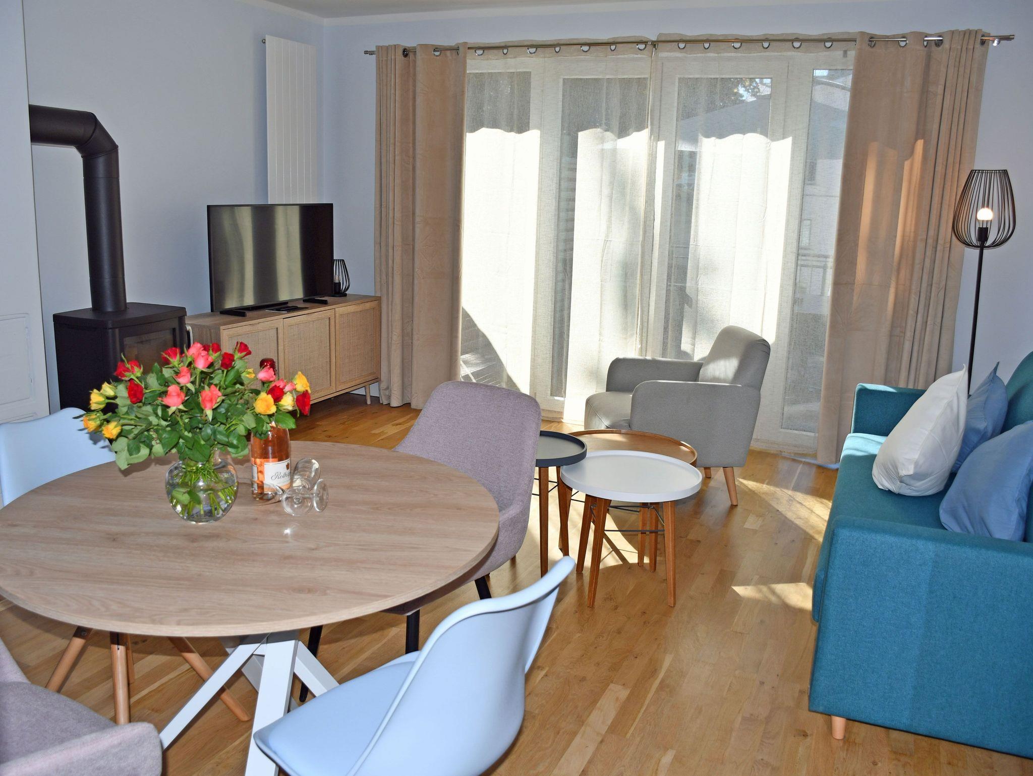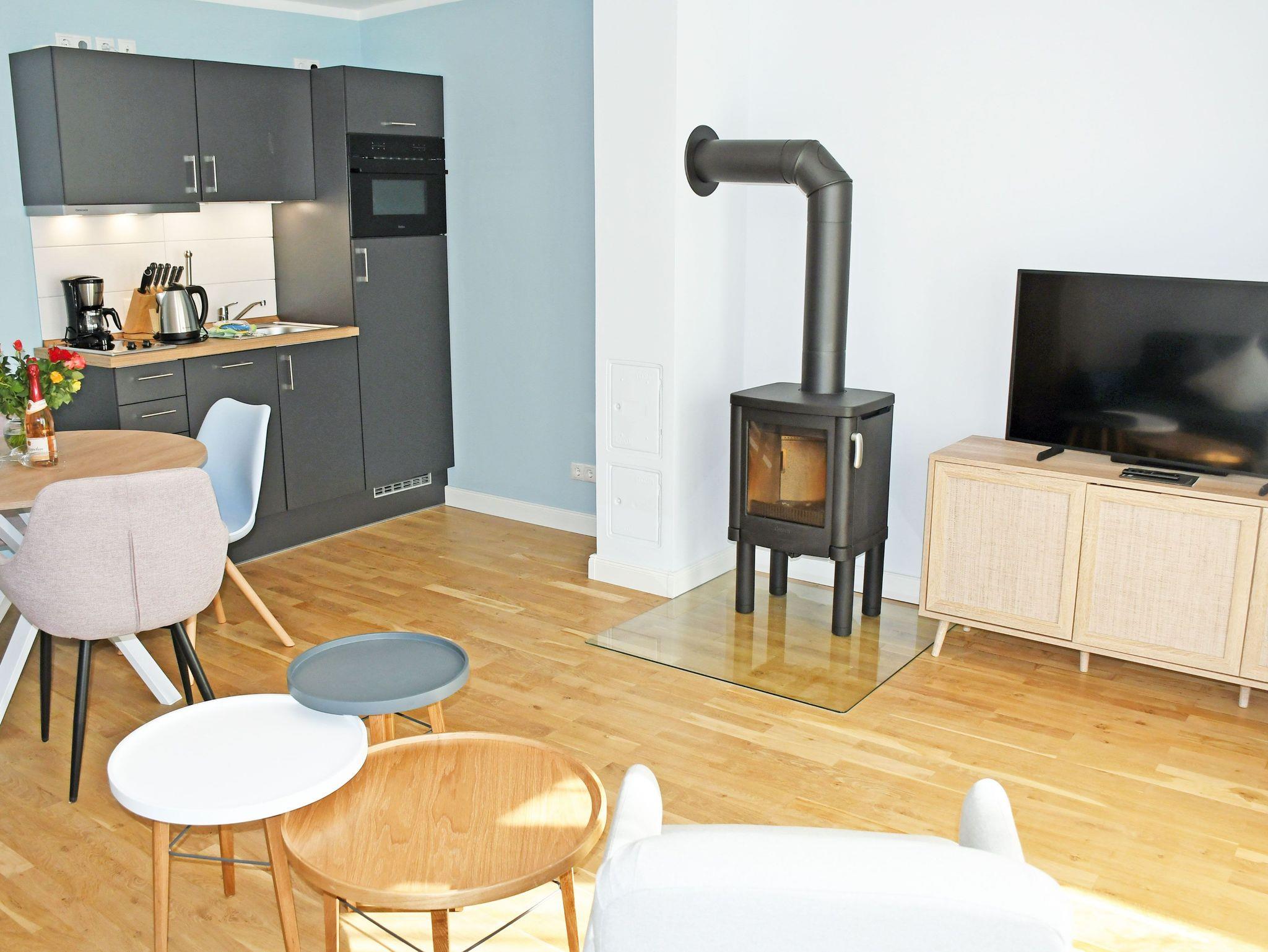 Moderne Ferienwohnung mit Kamin und Terrasse nahe Sellins Strand und Seebrücke, ideal für entspannte Tage im Ostseebad.